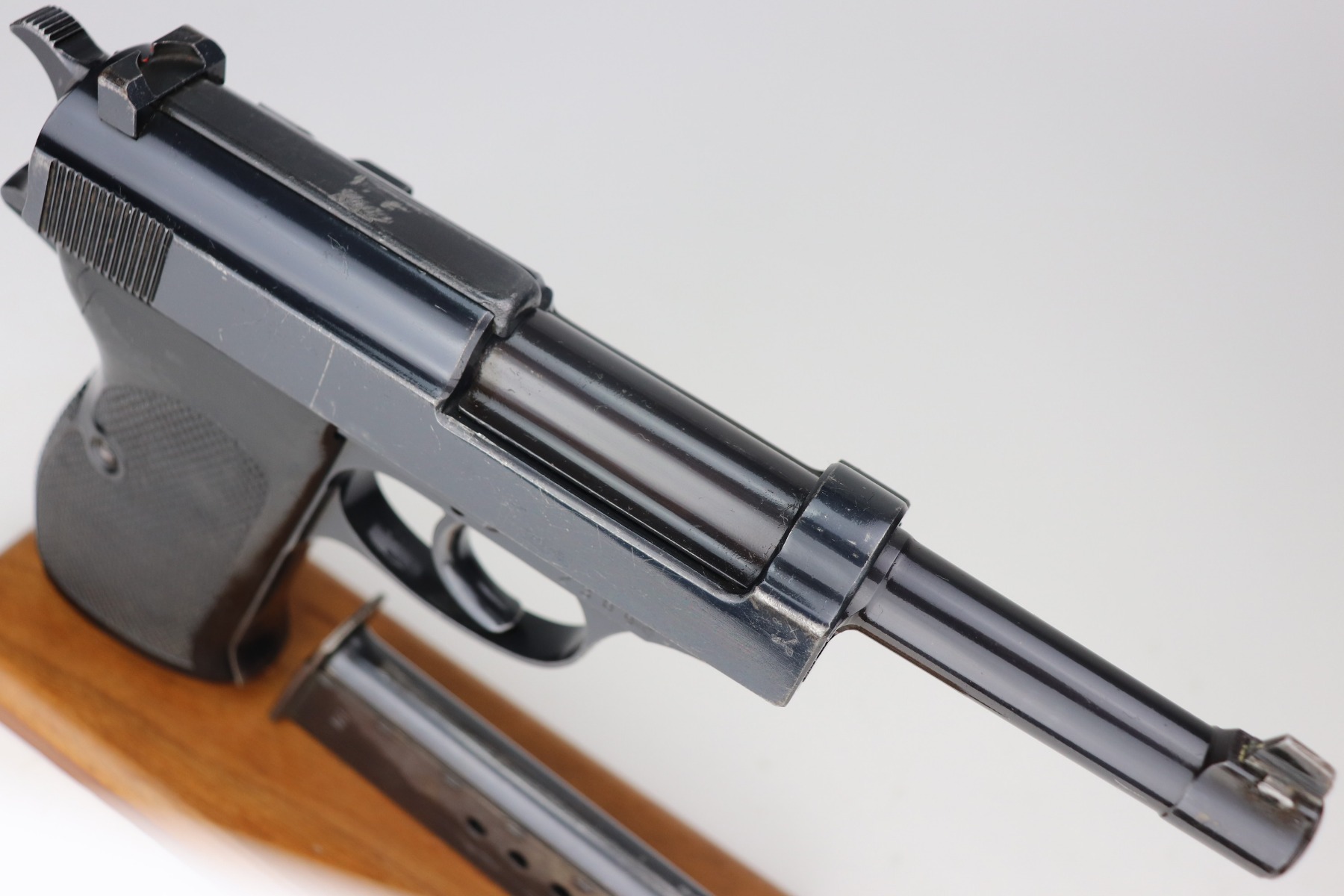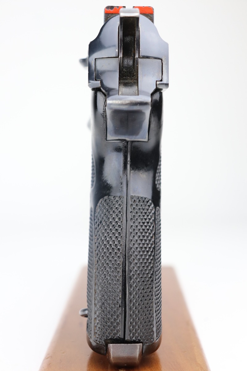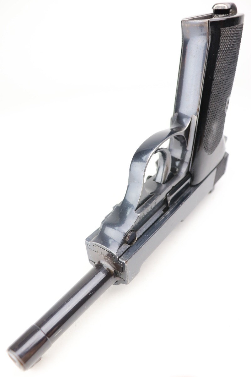 2/25/21 – This is a rare early Walther P.38, marked and known as the Mod HP or M/39, that was part of the second Swedish contract order for these pistols. There were only about 500 of this variant produced, all in April of 1940. It is all matching, but the barrel was re-numbered. It could have been done in the period, but we can’t say for sure. This pistol has very nice, early high polish finish that rates around 95%. The condition is somewhat difficult to grade as there are many very tiny surface scratches on the slide, which is surprisingly common on these guns. There’s also light finish loss on the edges of the slide and some handling marks on the front strap. A few scratches on the top plate. It comes with original and correct grips and a WW2-era magazine. The bore is minty. The de-cocker is not functional.
