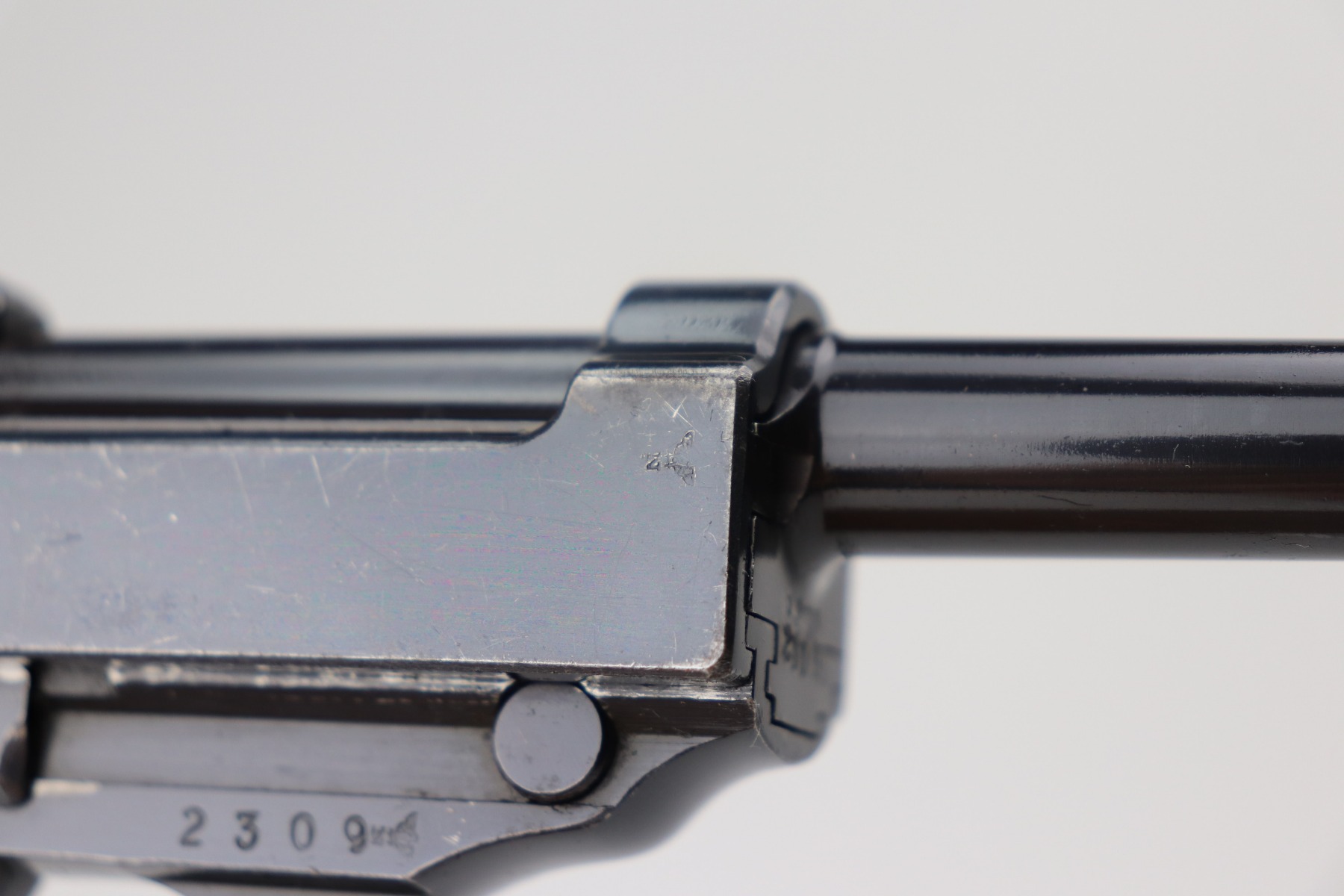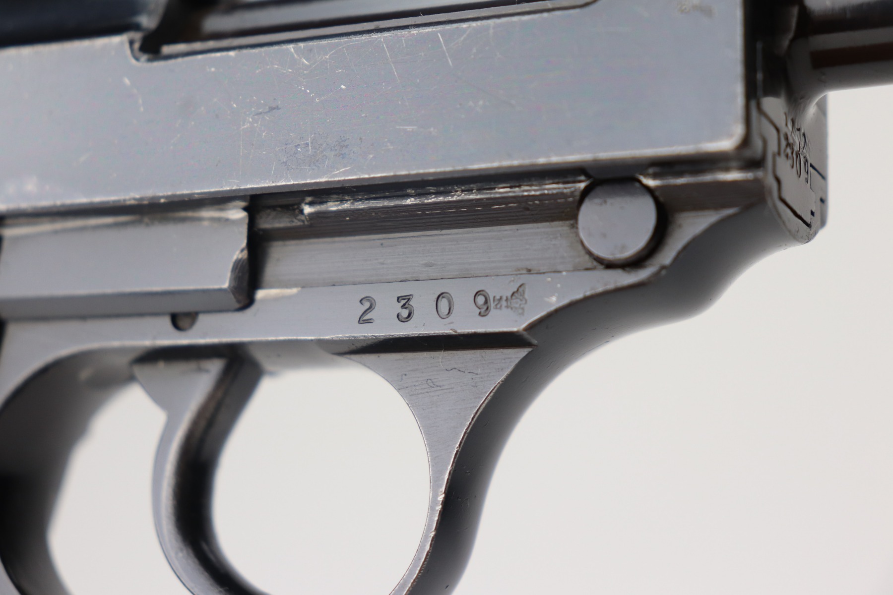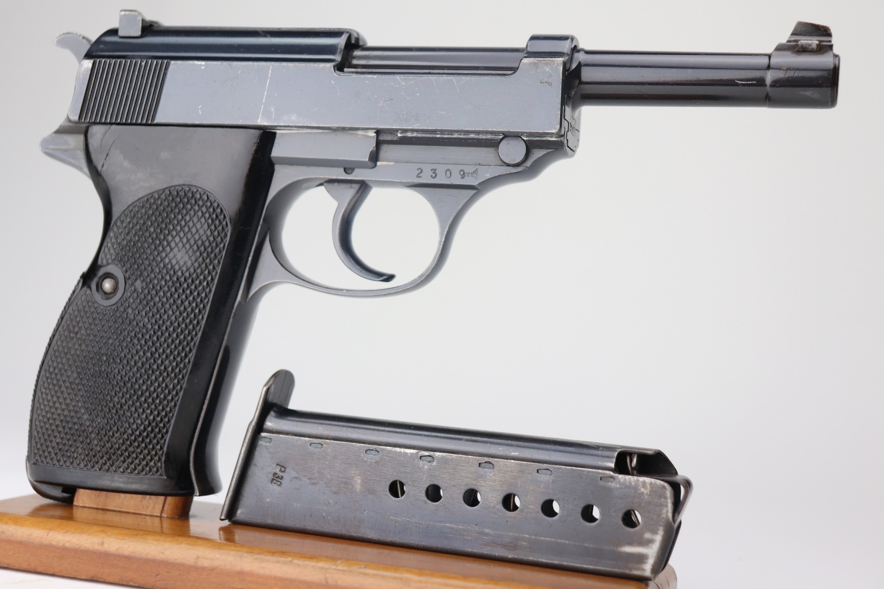 2/25/21 – This is a rare early Walther P.38, marked and known as the Mod HP or M/39, that was part of the second Swedish contract order for these pistols. There were only about 500 of this variant produced, all in April of 1940. It is all matching, but the barrel was re-numbered. It could have been done in the period, but we can’t say for sure. This pistol has very nice, early high polish finish that rates around 95%. The condition is somewhat difficult to grade as there are many very tiny surface scratches on the slide, which is surprisingly common on these guns. There’s also light finish loss on the edges of the slide and some handling marks on the front strap. A few scratches on the top plate. It comes with original and correct grips and a WW2-era magazine. The bore is minty. The de-cocker is not functional.