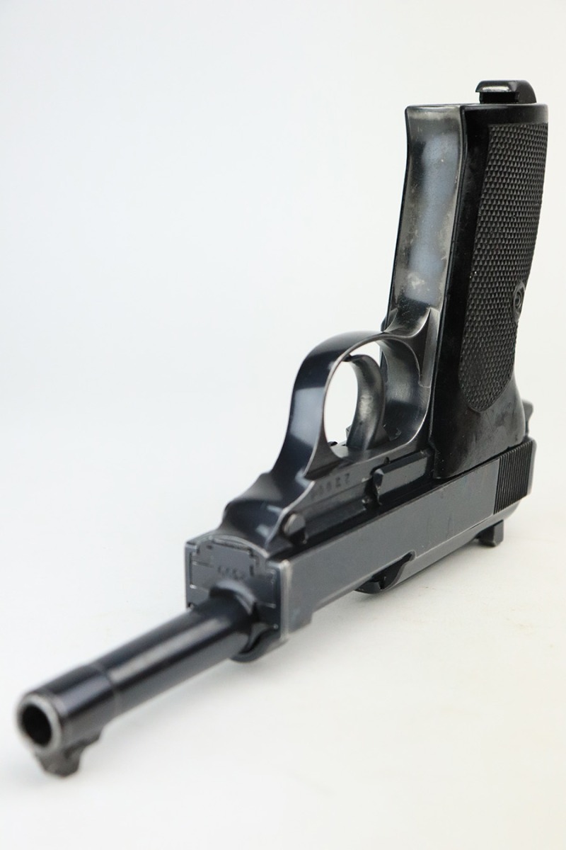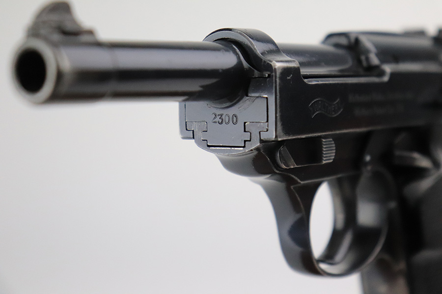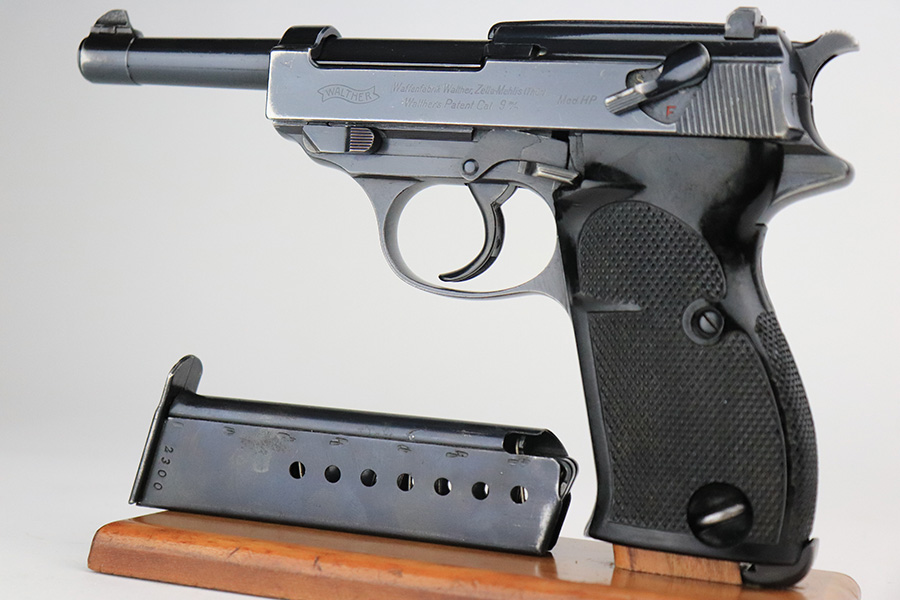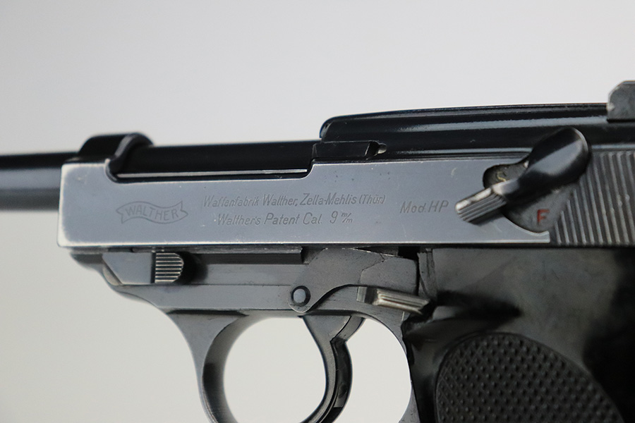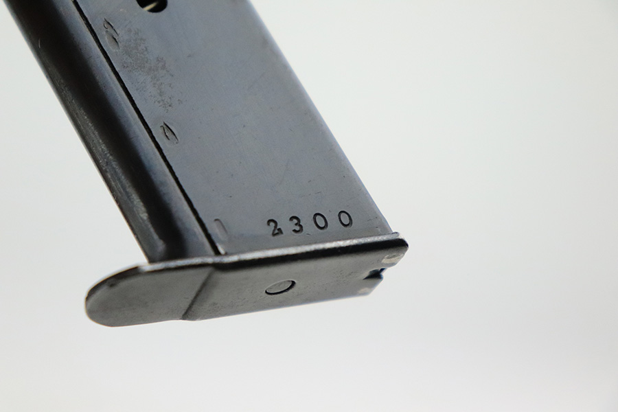 6/28/22 – This is a rare early Walther P.38, marked and known as the Mod HP or M/39, that was part of the second Swedish contract order for these pistols. There were only about 500 of this variant produced, all in April of 1940. This one is all matching and has the proper “Crown N” commercial proofs. It has retained about 85% of its original high polish finish. Most of the finish loss comes in the form of spotty wear on the front strap. There is also minor, somewhat scratchy wear concentrated around the high edges of the slide and around the muzzle. We believe the top plate has been refinished. Comes with excellent proper grips and a period-correct magazine with matching post-factory numbering on the left side of the tube. The bore is shiny with very strong rifling and just hints of frosting in the grooves. De-cocker is functional.
