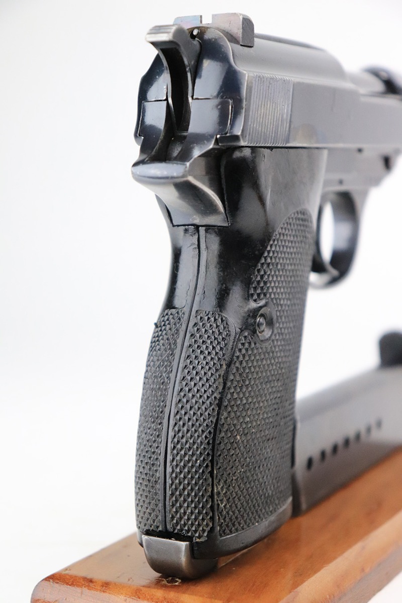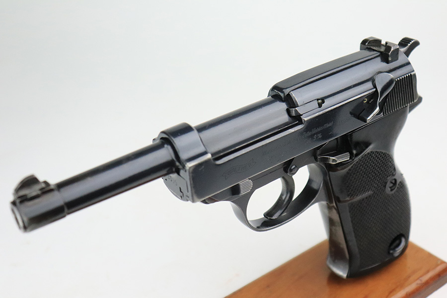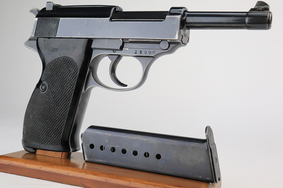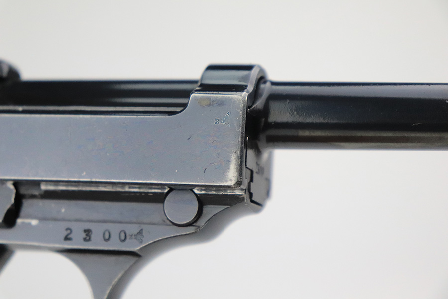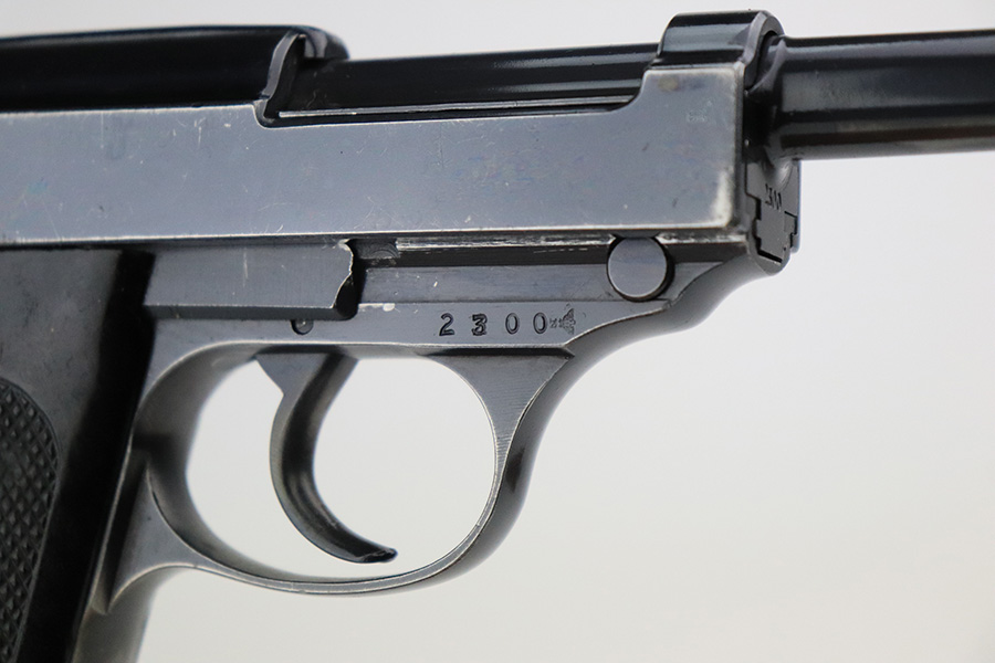 6/28/22 – This is a rare early Walther P.38, marked and known as the Mod HP or M/39, that was part of the second Swedish contract order for these pistols. There were only about 500 of this variant produced, all in April of 1940. This one is all matching and has the proper “Crown N” commercial proofs. It has retained about 85% of its original high polish finish. Most of the finish loss comes in the form of spotty wear on the front strap. There is also minor, somewhat scratchy wear concentrated around the high edges of the slide and around the muzzle. We believe the top plate has been refinished. Comes with excellent proper grips and a period-correct magazine with matching post-factory numbering on the left side of the tube. The bore is shiny with very strong rifling and just hints of frosting in the grooves. De-cocker is functional.