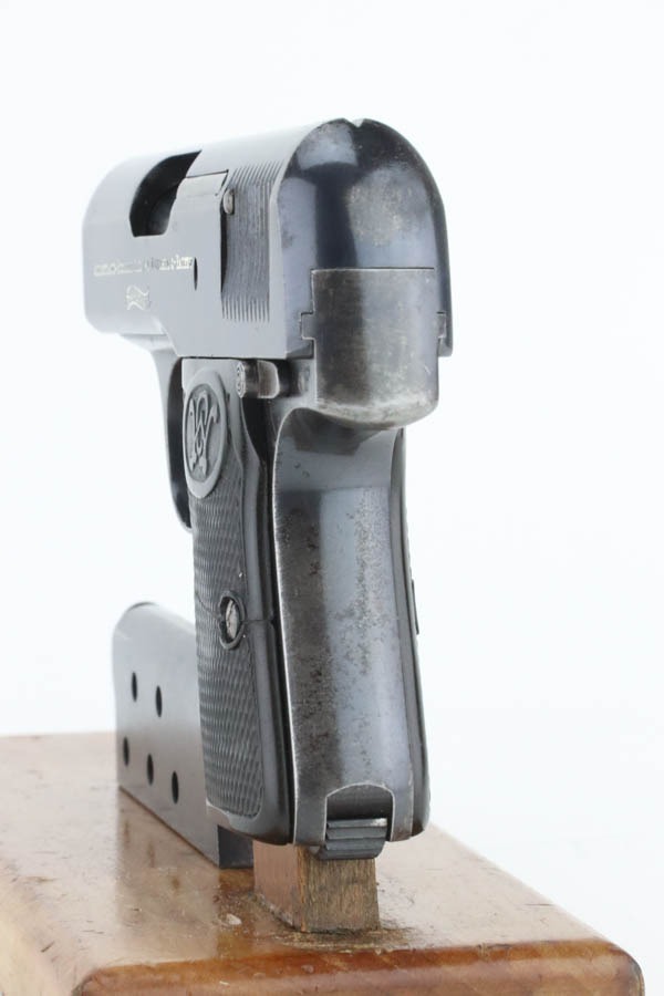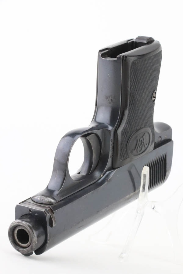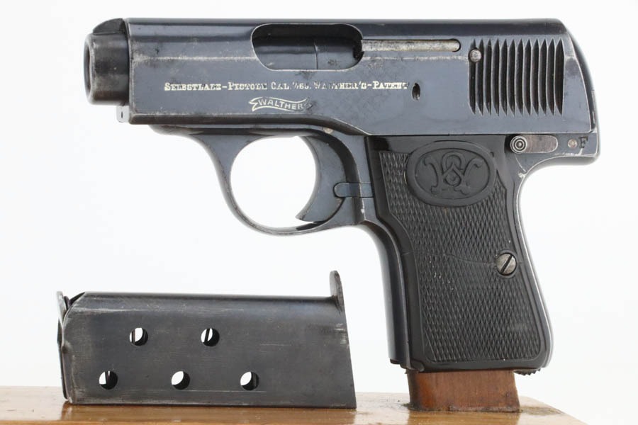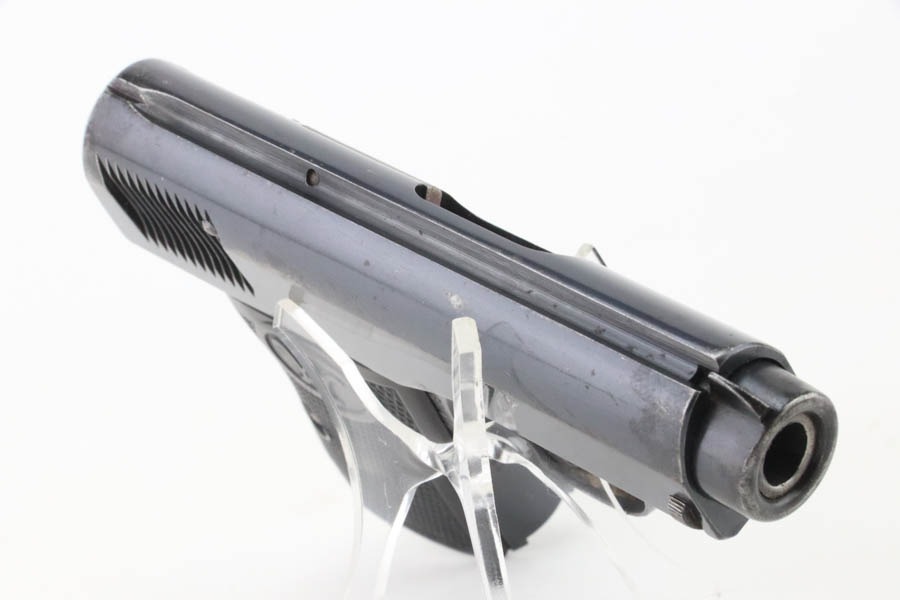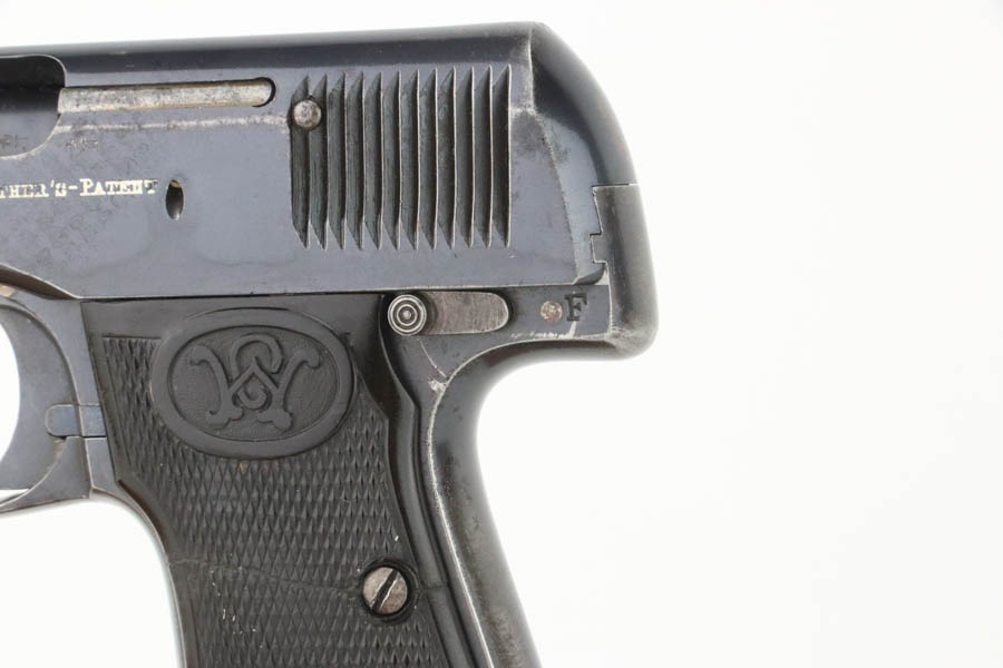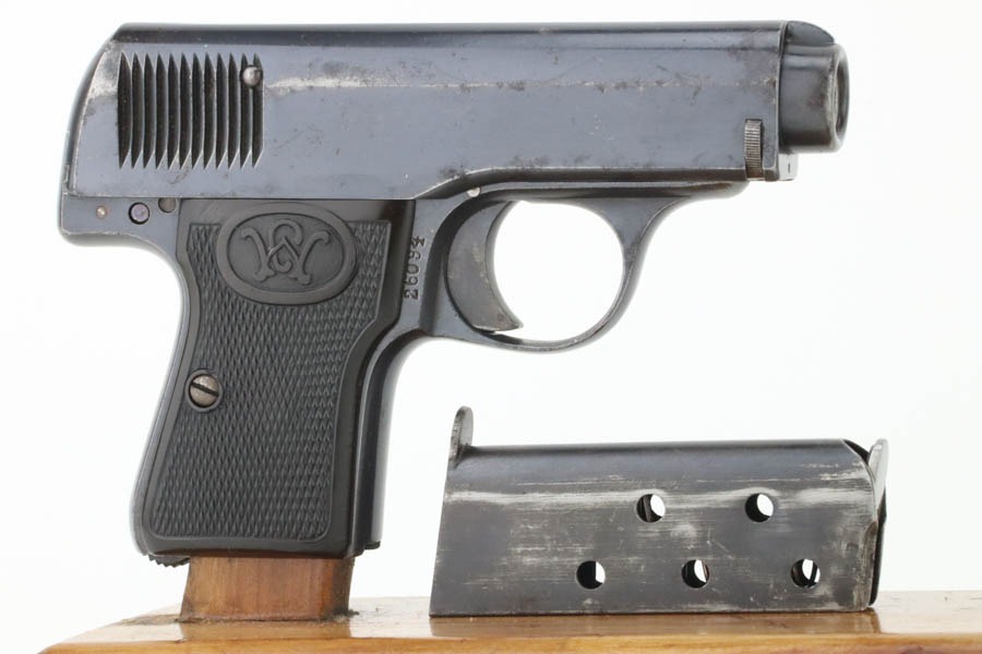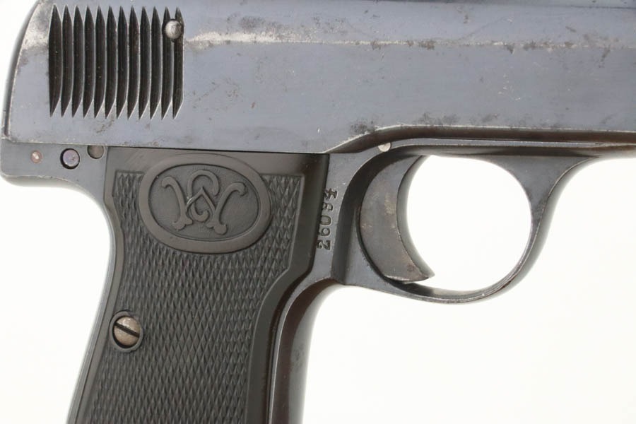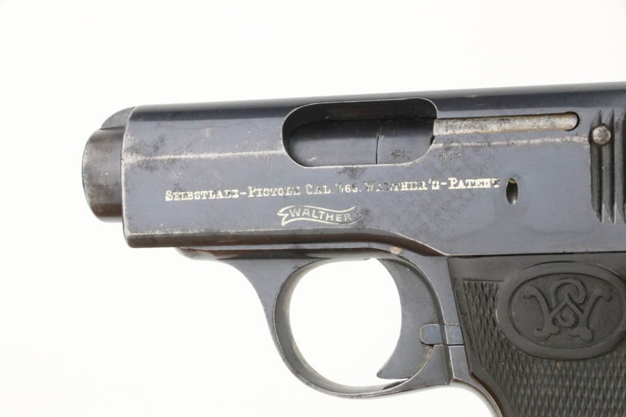9/30/24 – This is an original example of a very rare Walther Model 3, one of only ~3,500 ever produced. These pistols were introduced in 1913 and only sold for a few years. This one is matching and “Crown N” proofed. It’s original bluing rates about 93-94% with general high edge wear and thinning on the back strap. While there isn’t a ton of actual finish loss, there is spotty oxidation on the slide and small spots with small pits here and there – most noticeable on the back strap. Fitted with period-correct bakelite grips – repaired hairline crack on the left side. Comes with one proper magazine. The bore has good rifling, but there is pin-pricking throughout.
