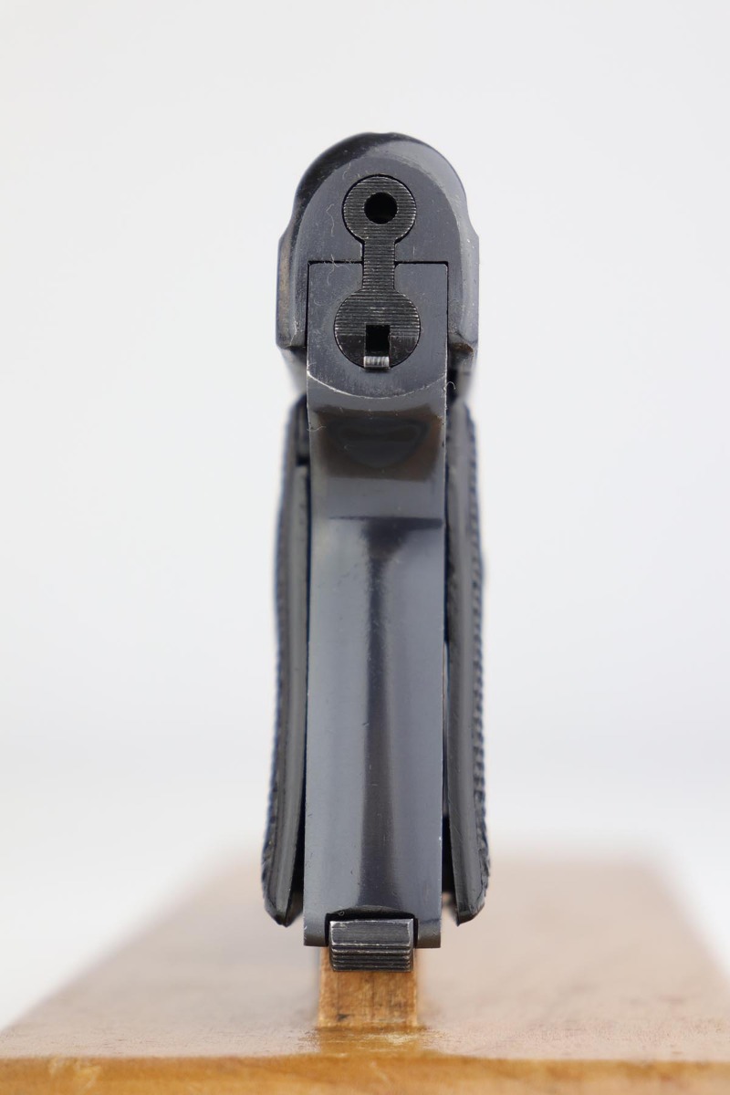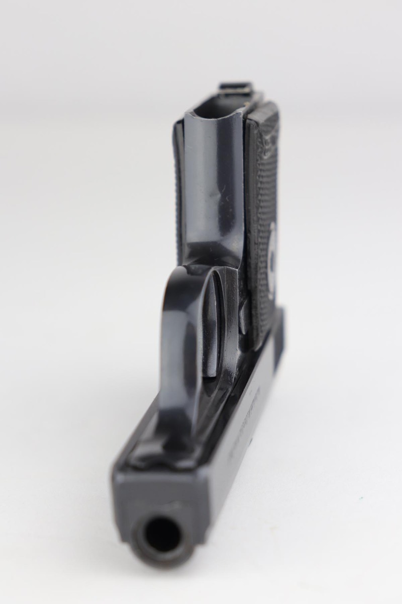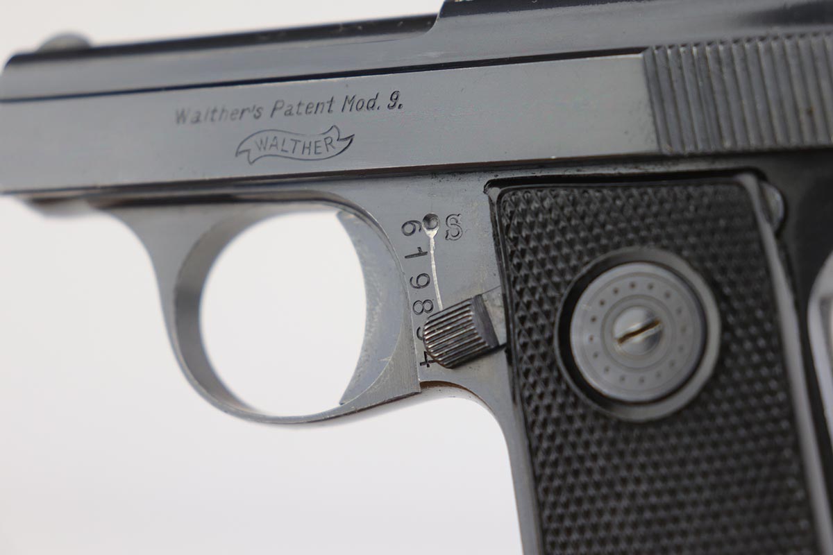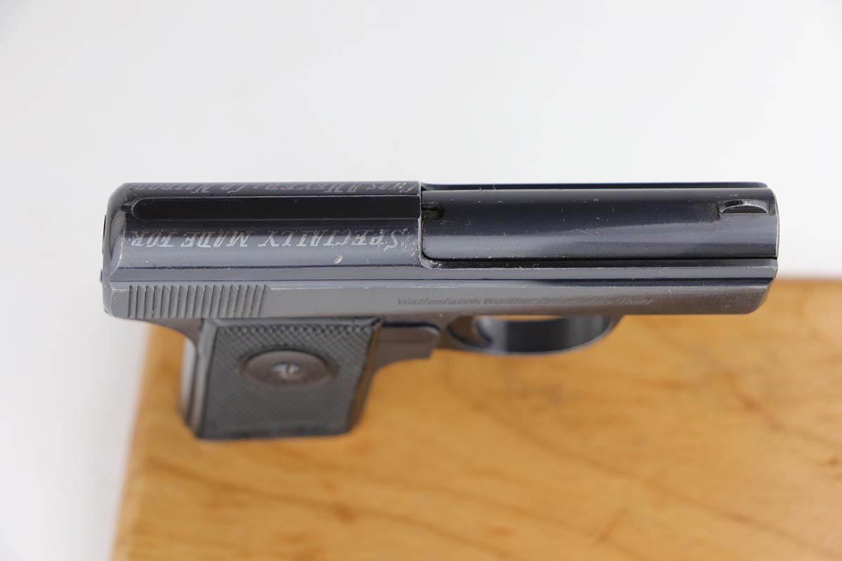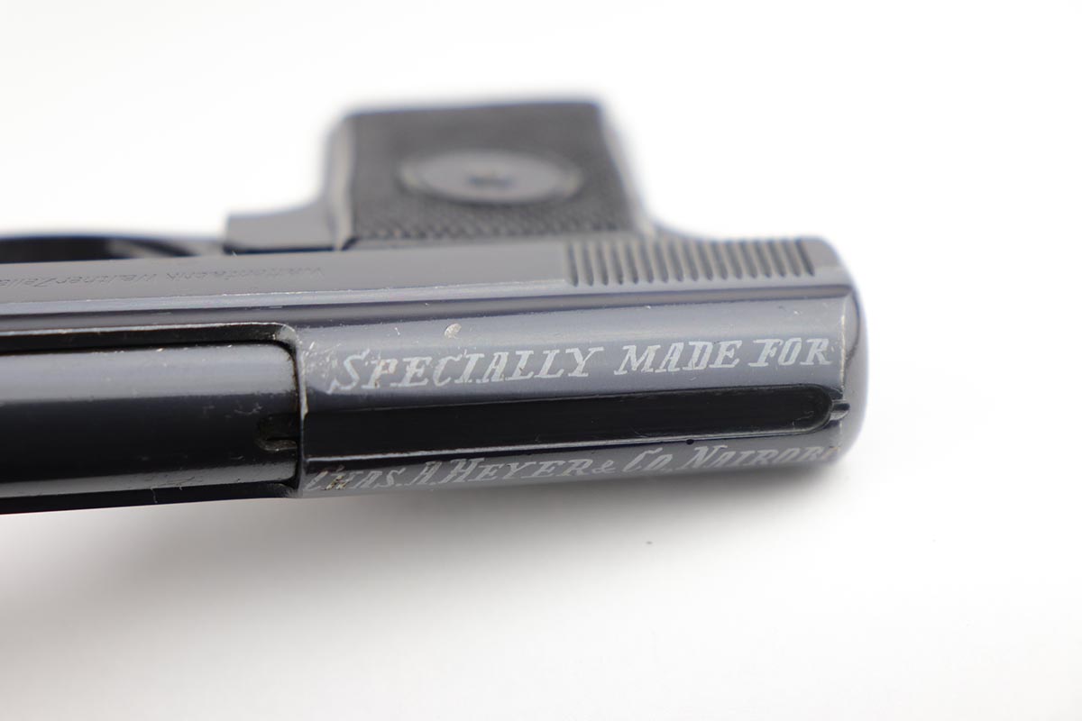 6/27/19 – This is a rare Walther Model 9 from a special distributor in Nairobi. The slide is marked stating the pistol is “SPECIALLY MADE FOR CHAS. A. HEYER & CO, NAIROBI”. This indicates the pistol was sold for special use by an African hunters’ shop. The pistol is a type two, model 9a in all original condition. The bluing rates at 98-99% with just tiny hints of edge wear, and a ding on the front strap. Walther banner magazine. Excellent grips with no major flaws, just a couple of dings and nicks on the right side panel. Bore has decent rifling but minor freckling throughout.