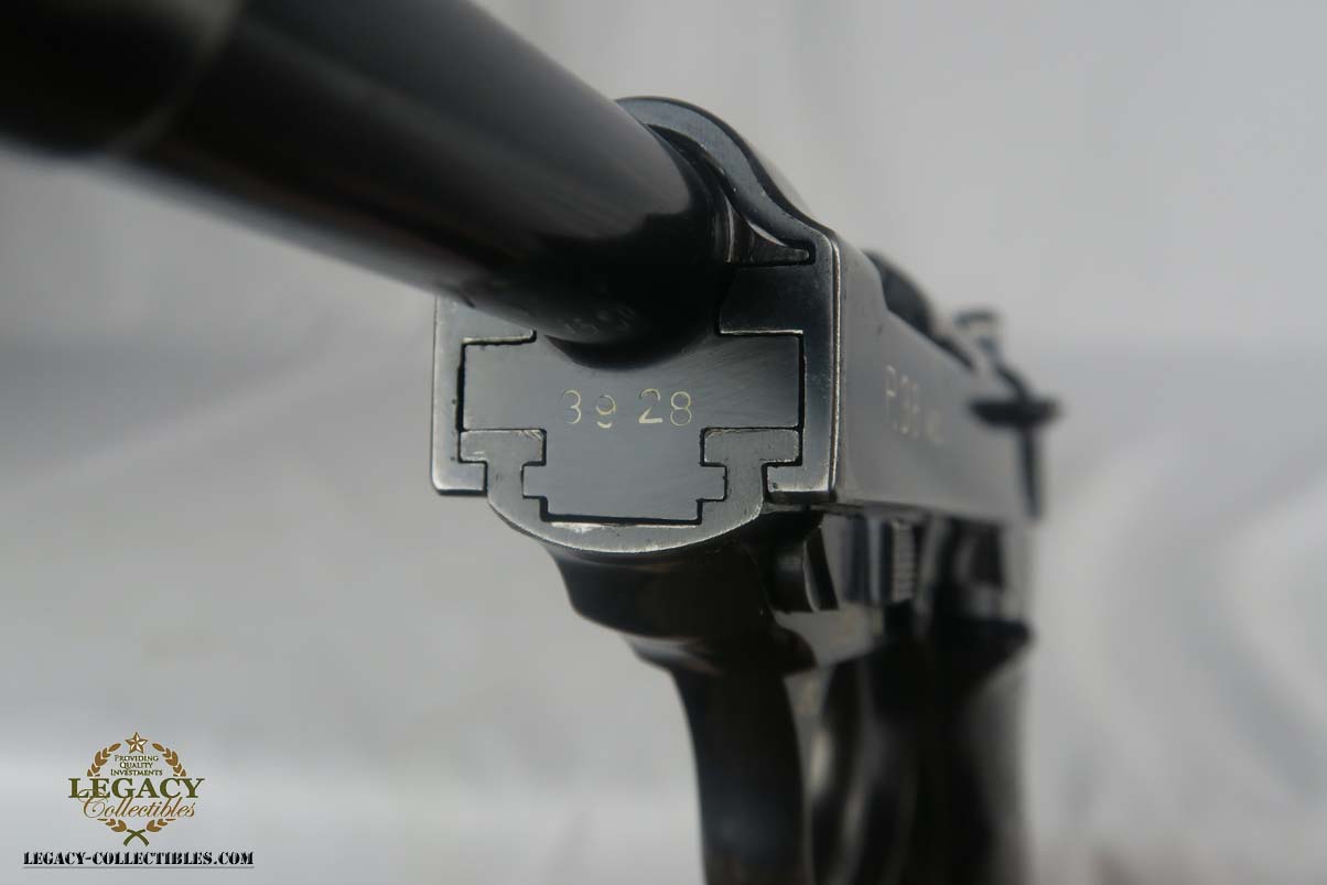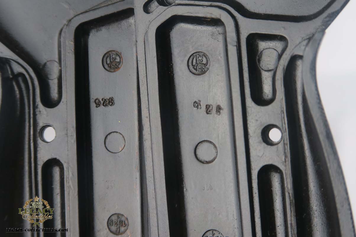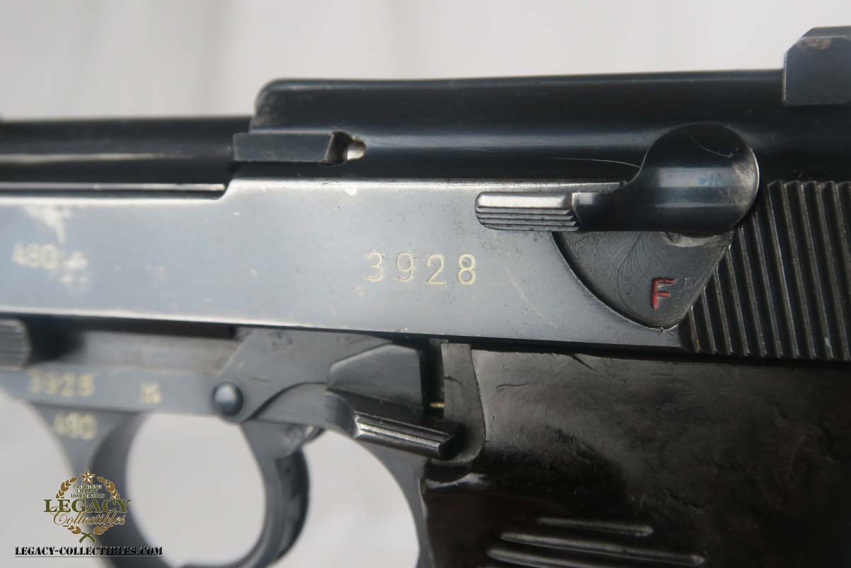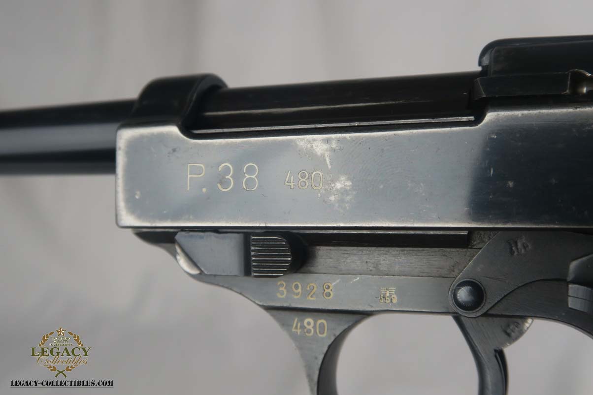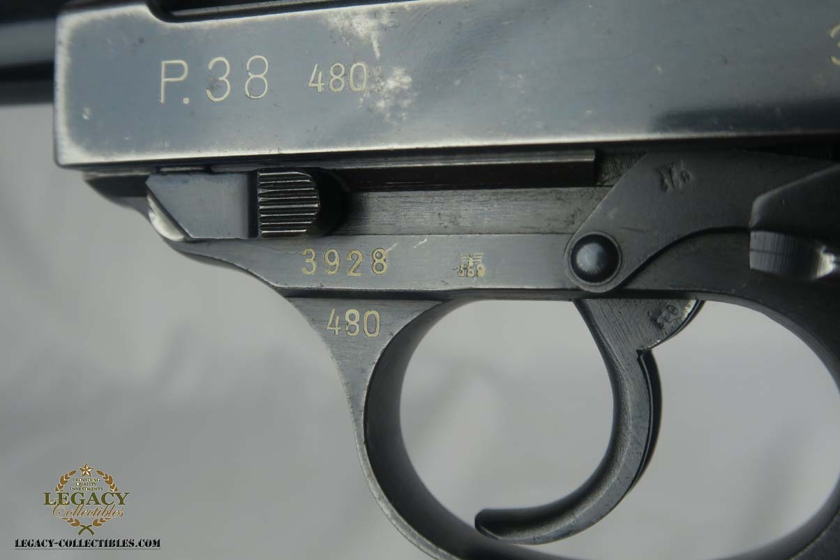 6/19/17 – This is a rare 480 code Walther P.38 in all original condition. The bluing rates at about 85-90%, with high edge wear on the slide and some thinning on the front strap. The pistol is all correct and matching. There were only about 7,000 of this variation produced with 480 code on the trigger guard, making it one of the rarest P.38 variations. Like most of the early Walther P.38’s, the small parts are waffen proofed. The grips are numbered to the pistol. The pistol has a commercial magazine in it. Strong bore with no major issues.