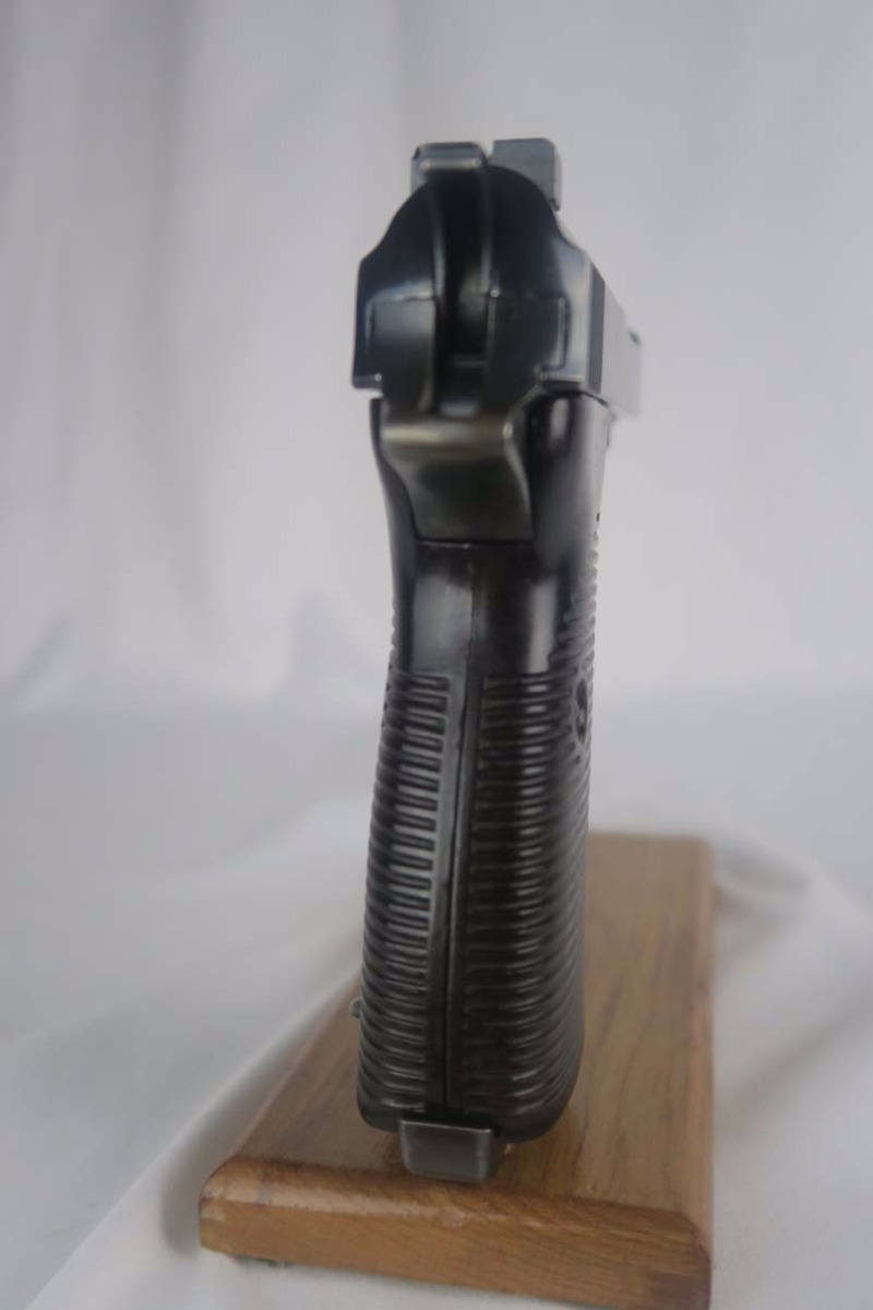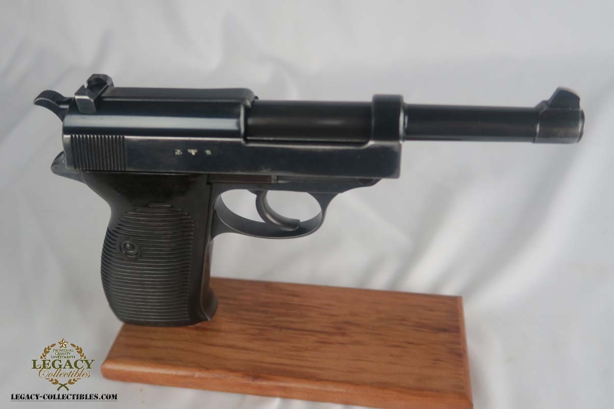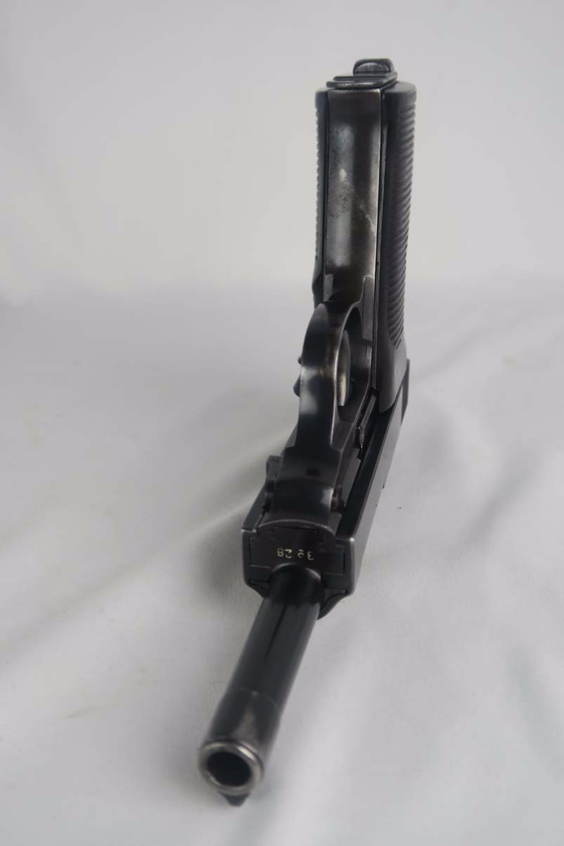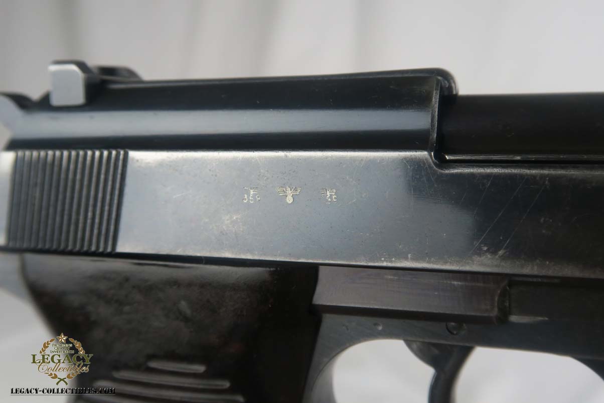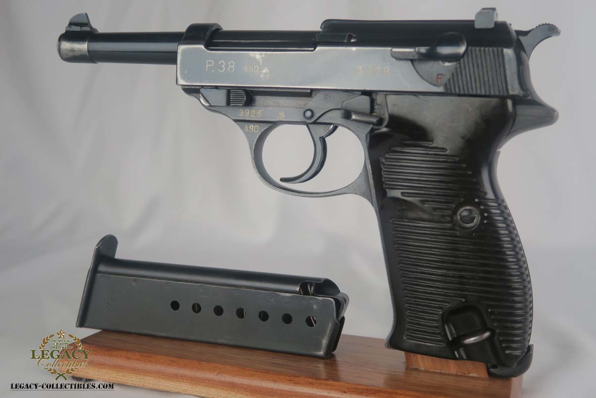 6/19/17 – This is a rare 480 code Walther P.38 in all original condition. The bluing rates at about 85-90%, with high edge wear on the slide and some thinning on the front strap. The pistol is all correct and matching. There were only about 7,000 of this variation produced with 480 code on the trigger guard, making it one of the rarest P.38 variations. Like most of the early Walther P.38’s, the small parts are waffen proofed. The grips are numbered to the pistol. The pistol has a commercial magazine in it. Strong bore with no major issues.