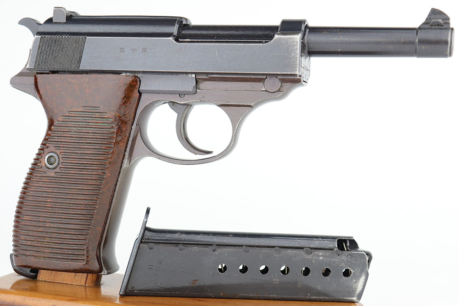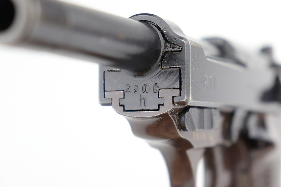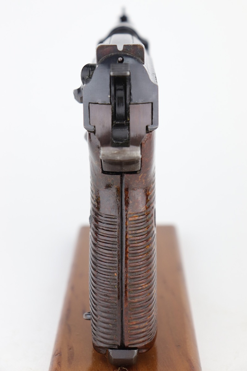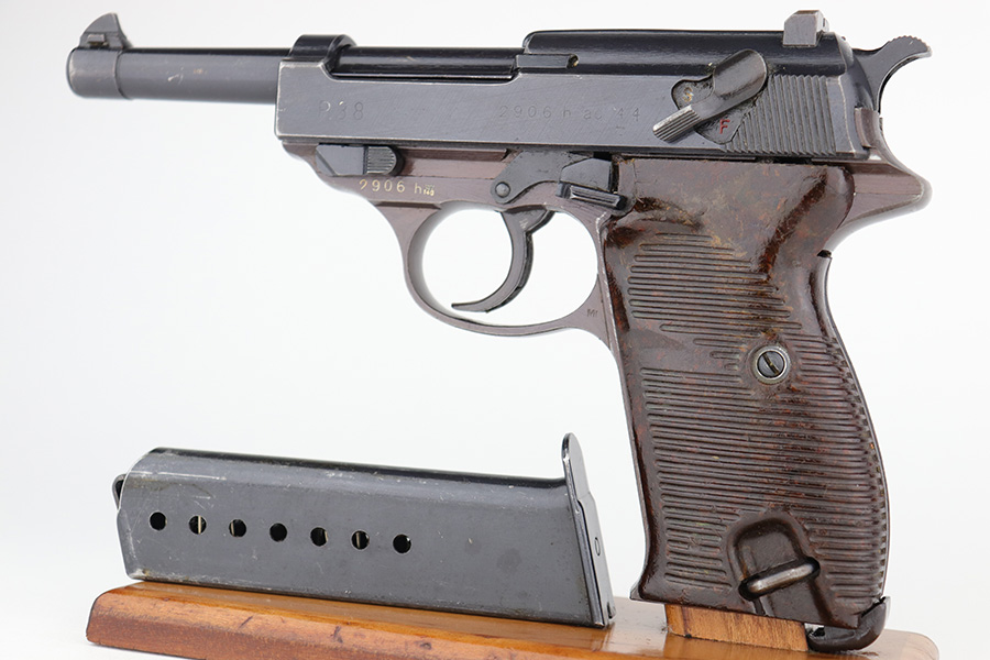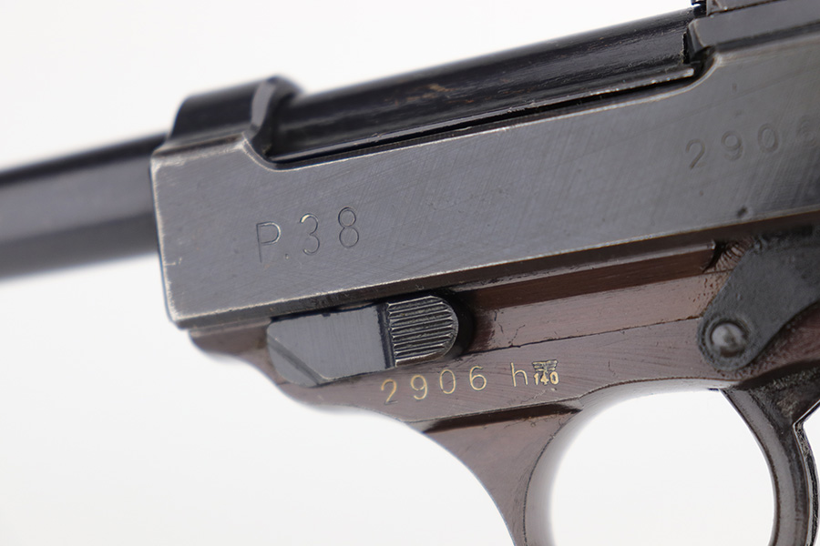 1/6/23 – This is a rare Walther P.38 from August of 1944 with FN-produced frame. One of only 4,200 such examples produced, this one is all matching and in terrific condition. Just a little bit of high point wear on the muzzle and front edges of slide. Nice plum tone to the frame, with a little patina on the front strap. Mint bore, hardly looks used. Good mechanics, including de-cocker. Nice red grips, though slightly shaved at the top.