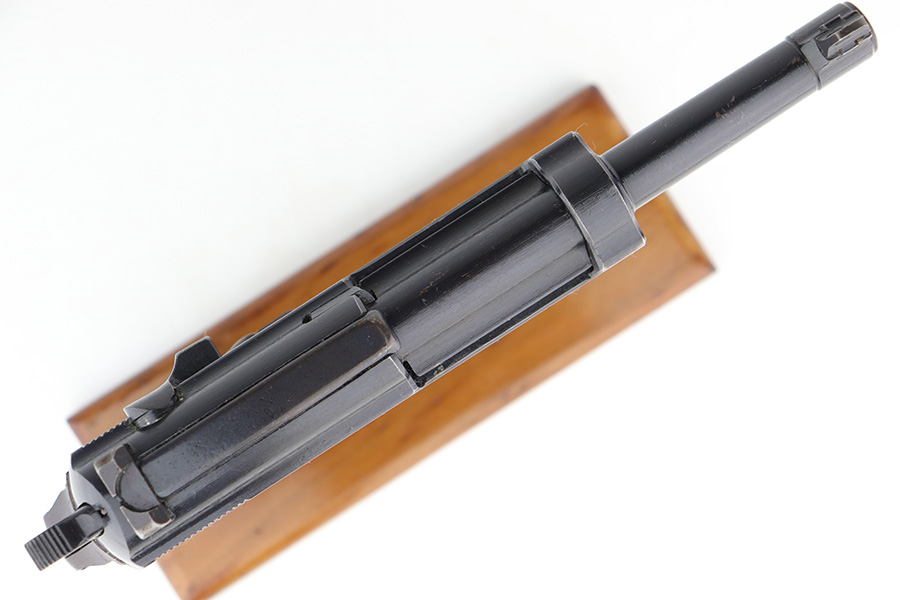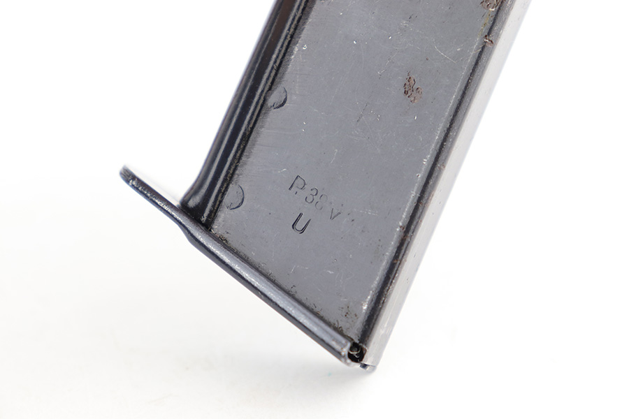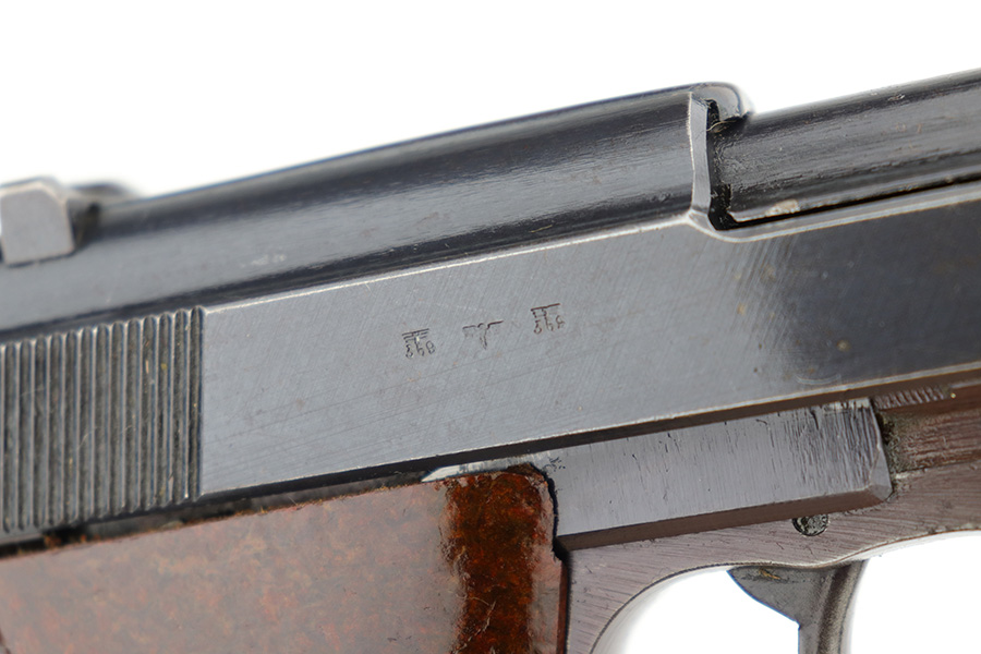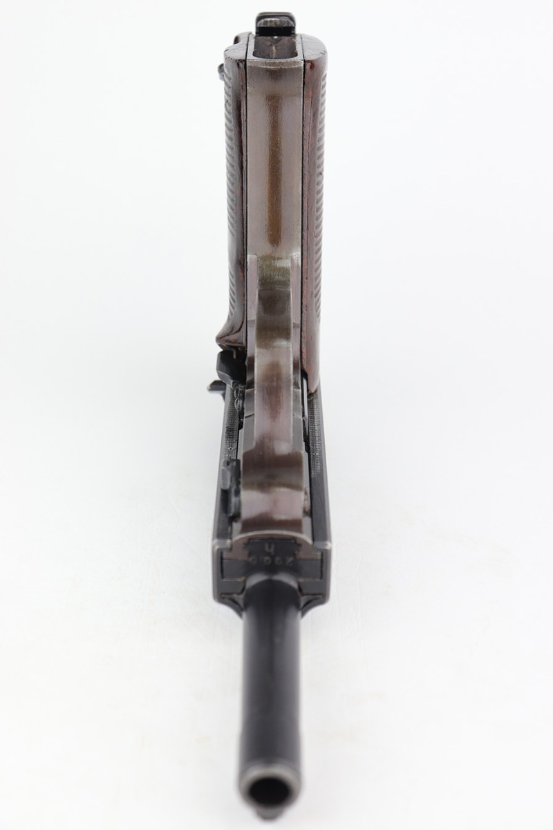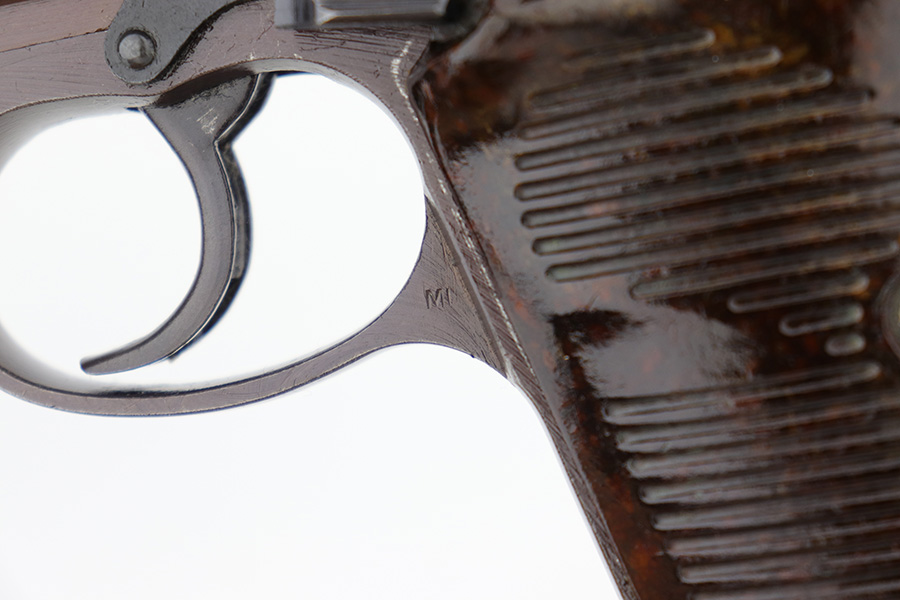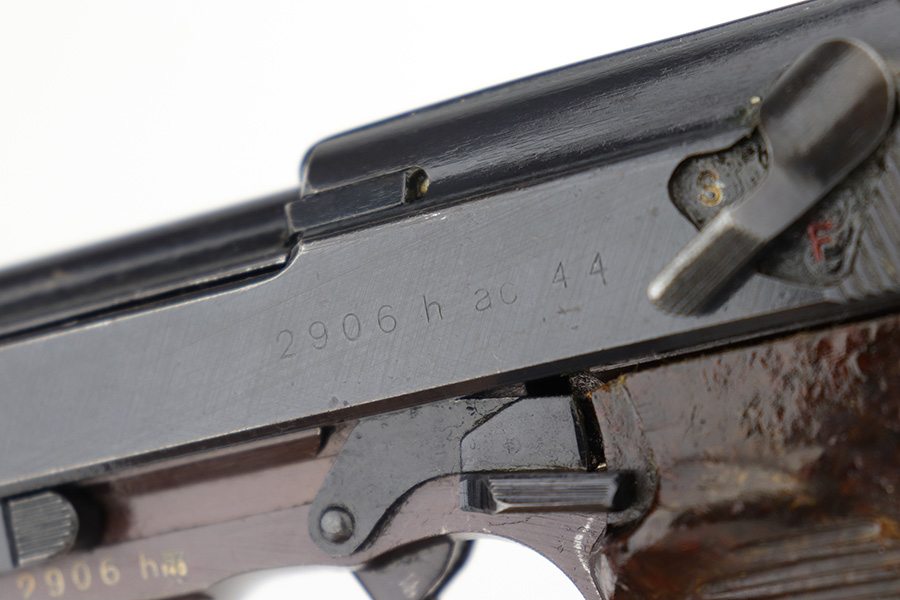1/6/23 – This is a rare Walther P.38 from August of 1944 with FN-produced frame. One of only 4,200 such examples produced, this one is all matching and in terrific condition. Just a little bit of high point wear on the muzzle and front edges of slide. Nice plum tone to the frame, with a little patina on the front strap. Mint bore, hardly looks used. Good mechanics, including de-cocker. Nice red grips, though slightly shaved at the top.