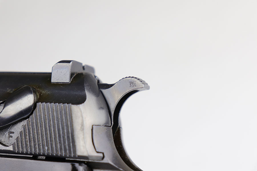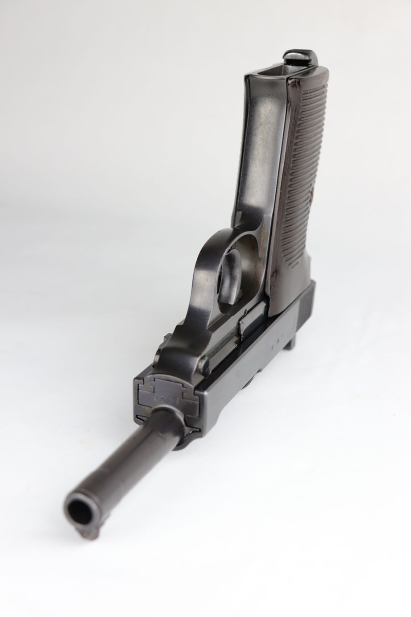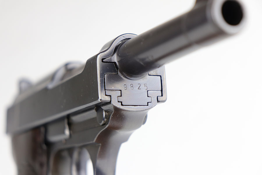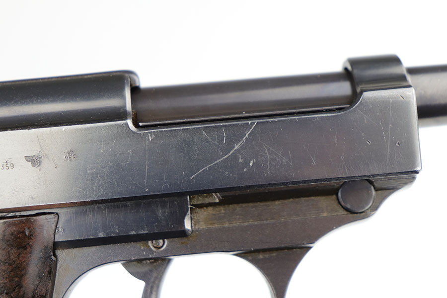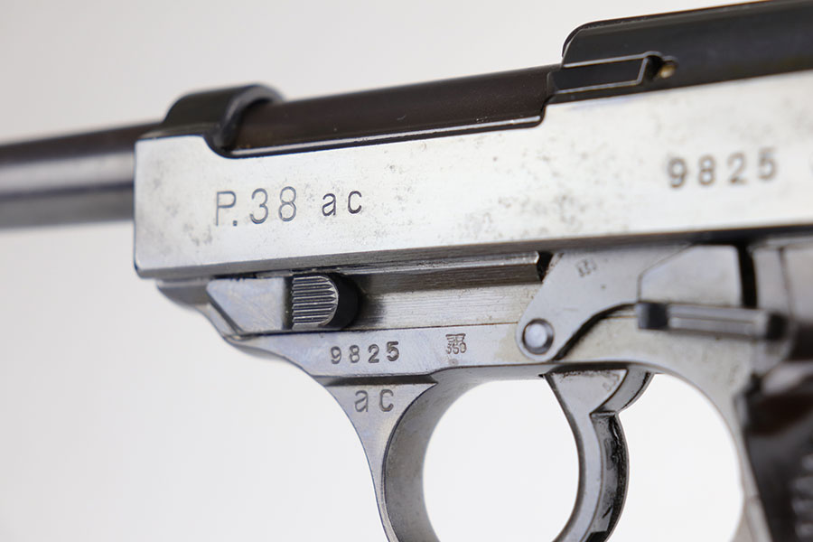 5/7/20 – This is an all matching example of a rare Walther P.38 with no date on slide. There were only about 2,600 of this variation produced, and in original condition can sell for $5000-6000. This finish was restored at some point, and there is some freckling under the finish. E/359 proofs on the grips and all parts aside from the firing pin cover. Bore has good rifling but some frost and freckling near the muzzle. Good mechanics, including de-cocker.