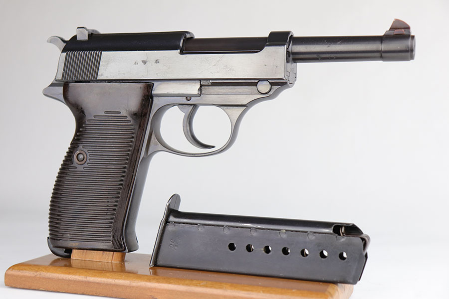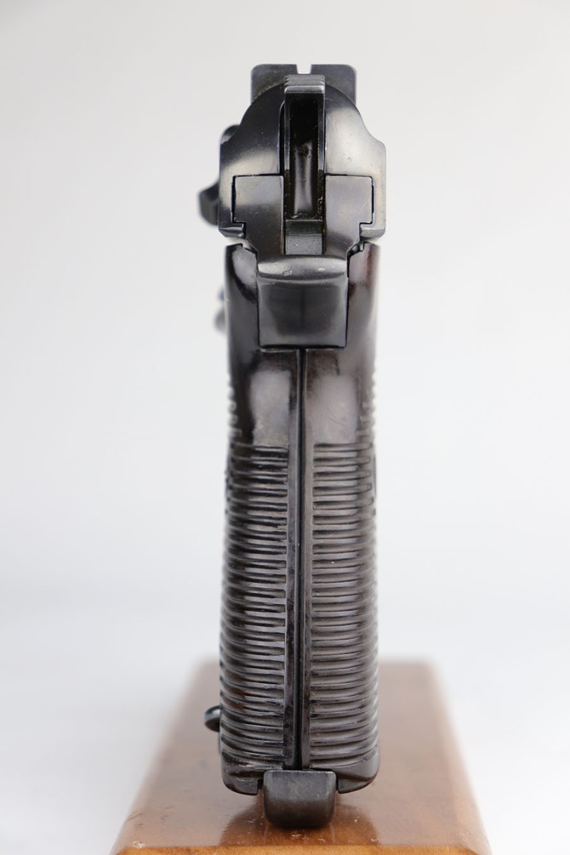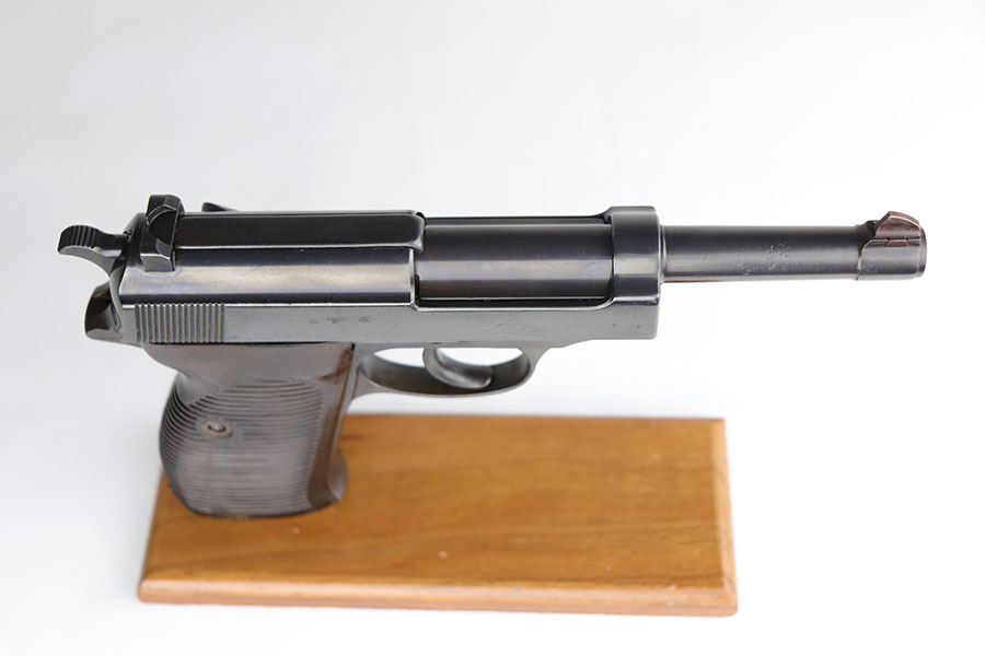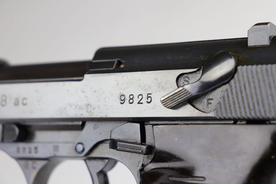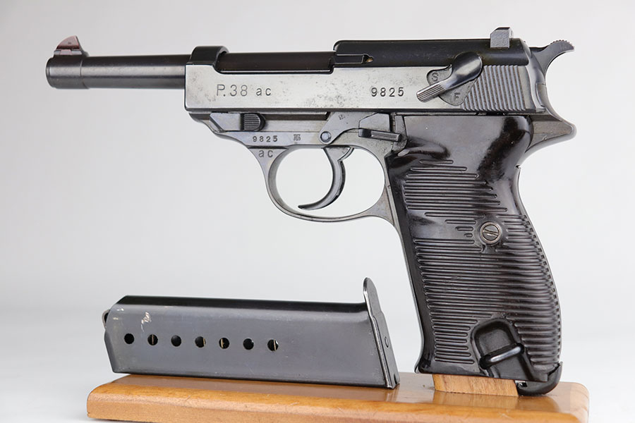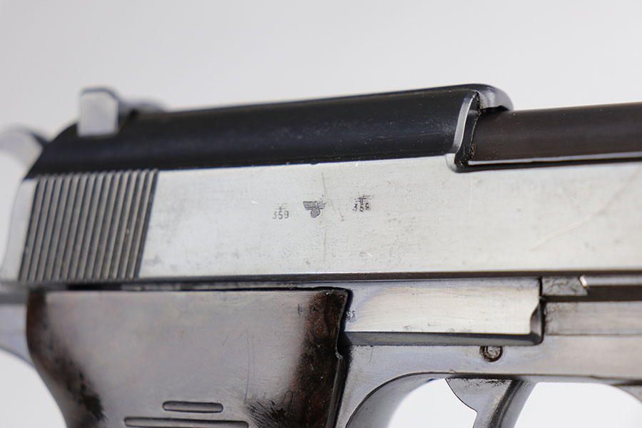5/7/20 – This is an all matching example of a rare Walther P.38 with no date on slide. There were only about 2,600 of this variation produced, and in original condition can sell for $5000-6000. This finish was restored at some point, and there is some freckling under the finish. E/359 proofs on the grips and all parts aside from the firing pin cover. Bore has good rifling but some frost and freckling near the muzzle. Good mechanics, including de-cocker.