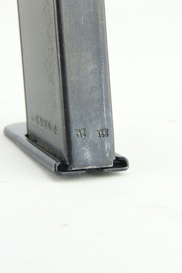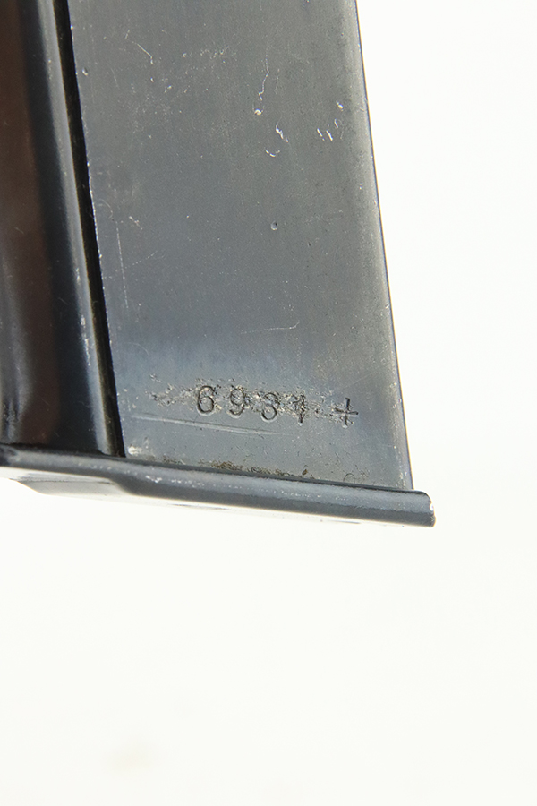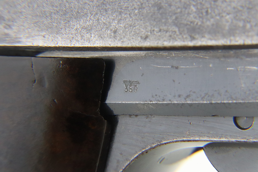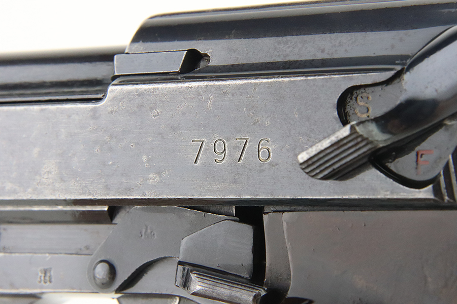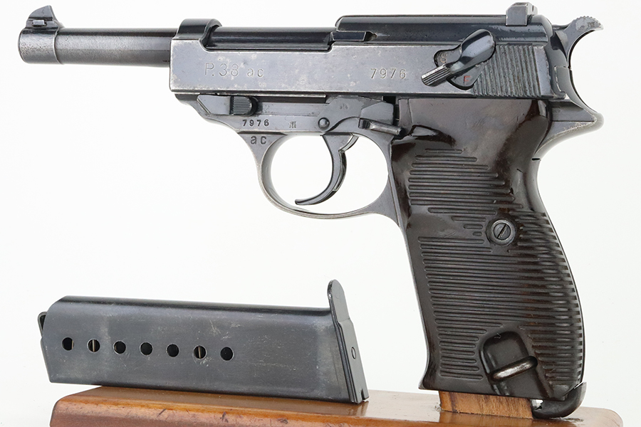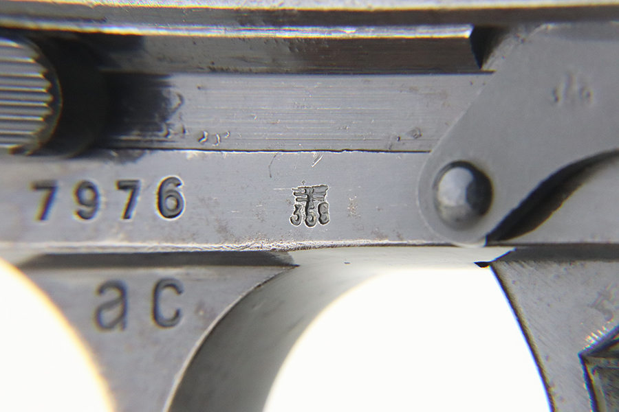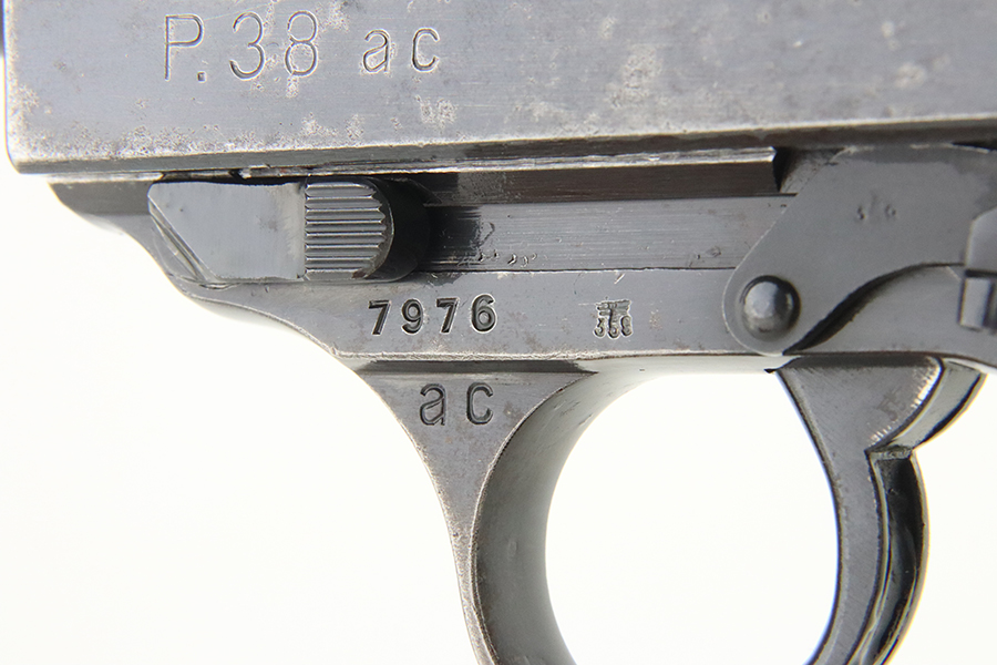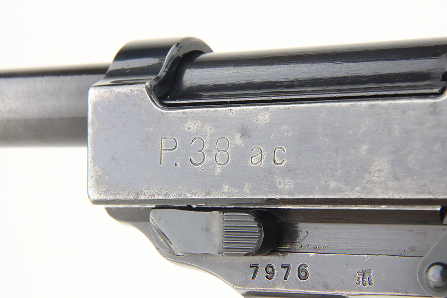 5/15/24 – This is a very rare and desirable Nazi Walther P.38 from 1940. Referred to as the “ac no date”, there were only about 2,500 of these produced, and this one is in the correct serial range. There’s only about 50 reported examples known. The numbered parts on this one match but the full barrel assembly is not numbered, including the locking block. It has retained roughly half of its original high polish finish with obvious wear throughout and some areas of pin-pricking on the slide and on the front strap. Fitted with matching-numbered and waffen-proofed grips. Comes with a proper double “Eagle 359” proofed magazine, but it is mismatched. The bore is mostly shiny with great rifling, but there is pin-pricking in the grooves. De-cocker is functional.