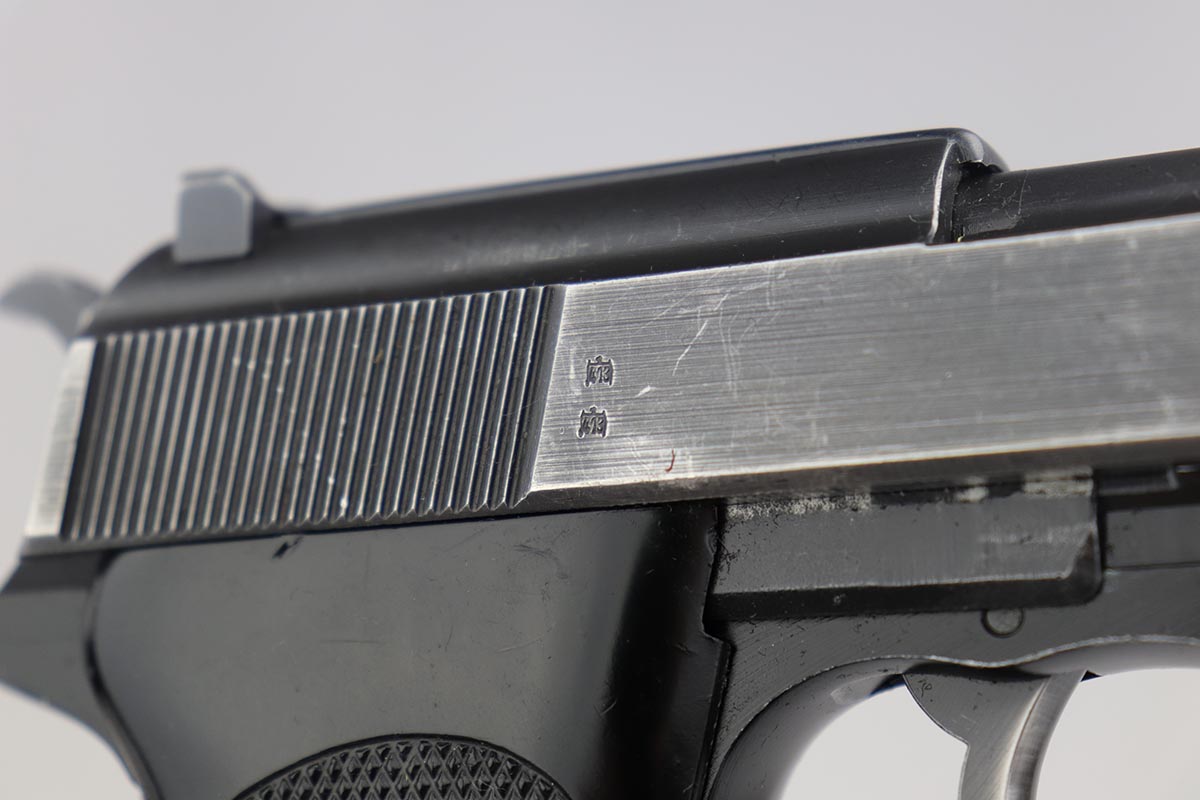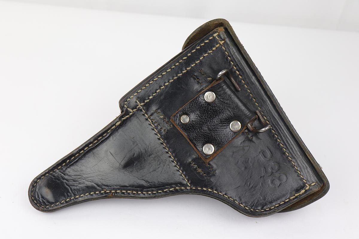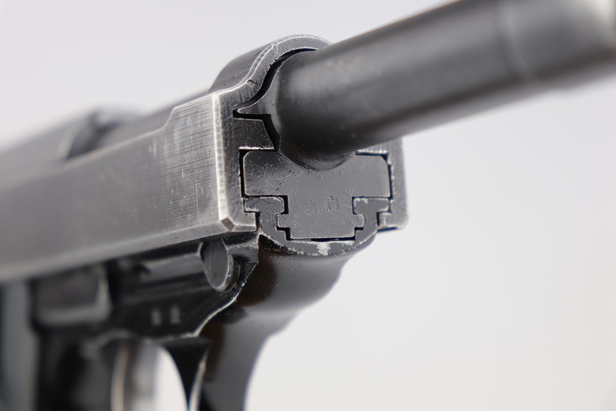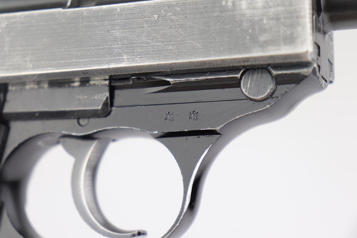 4/19/19 – This is a super rare Walther P.38 rig that was part of a Norwegian military contract. It is estimated that only 25-50 Norwegian-marked P.38’s are in the United States, and that only ~200 total still exist. The Norwegian government sold a limited number as surplus and then destroyed the rest, so not many survived. This pistol is listed by serial number (369946) in Per Mathisen’s “Walthers P.38 Pistol In Norway” in the table on pp. 254-256 titled “Reserve pistols coming from the main arsenal at Lillehammer”. From the information in the book I infer that this is a Norwegian Army pistol rather than Air Force. This pistol is near the end of the last contract block (369000-370000). The gun, WW2 holster and spare magazine were part of the iconic Warren Buxton collection, and sold via Julia’s Spring 2018 auction as part of lot 3360. This listing can be found under Morphy’s auction house (they absorbed Julia’s not long after this auction) for confirmation of the provenance. This pistol is all correct and original: the slide, barrel and locking block are consistently marked and proofed, although not numbered. This is correct as these were originally commercial pistols pulled for the Norwegian contract – note the circle proofs without a dot which was used for commercial production. This lot was delivered in the 1975 time frame, and as such this has the desirable “fat” or reinforced slide and the stronger forged lock block, but not the frame hex pin. The hex pin didn’t get added to commercial pistols until the following year. The slide has the correct, unique factory roll-mark that includes the Norwegian crest. The right side of the slide, right side of the frame, and front of the barrel are marked with 2 “E/413” proofs. The lock block has one E/413 but it’s hard to make out. The overall condition of the pistol is around 85-90% with some thinning of the slide and barrel, and minor wear on the trigger guard. Terrific bore. There is a small import mark on the left frame under the grip panel, completely hidden. Grips are in very good shape and free of cracks or chips. Both magazines are in excellent shape, and are commercial polished blue with the Walther banner and P.38 9x19mm marking on the lower left side but no other markings. The leather holster is an unknown maker, as the belt hanger added by the Norwegian military obscures the makers mark and Waffenamt. It’s in very good condition with intact stitching, and the lift strap is still in place.