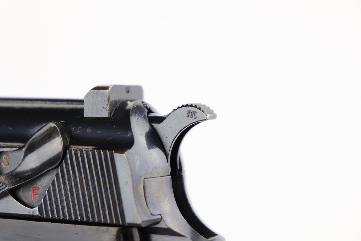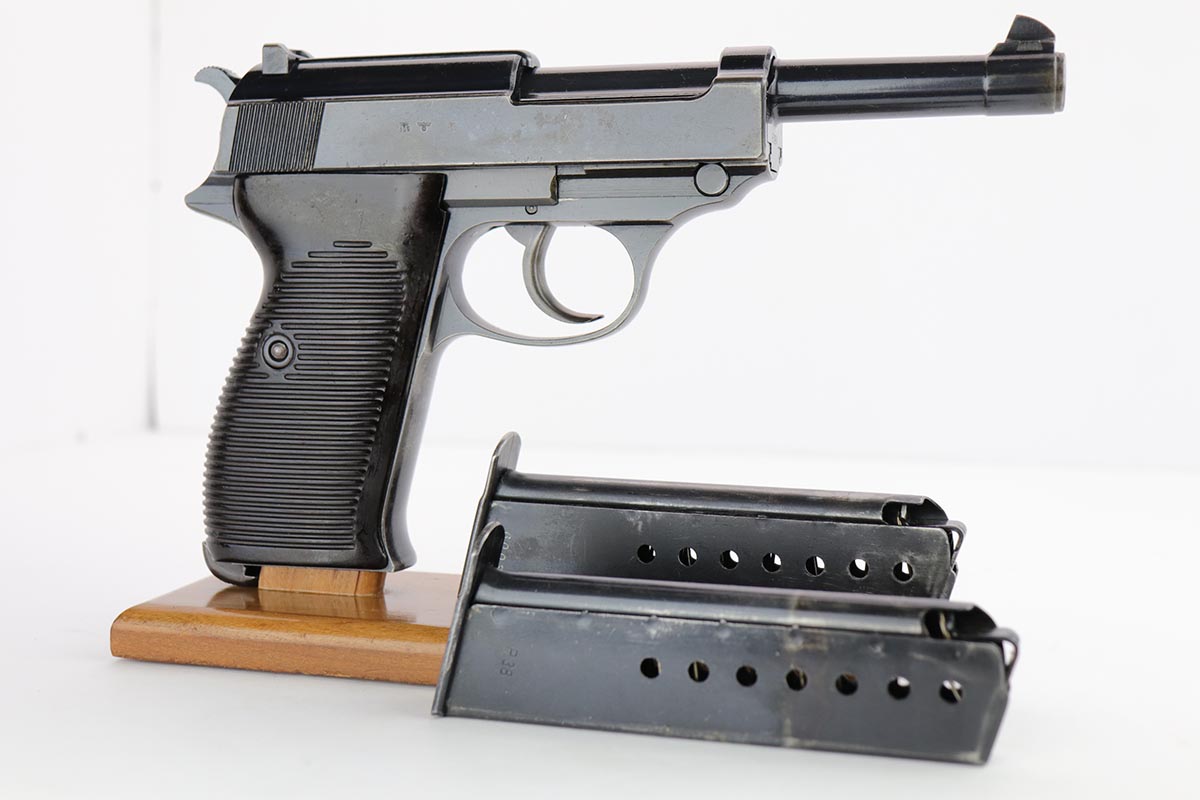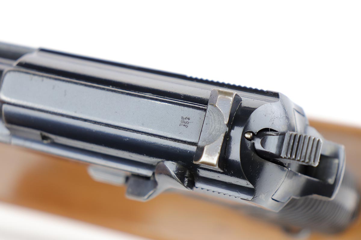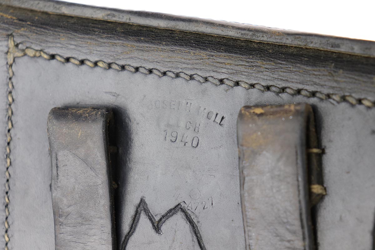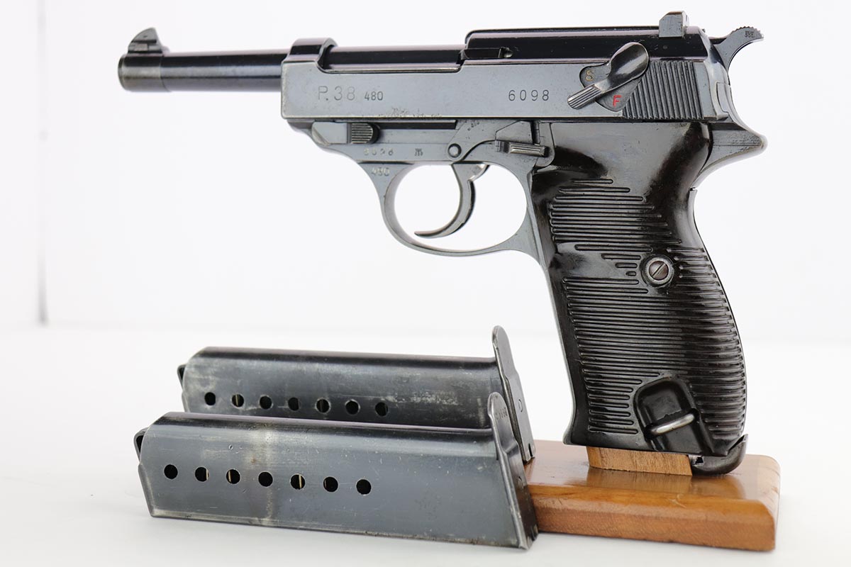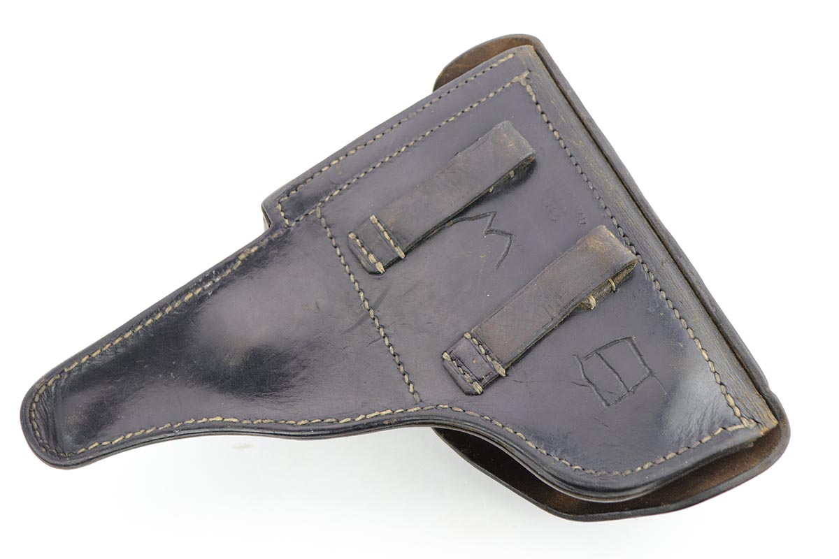 2/14/20 – This is a rare and early Walther P.38 rig from 1940, one of only 7,000 produced with ‘480’ code on frame/slide. The pistol is all matching and original, including the grips. The finish rates at about 80+% with the majority of wear on the front strap, but some pitting along the edges on the left side of the slide. All small parts correctly have the Walther inspection stamp. One of the magazines is an early variant with serial on the left side of the body and side by side Walther stamps on the spine. Both magazines are numbered, though neither match this pistol. Pistol has an excellent bore and proper mechanics. The rig is completed by a rare hardshell holster that is 1940 dated. It’s in great condition aside from two symbols or initials that were carved into the back.