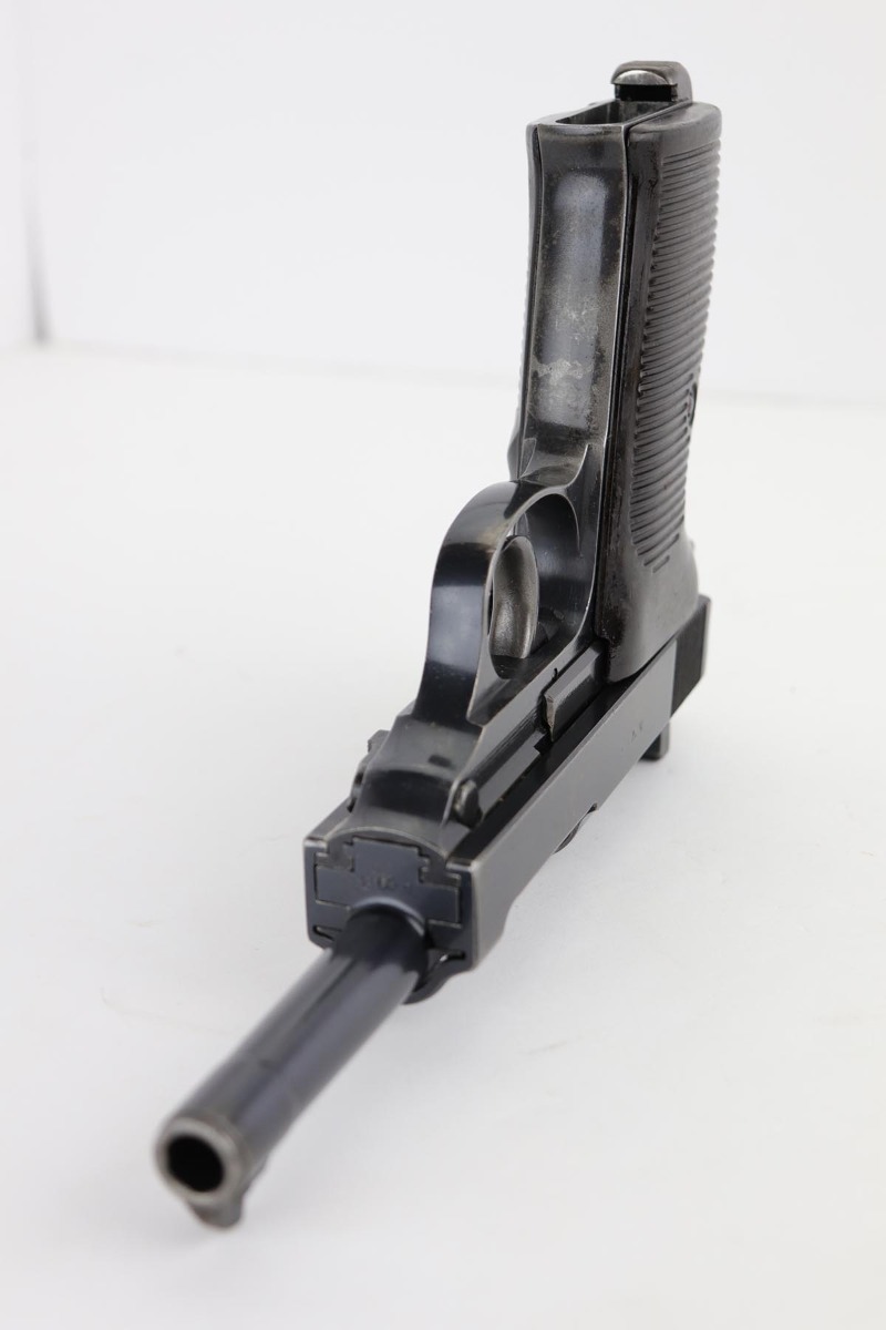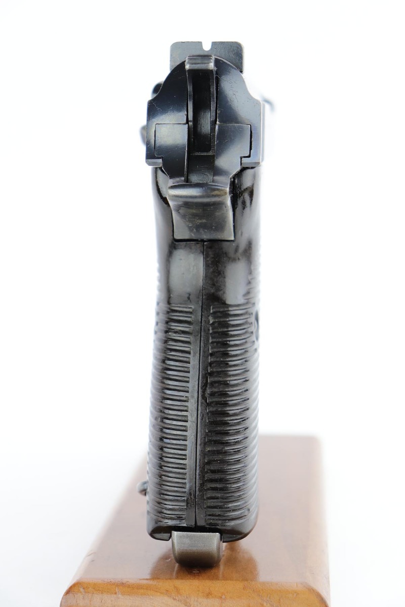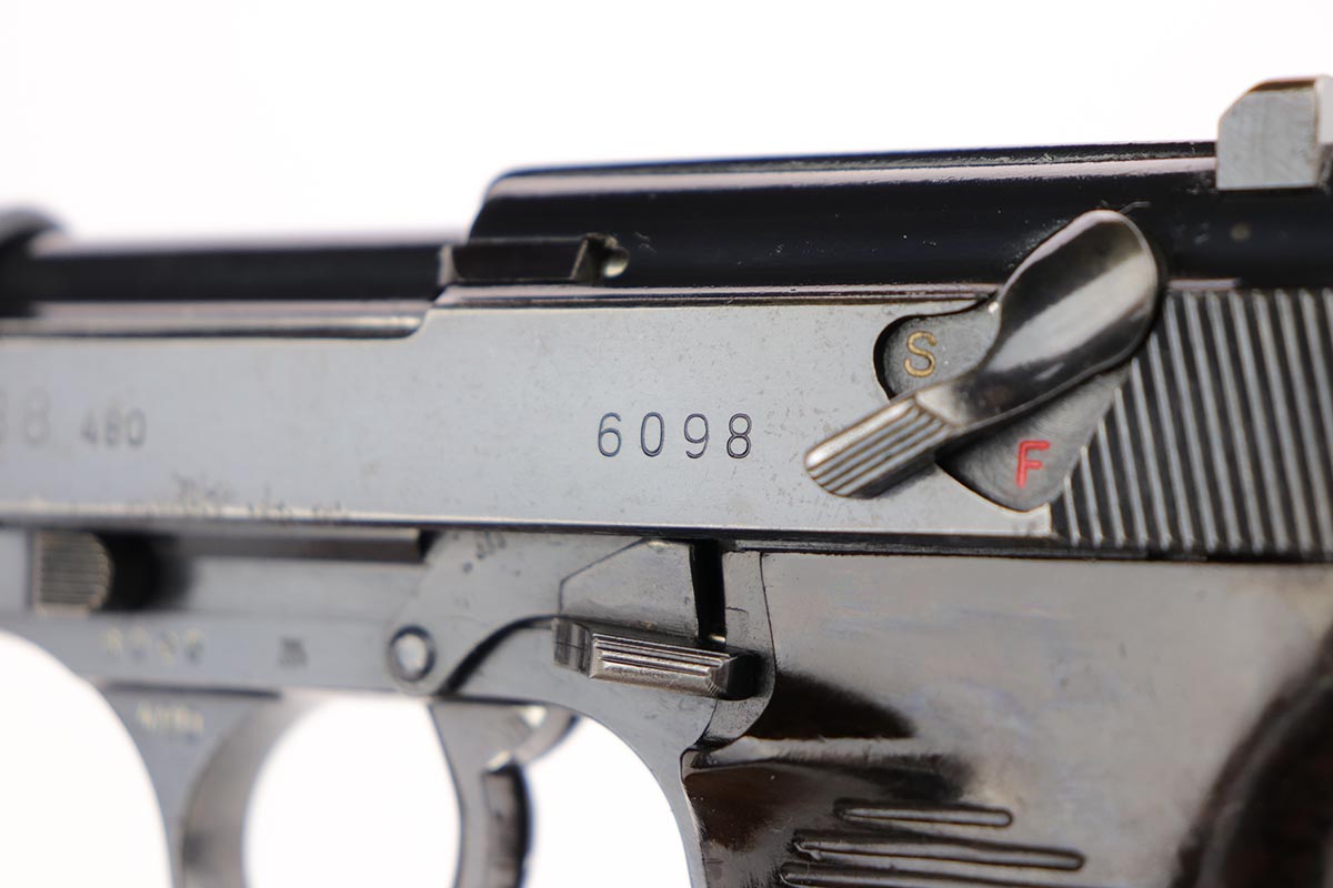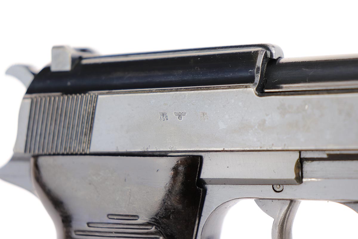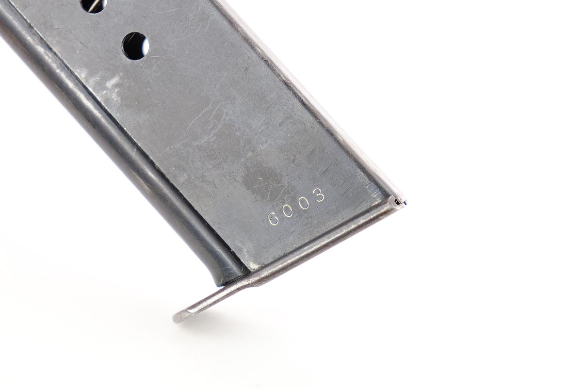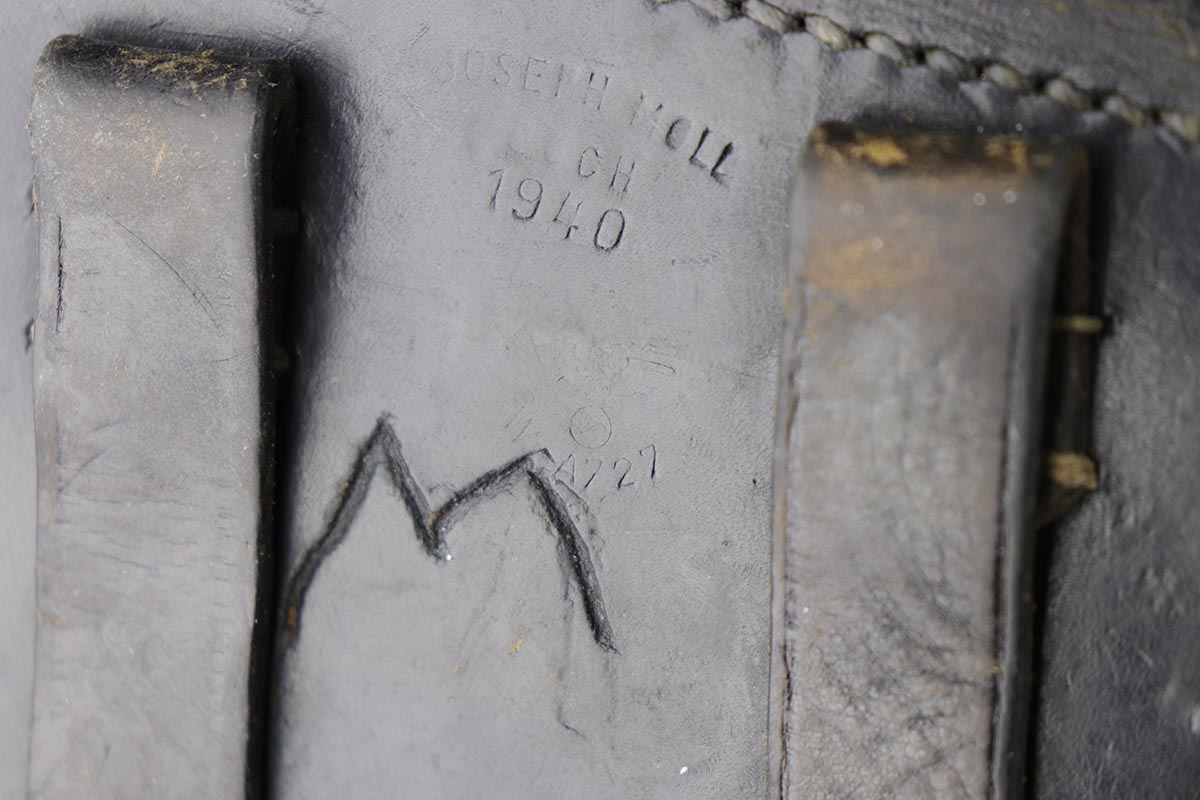2/14/20 – This is a rare and early Walther P.38 rig from 1940, one of only 7,000 produced with ‘480’ code on frame/slide. The pistol is all matching and original, including the grips. The finish rates at about 80+% with the majority of wear on the front strap, but some pitting along the edges on the left side of the slide. All small parts correctly have the Walther inspection stamp. One of the magazines is an early variant with serial on the left side of the body and side by side Walther stamps on the spine. Both magazines are numbered, though neither match this pistol. Pistol has an excellent bore and proper mechanics. The rig is completed by a rare hardshell holster that is 1940 dated. It’s in great condition aside from two symbols or initials that were carved into the back.