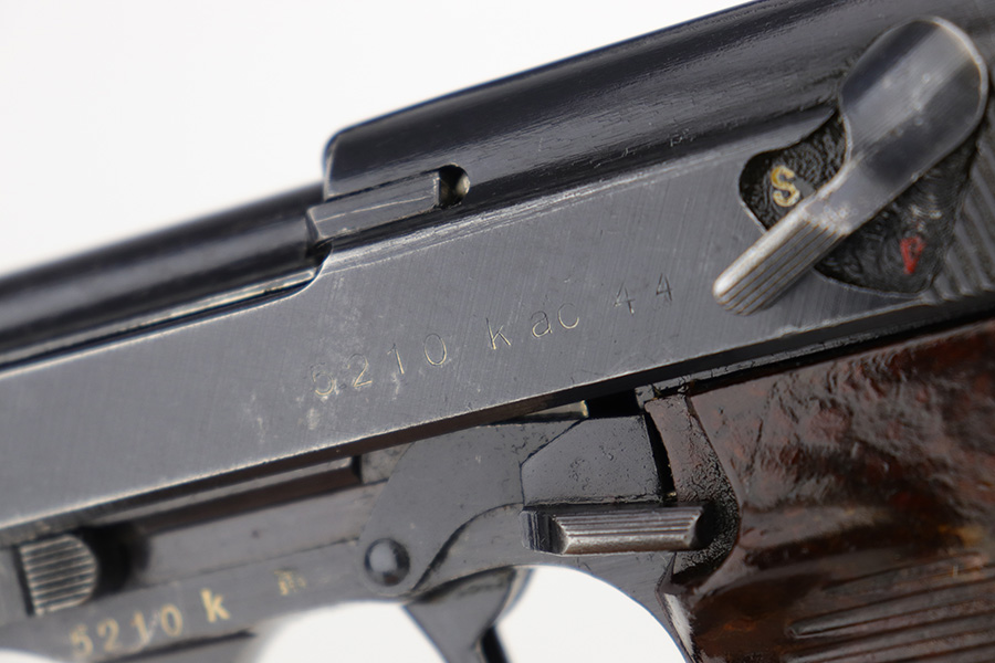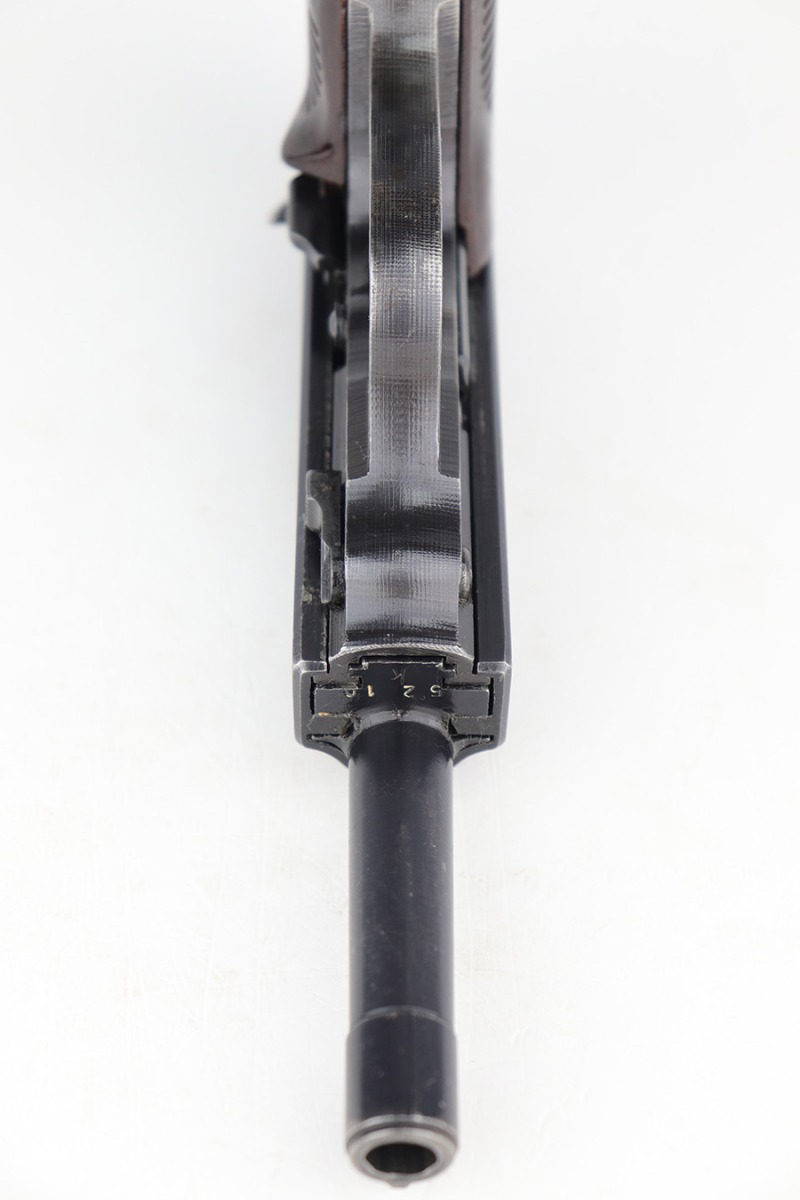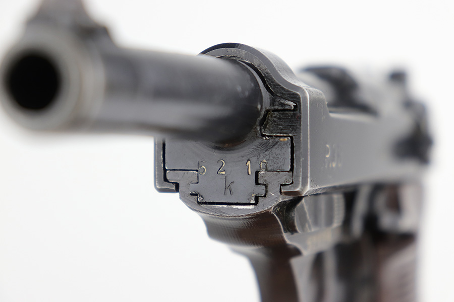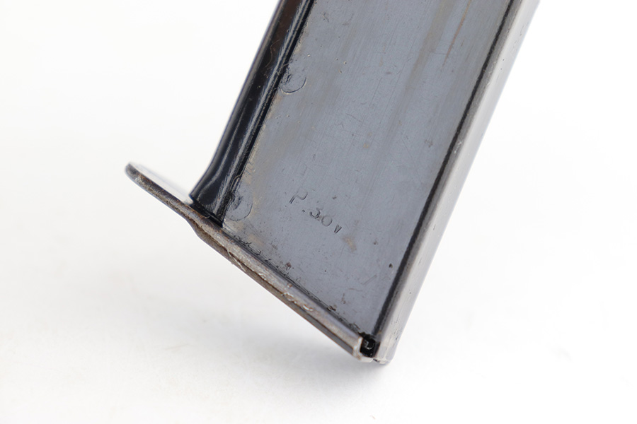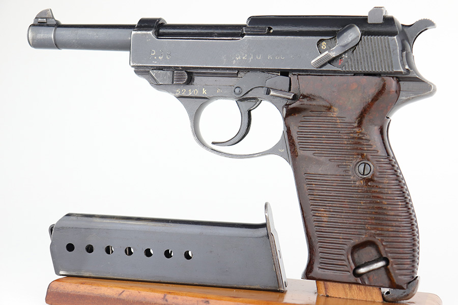 1/5/23 – This is a very nice example of a Walther P.38 from November of 1944 with rare eagle marking on trigger guard. We get maybe one or two of these per year, and this one has about 93-94% of the original blue remaining. All matching numbers. Some high edge wear on slide and muzzle, and a little thinning of the front strap. There’s also a few minor patches of pinpricking on the left side of the slide/barrel. Excellent reddish grips, though the two panels are slightly different colors. Walther magazine.