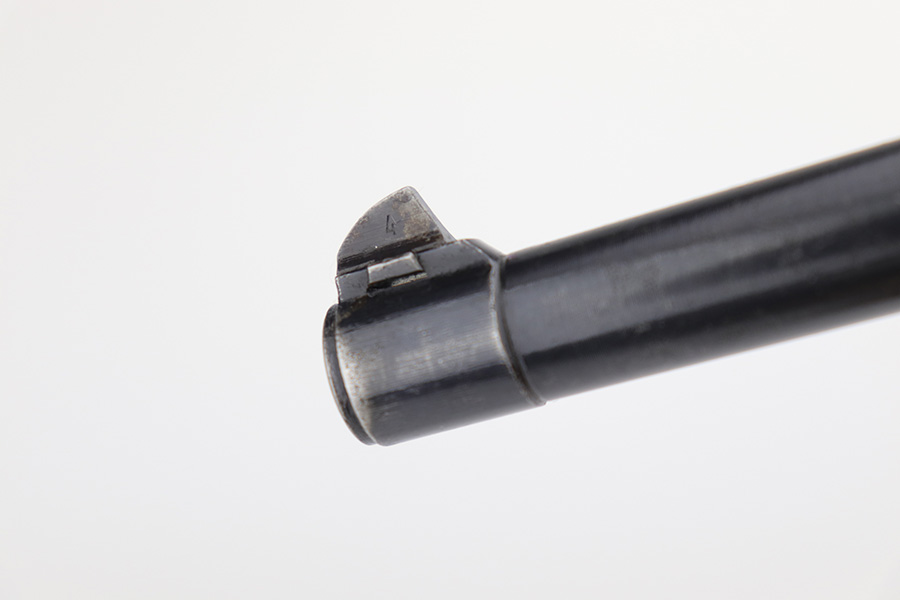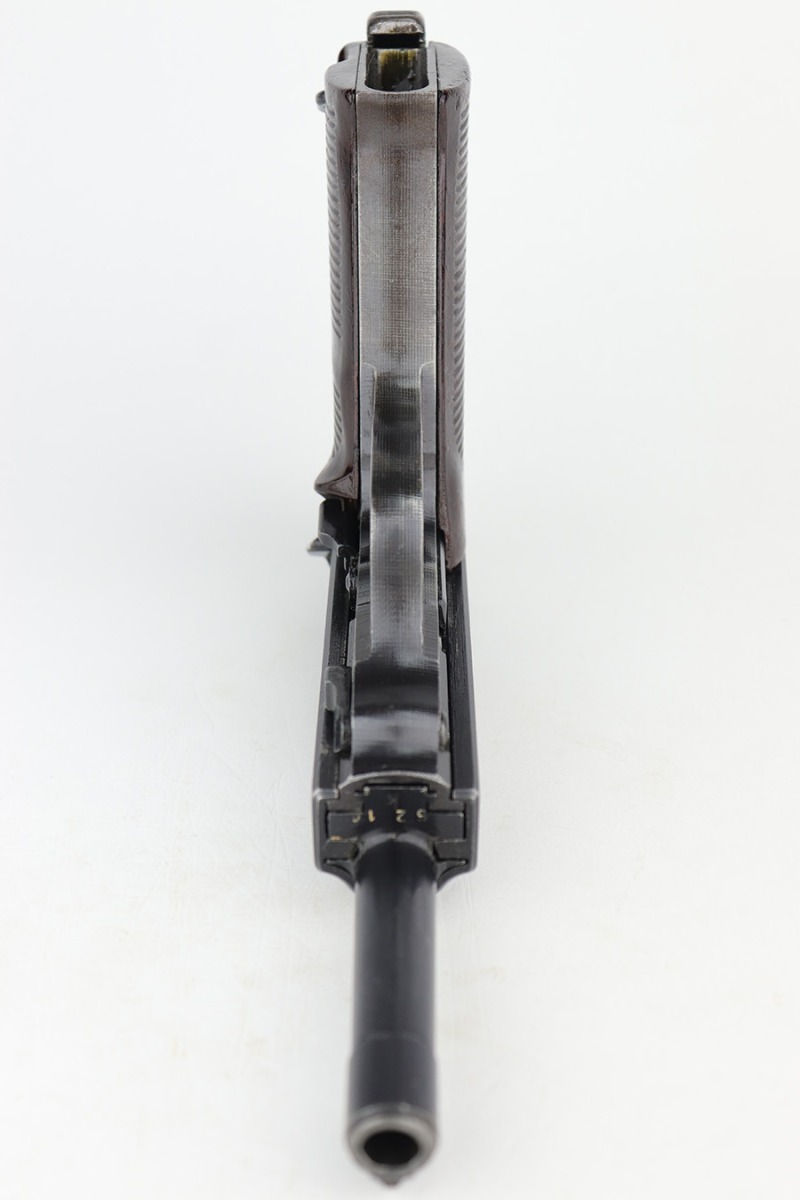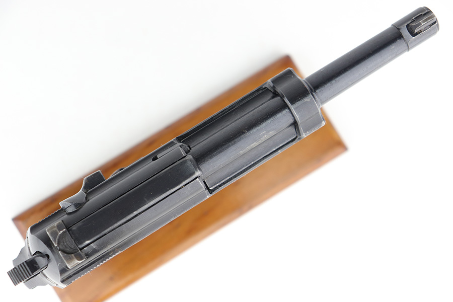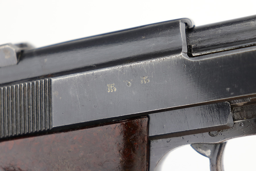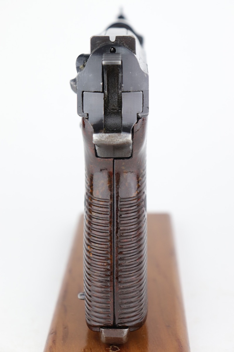 1/5/23 – This is a very nice example of a Walther P.38 from November of 1944 with rare eagle marking on trigger guard. We get maybe one or two of these per year, and this one has about 93-94% of the original blue remaining. All matching numbers. Some high edge wear on slide and muzzle, and a little thinning of the front strap. There’s also a few minor patches of pinpricking on the left side of the slide/barrel. Excellent reddish grips, though the two panels are slightly different colors. Walther magazine.