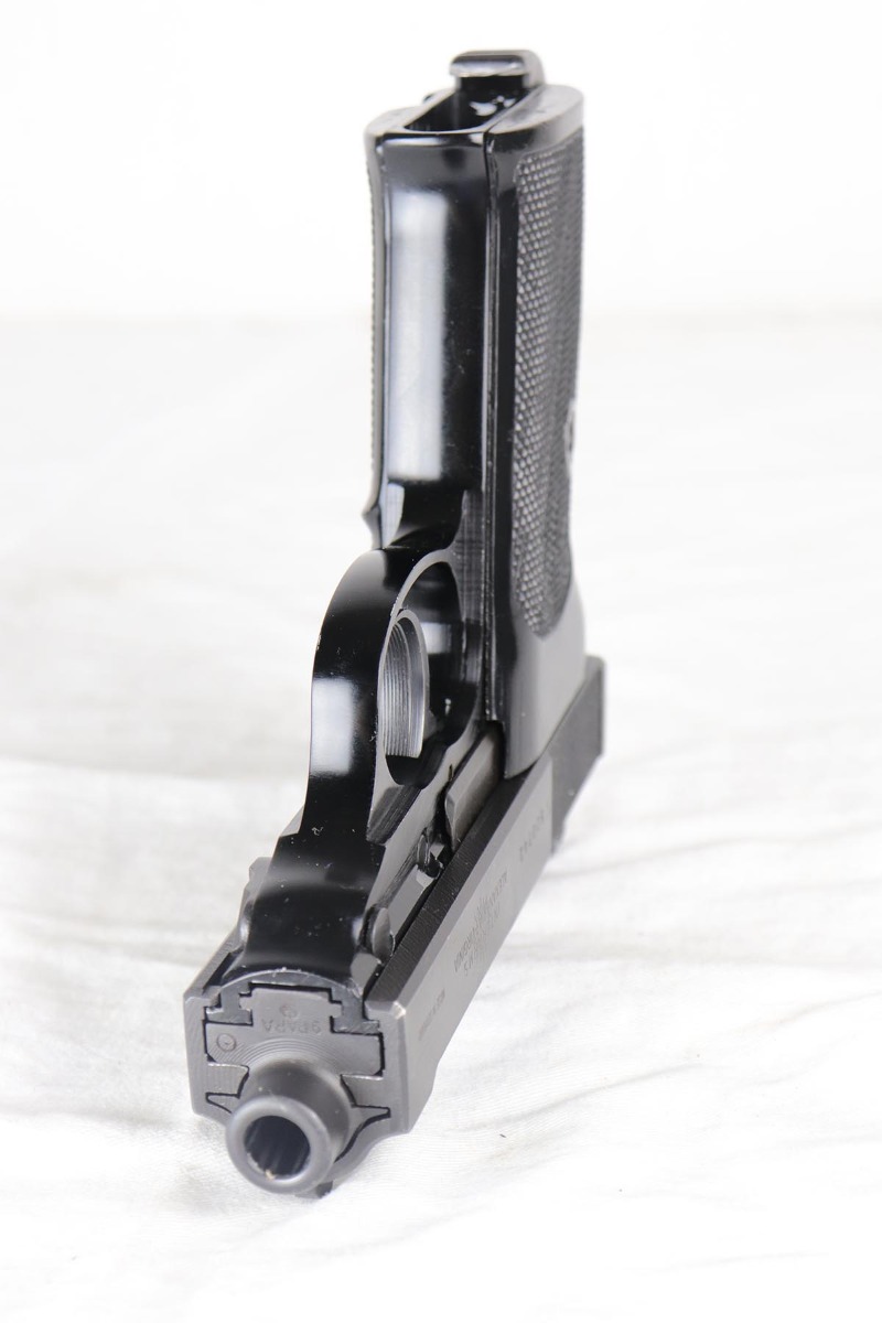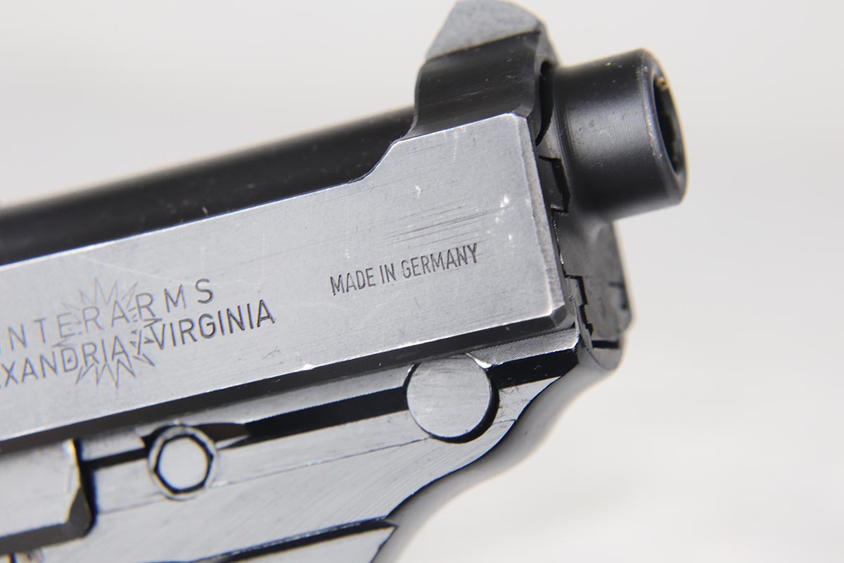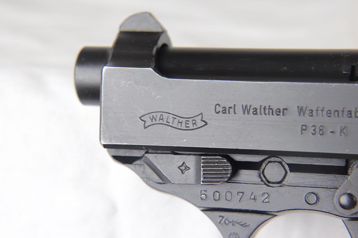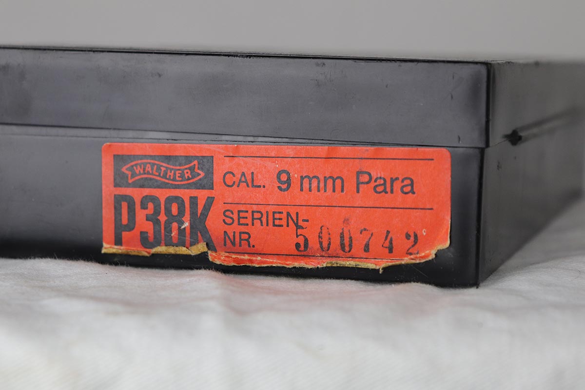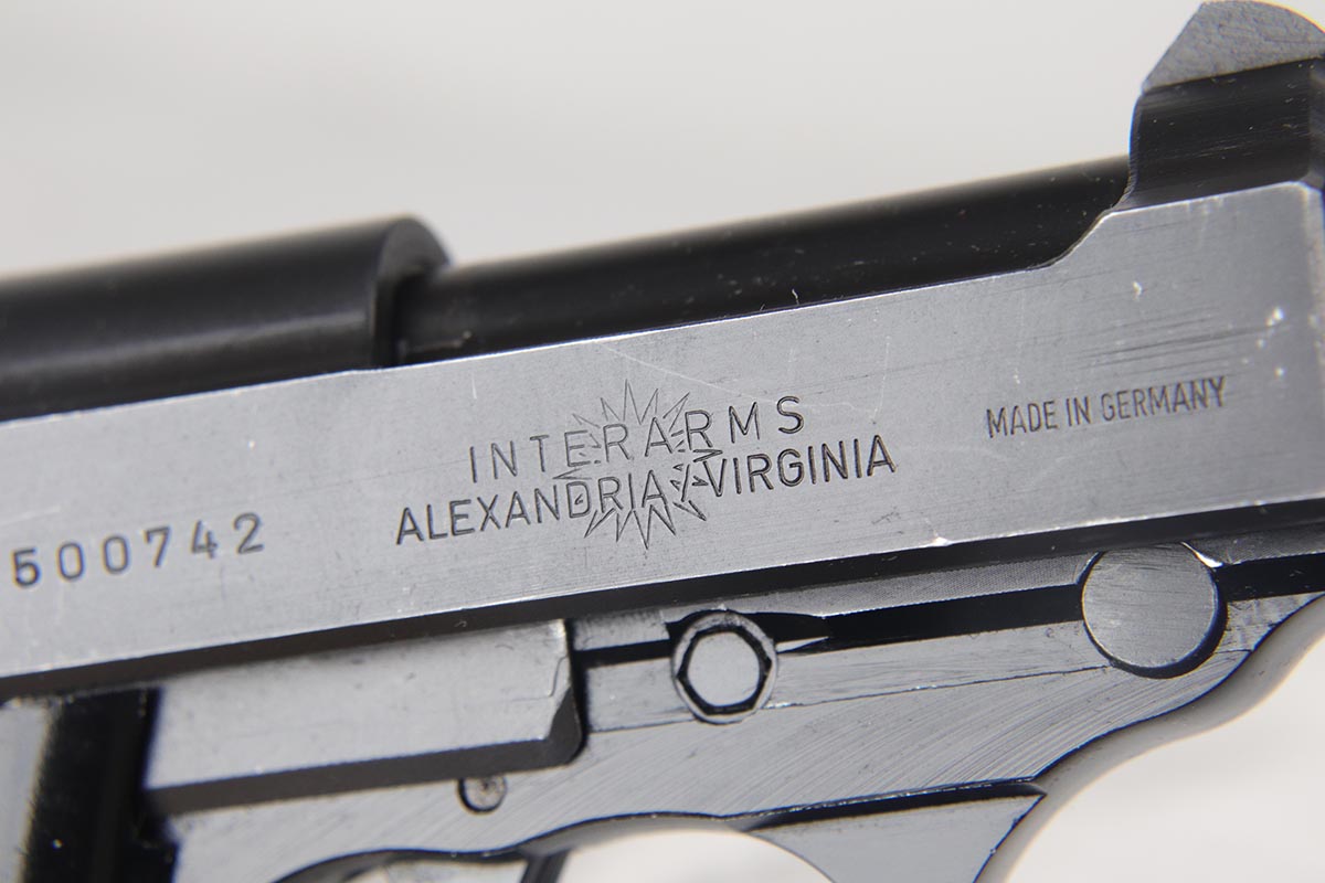 6/27/23 – This is a very scarce variant of Walther P38 pistol, made with a shortened 2.5 inch barrel in 1976 in West Germany. The gun is practically ‘as new in the box’ with just a few tiny spots of handling wear and mint grips and bore. Only 2,600 of these interesting pistols were made in the 1970’s and even fewer were actually imported into the US. This is a complete set with all the paperwork, test target, extra mag and a matching original box. All the markings are crisp with a West German proof marks and a date code present, alone with the Interarms marking.