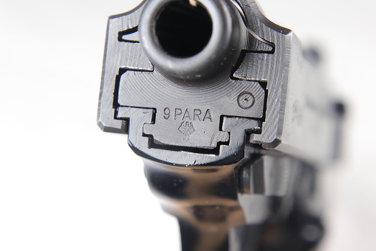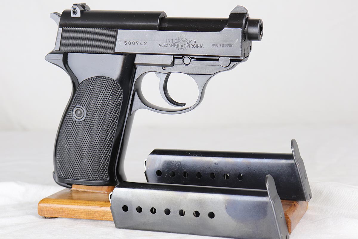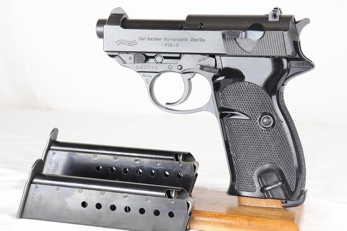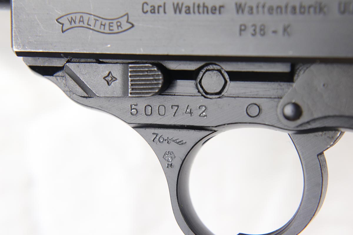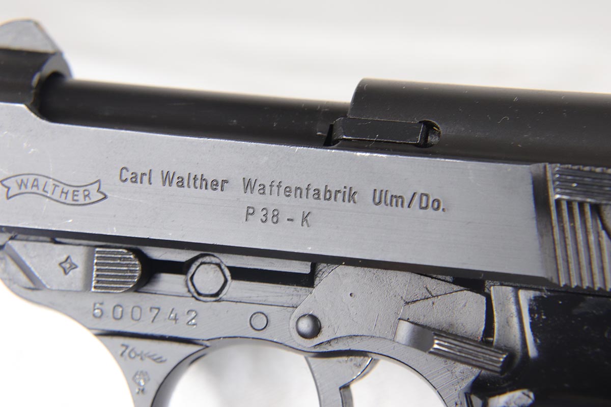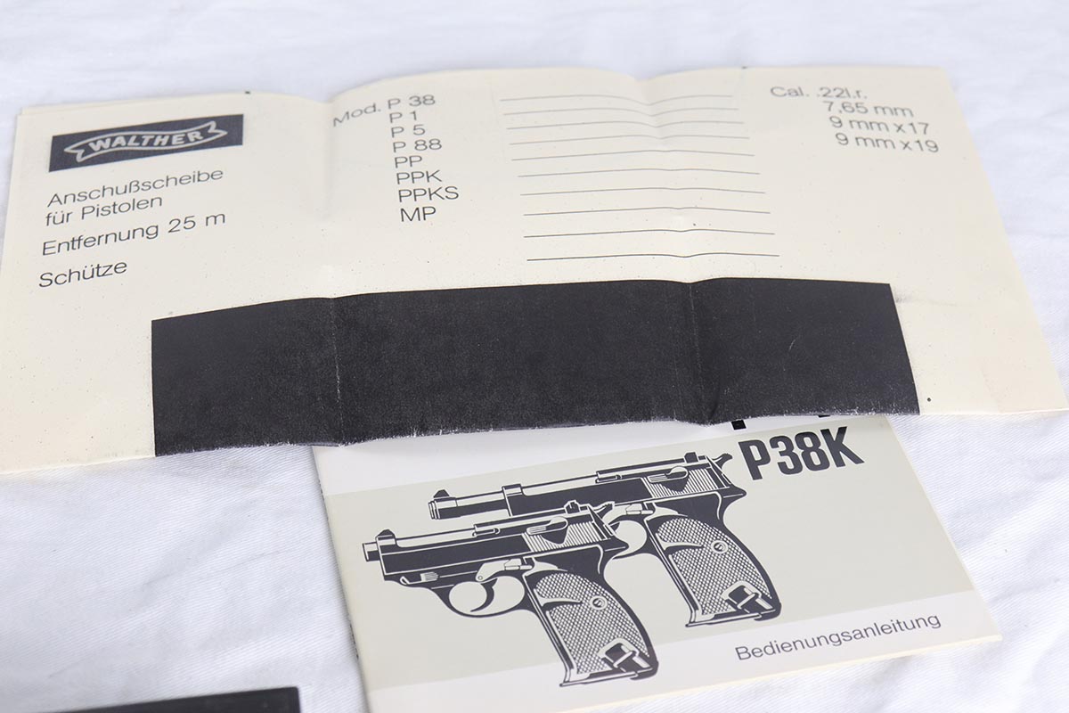 6/27/23 – This is a very scarce variant of Walther P38 pistol, made with a shortened 2.5 inch barrel in 1976 in West Germany. The gun is practically ‘as new in the box’ with just a few tiny spots of handling wear and mint grips and bore. Only 2,600 of these interesting pistols were made in the 1970’s and even fewer were actually imported into the US. This is a complete set with all the paperwork, test target, extra mag and a matching original box. All the markings are crisp with a West German proof marks and a date code present, alone with the Interarms marking.