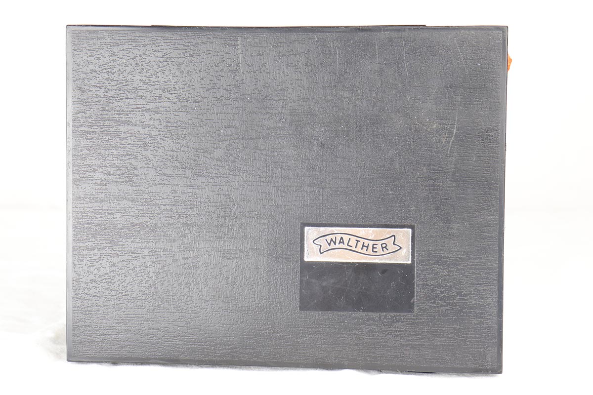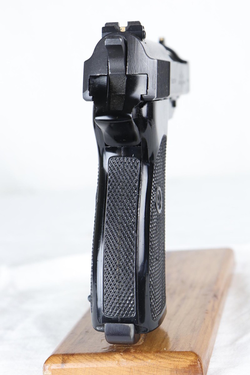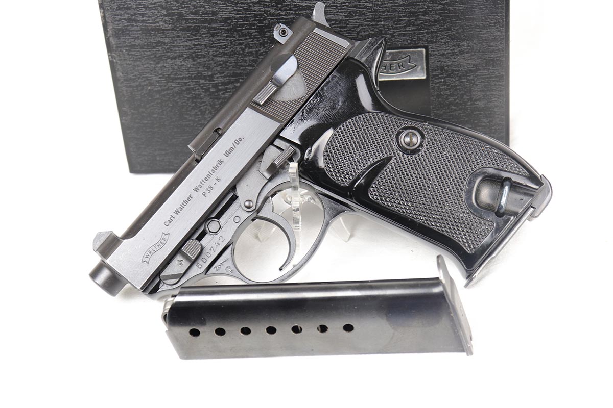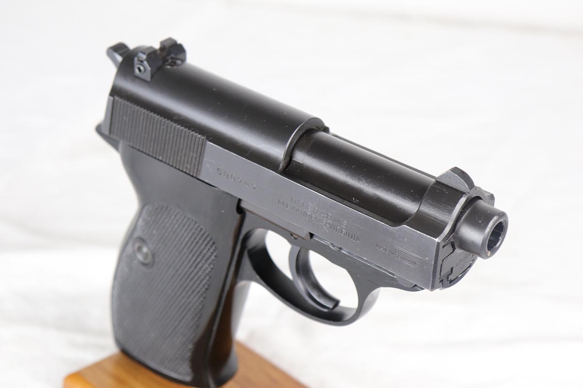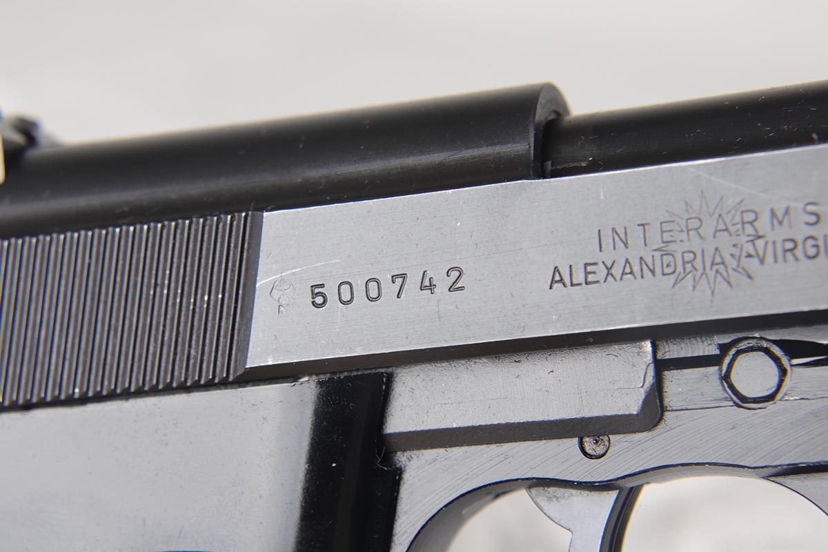 6/27/23 – This is a very scarce variant of Walther P38 pistol, made with a shortened 2.5 inch barrel in 1976 in West Germany. The gun is practically ‘as new in the box’ with just a few tiny spots of handling wear and mint grips and bore. Only 2,600 of these interesting pistols were made in the 1970’s and even fewer were actually imported into the US. This is a complete set with all the paperwork, test target, extra mag and a matching original box. All the markings are crisp with a West German proof marks and a date code present, alone with the Interarms marking.