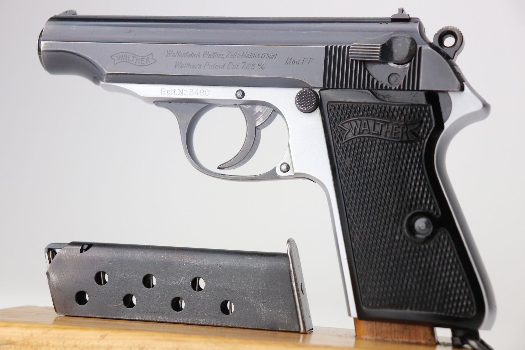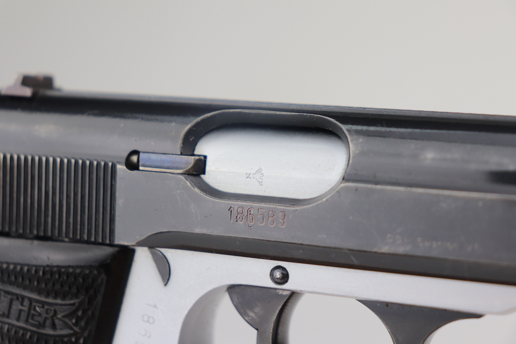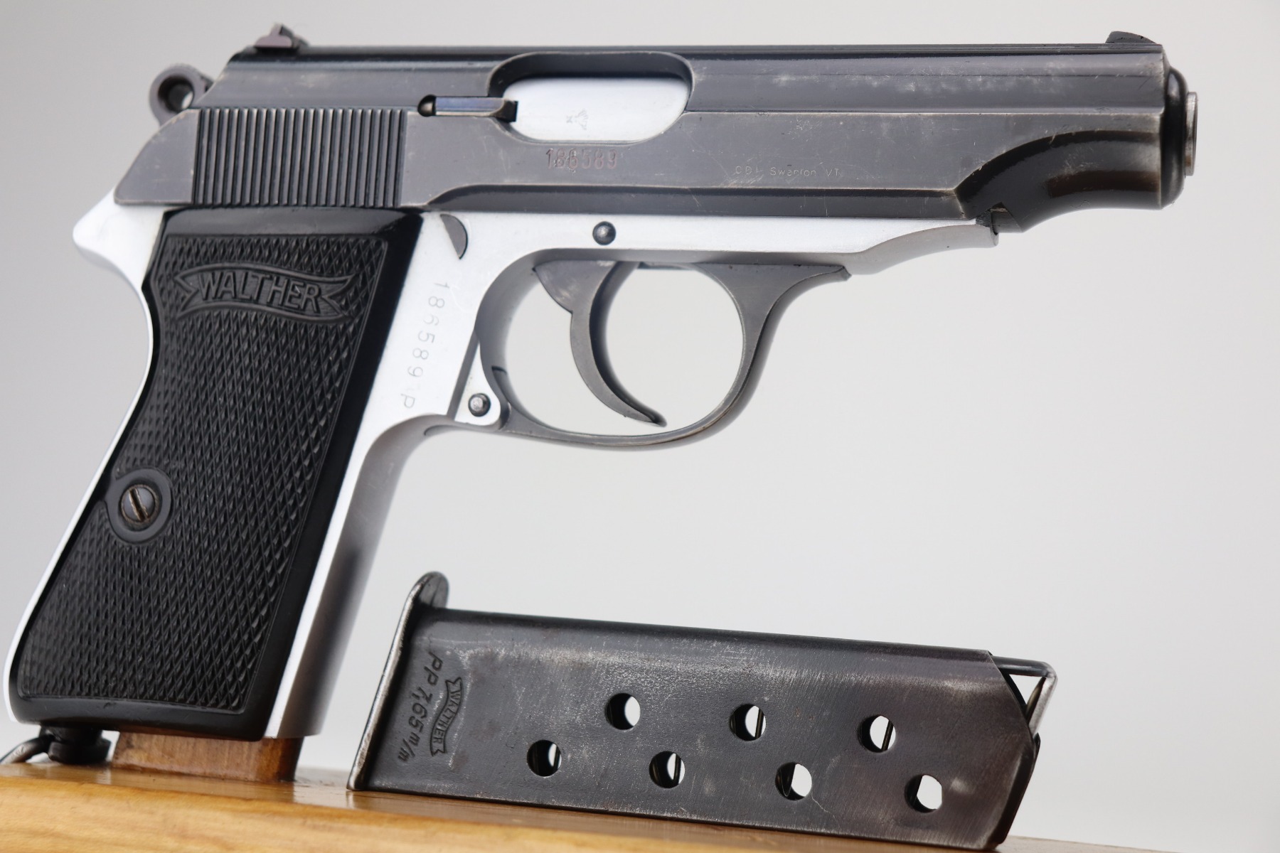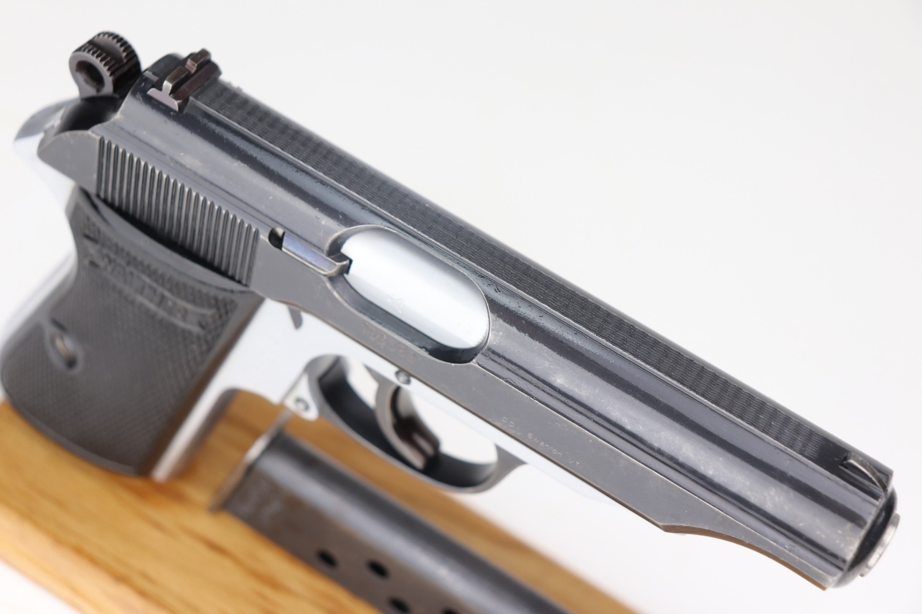 8/19/24 – This is an excellent example of a rare Walther PP that was ordered by and issued to the Danish Police force in 1940. In 1940, the the Danish Rigspolitiet purchased approx. 1,200 Walther PP pistols in the 182000p – 201000p serial number range with factory-installed lanyard rings. After they were received, they were engraved at the Danish Armory In Copenhagen with “RPLT” and a Inventory number. This one was also given a serial number on the slide. After being in police service for a number of years, it was common for them to have been refinished and given a dual-tone look. This one has a blued slide and a satin-chrome finish. It is all matching, has the proper “Eagle N” proofs, and has retained about 97% of its finish. There is minor muzzle wear and very light handling marks here and there. It comes with excellent grips and a wartime magazine. This one has a very small import mark on the right side of the slide. Mint bore.