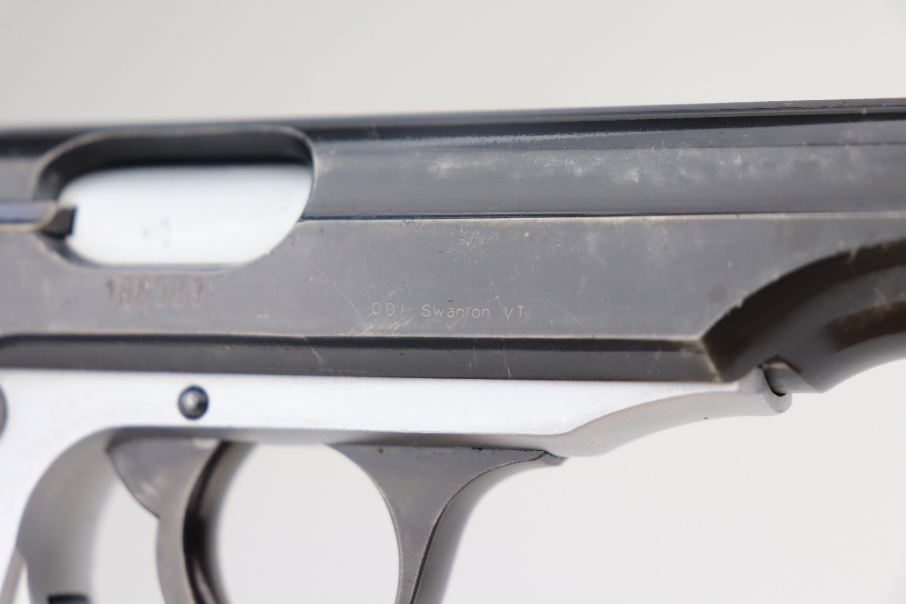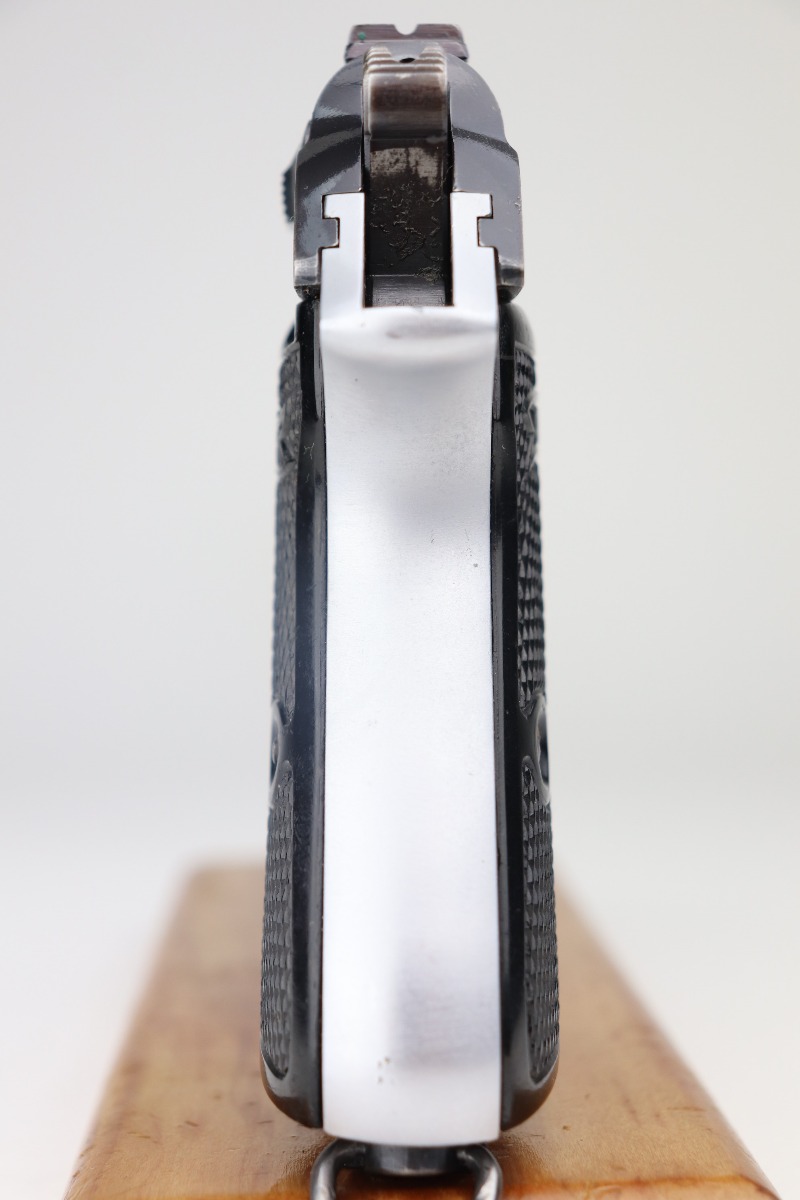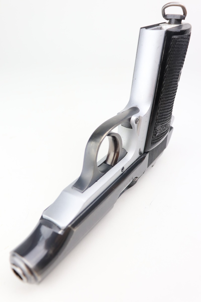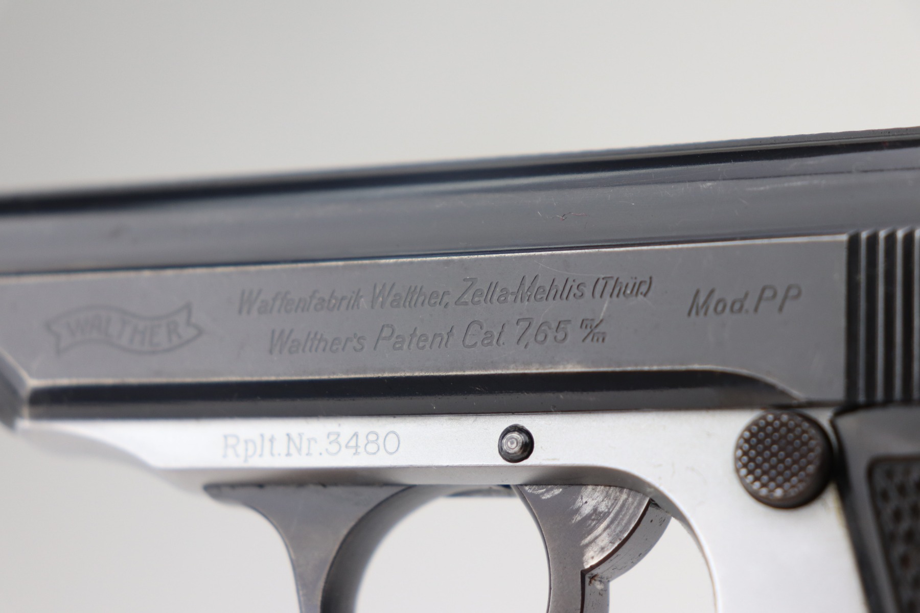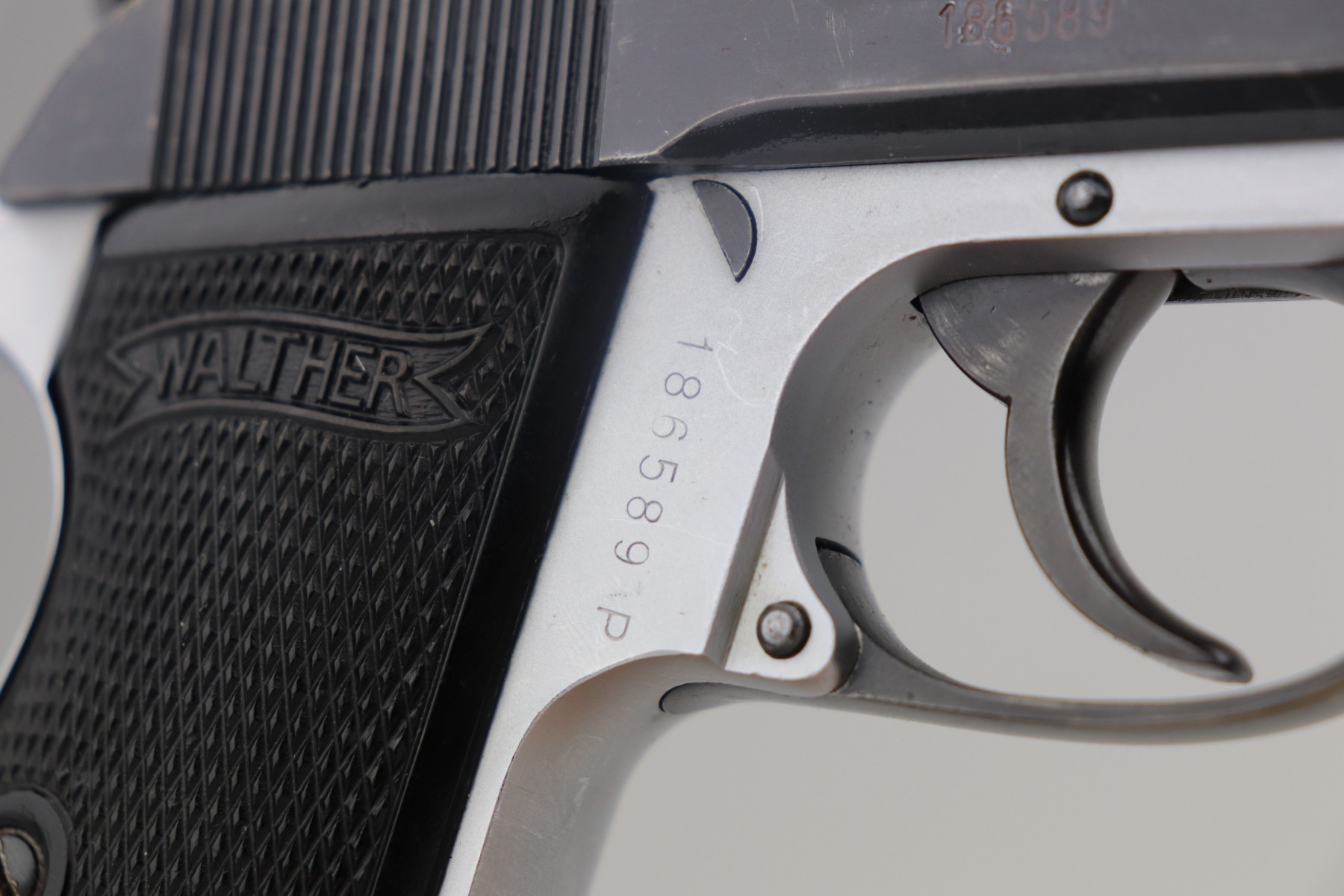 8/19/24 – This is an excellent example of a rare Walther PP that was ordered by and issued to the Danish Police force in 1940. In 1940, the the Danish Rigspolitiet purchased approx. 1,200 Walther PP pistols in the 182000p – 201000p serial number range with factory-installed lanyard rings. After they were received, they were engraved at the Danish Armory In Copenhagen with “RPLT” and a Inventory number. This one was also given a serial number on the slide. After being in police service for a number of years, it was common for them to have been refinished and given a dual-tone look. This one has a blued slide and a satin-chrome finish. It is all matching, has the proper “Eagle N” proofs, and has retained about 97% of its finish. There is minor muzzle wear and very light handling marks here and there. It comes with excellent grips and a wartime magazine. This one has a very small import mark on the right side of the slide. Mint bore.