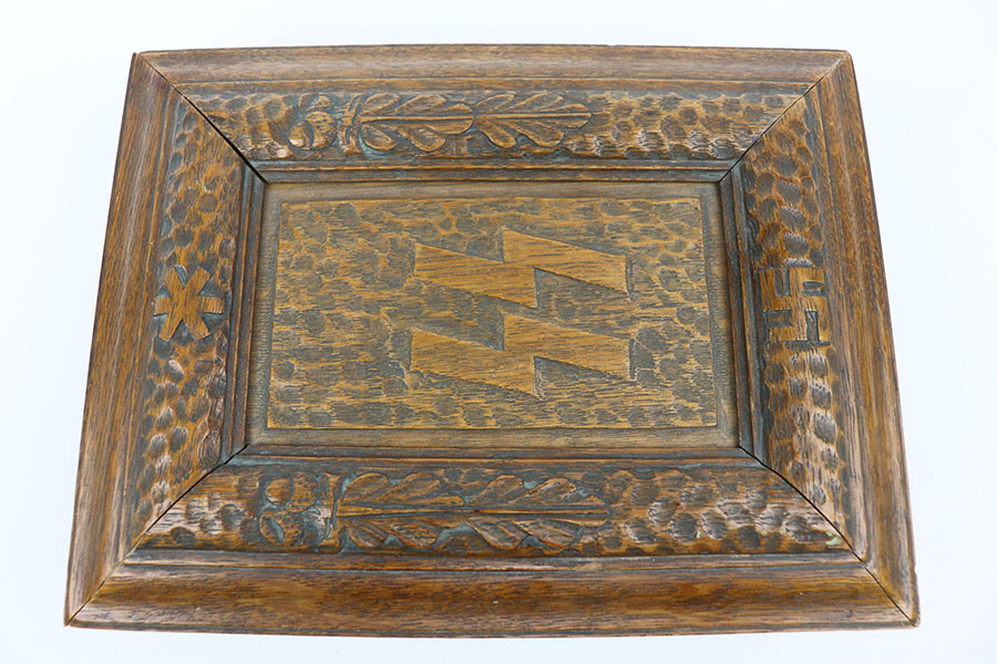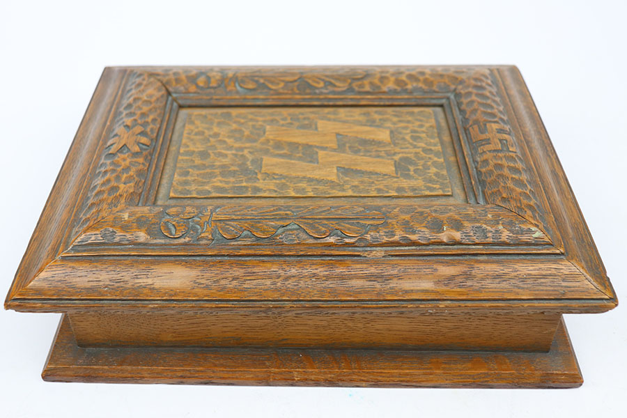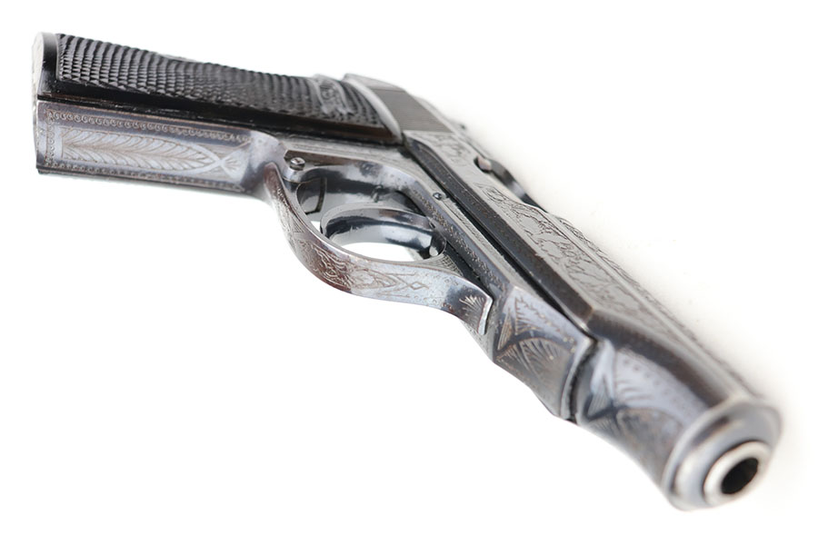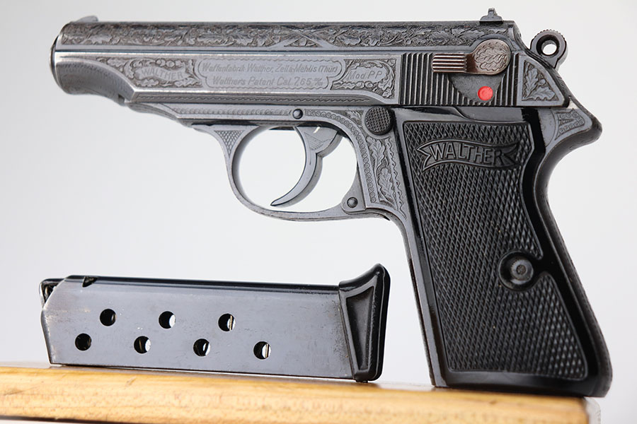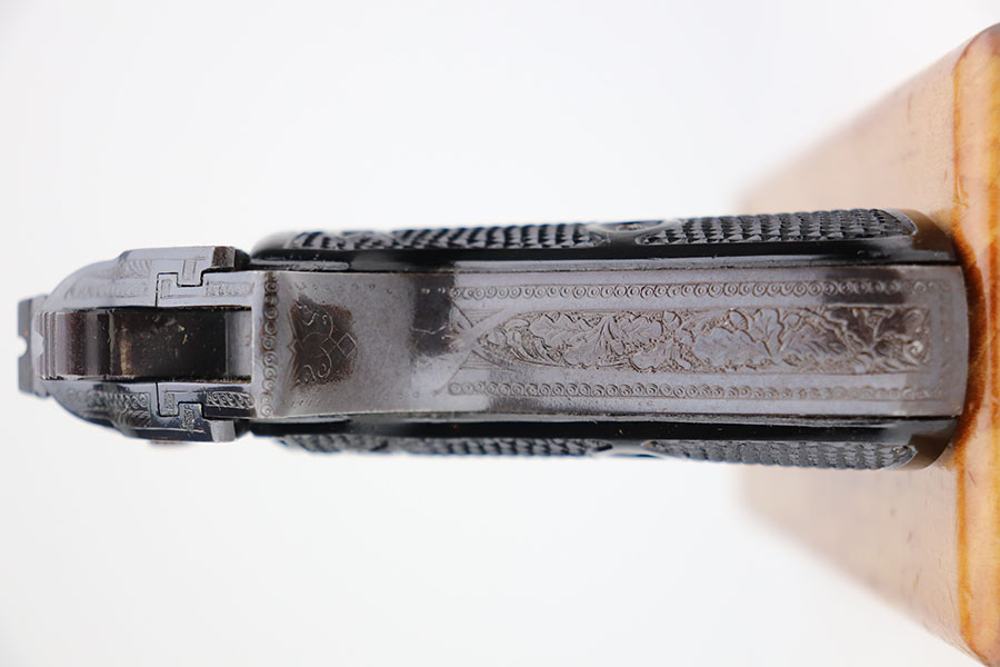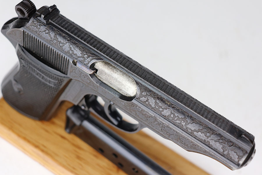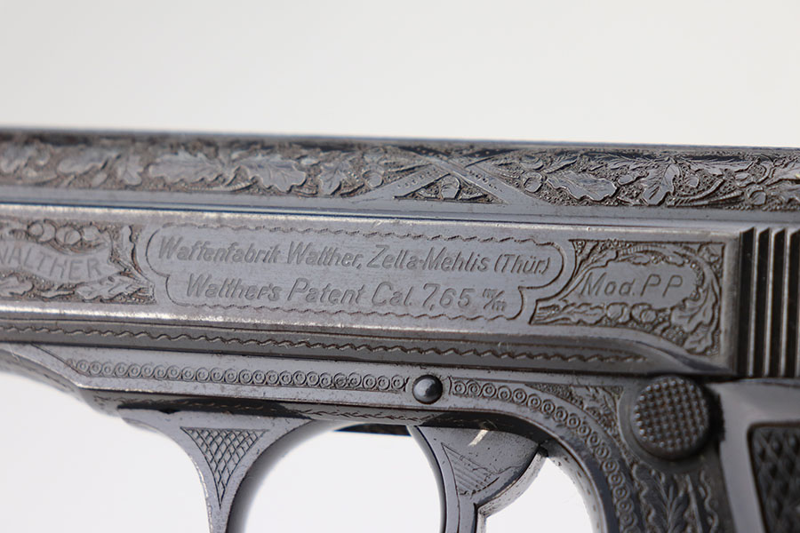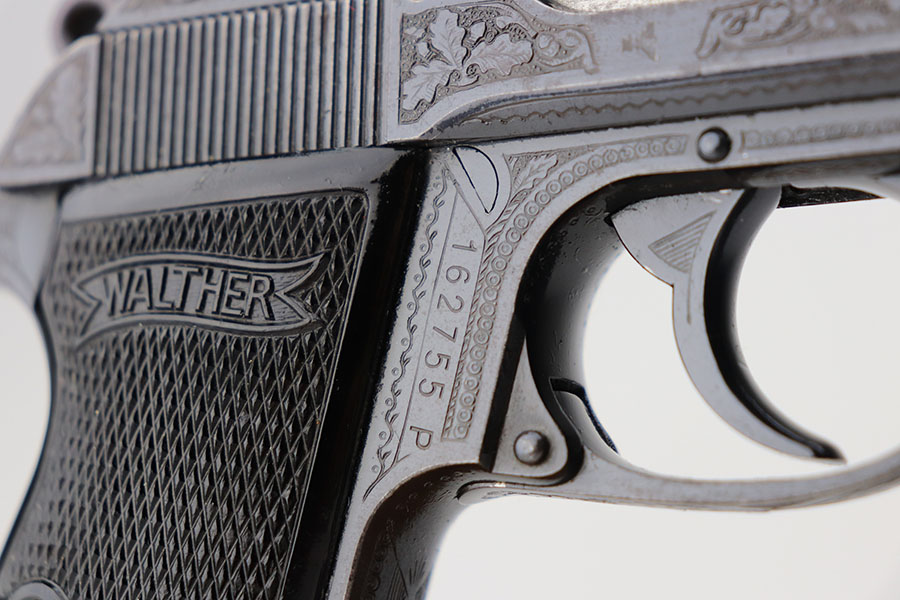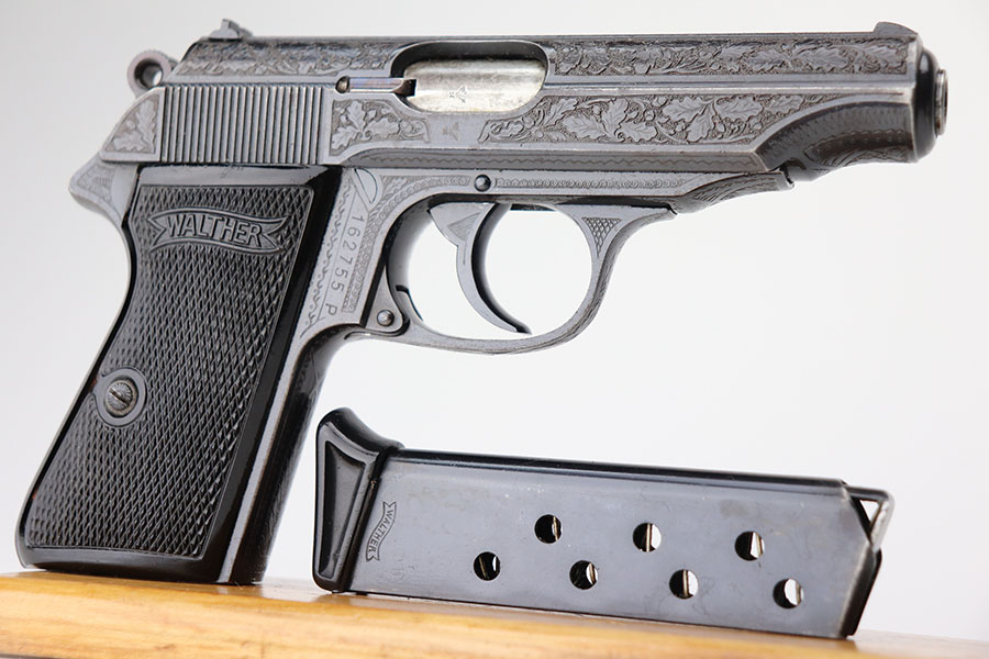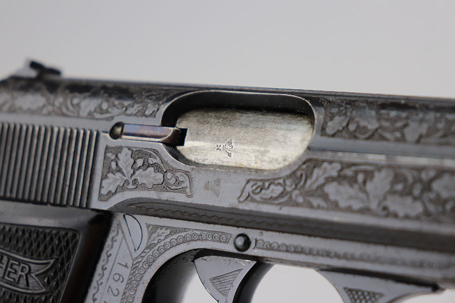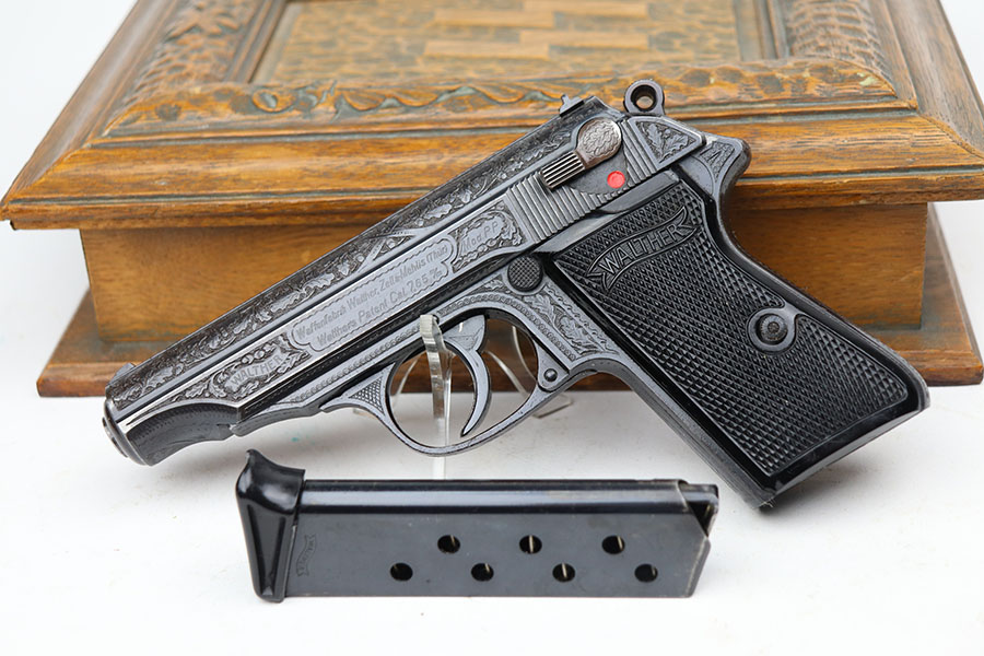 3/3/21 – This is a rare, factory engraved Walther PP from 1940 in terrific, original condition. The pistol falls in a small range of factory engraved examples, and is one of only a few hundred ever made. The pistol features the oak leaf and acorn style Germanic engraving. The bluing rates at 98-99% with just a hint of muzzle wear on each side. Excellent grips with no chips or cracks. Early banner magazine with finger extension. Minty bore. Comes with a custom box of unknown origin which has SS runes and a swastika on it.
