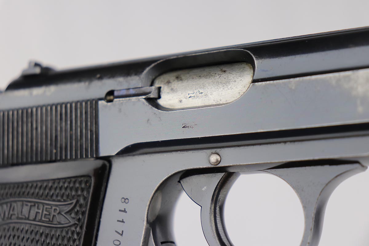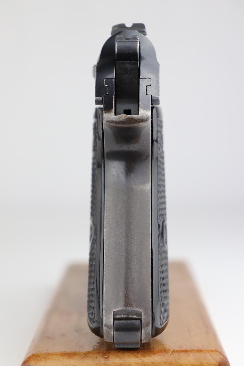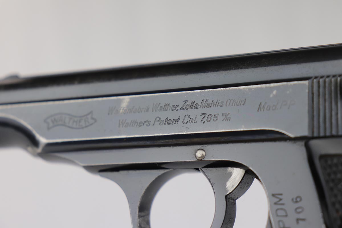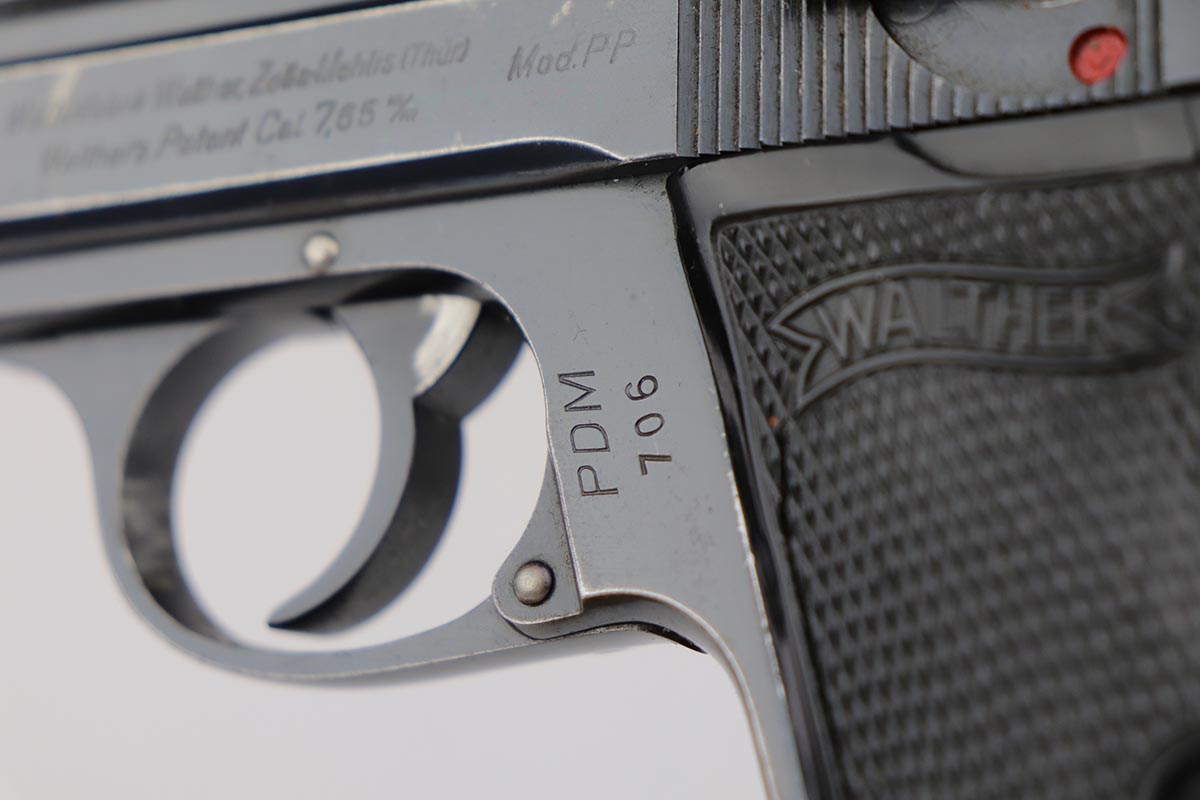 7/17/19 – This is a rare PDM Walther PP, manufactured around 1935. The pistol is all correct and original, and the bluing rates at about 85% with the majority of finish loss found on the straps, as well as some natural slide wear. In 1935, Himmler ordered about 1800 PDM marked PP’s as head of all German Internal Security. PDM stands for Police Department of Munich, and the order was unique for the following reasons. These pistols came with a bottom release magazine, while all other 7.65mm PP’s had a push button mag release. The proper PDM magazine will have no notch for the push button release, which the magazine in this listing shows. These pistols also have a strengthened ‘fluted’ barrel, visible on the muzzle end of the barrel, which a standard PP slide would not fit. This pistol falls in the correct serial range. Excellent bore. Left grip panel has a crack near the edge, and finger extension has a few dings and nicks.