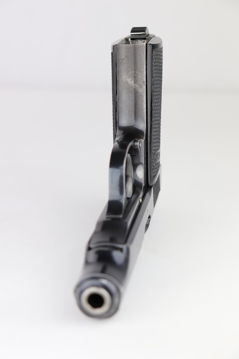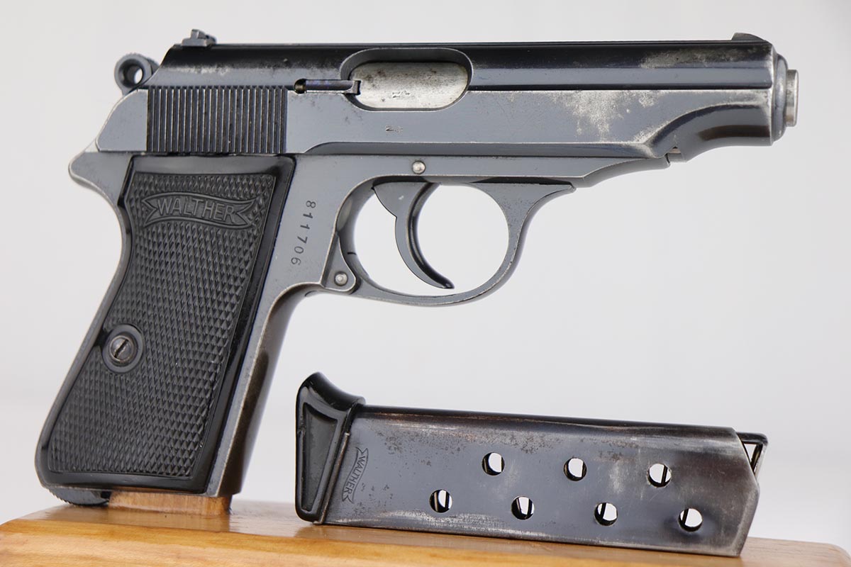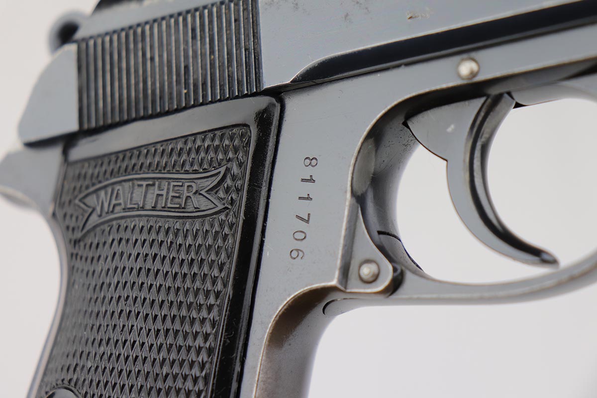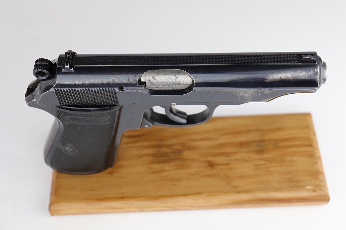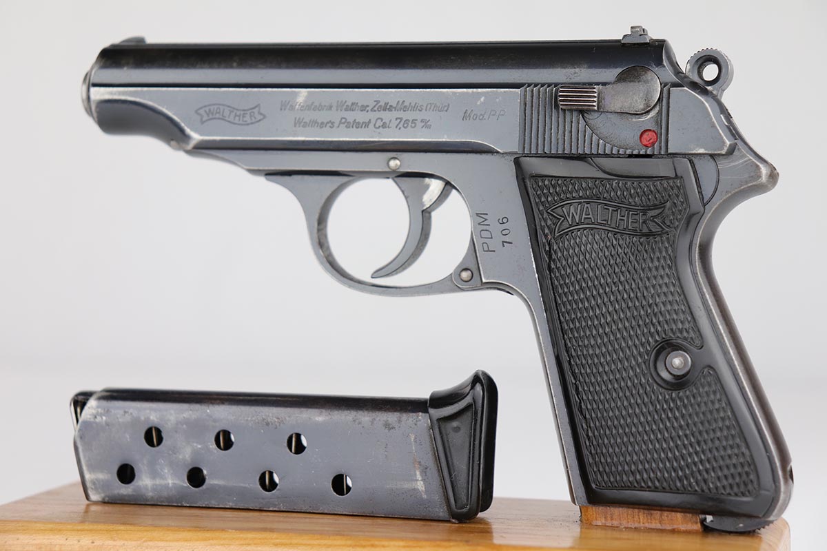 7/17/19 – This is a rare PDM Walther PP, manufactured around 1935. The pistol is all correct and original, and the bluing rates at about 85% with the majority of finish loss found on the straps, as well as some natural slide wear. In 1935, Himmler ordered about 1800 PDM marked PP’s as head of all German Internal Security. PDM stands for Police Department of Munich, and the order was unique for the following reasons. These pistols came with a bottom release magazine, while all other 7.65mm PP’s had a push button mag release. The proper PDM magazine will have no notch for the push button release, which the magazine in this listing shows. These pistols also have a strengthened ‘fluted’ barrel, visible on the muzzle end of the barrel, which a standard PP slide would not fit. This pistol falls in the correct serial range. Excellent bore. Left grip panel has a crack near the edge, and finger extension has a few dings and nicks.