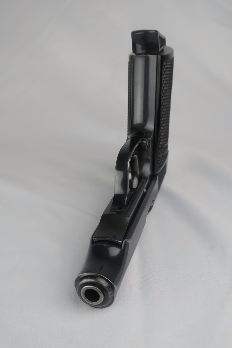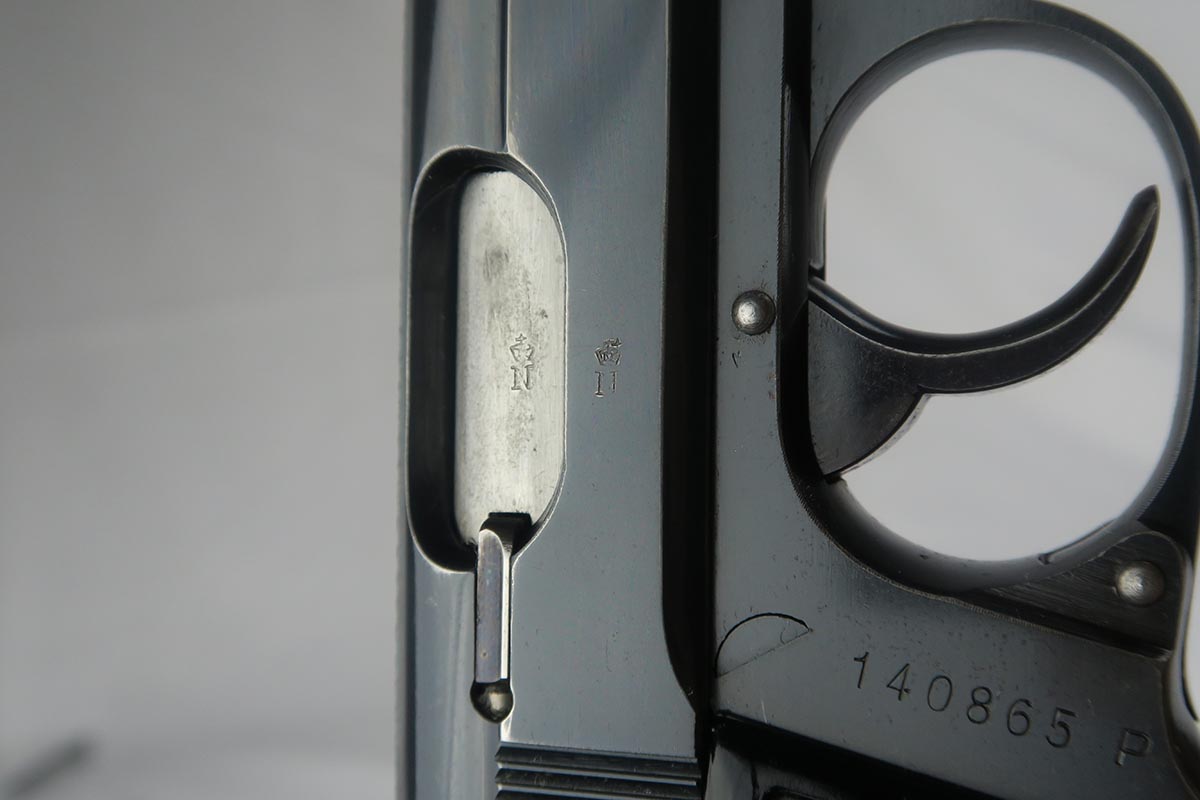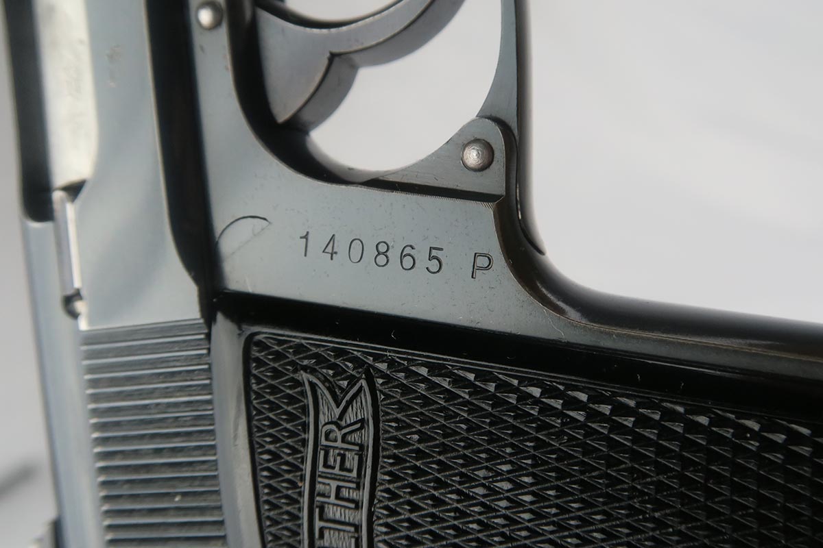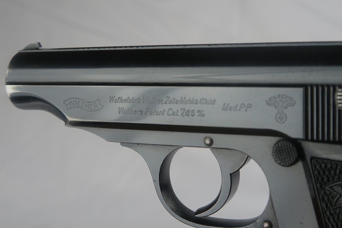 9/12/17 – This is a nice, rare Walther PP from the WW2 era.  It is NSKK marked and issued, which was the designated official transportation branch of the NSDAP.  There were about 3,500 such pistols issued, and ~100 reported serials. This pistol is all original and correct with about 95-96% blue remaining.  The majority of the finish loss is found on either side of the muzzle, and on the bottom of the back strap.  Excellent grips and magazine.  Crown/N proofs on slide and frame.  Minty bore.