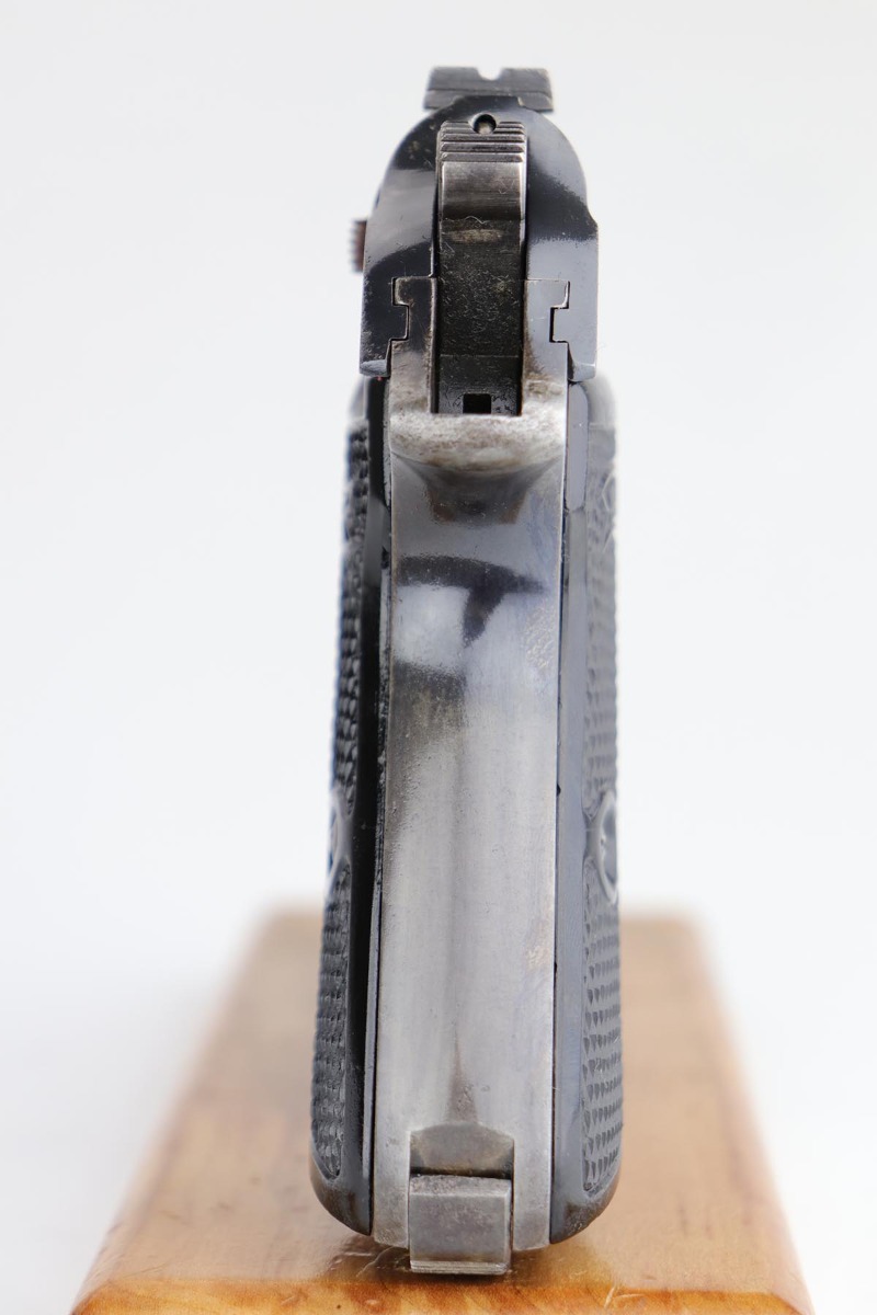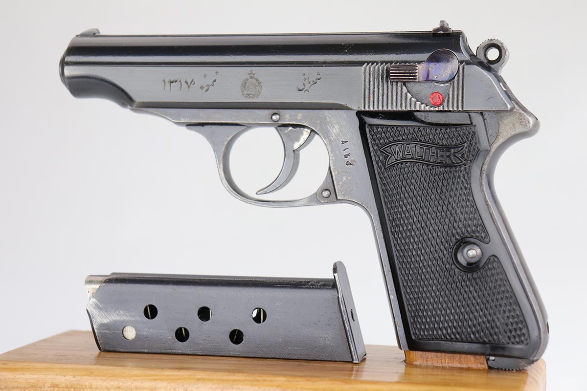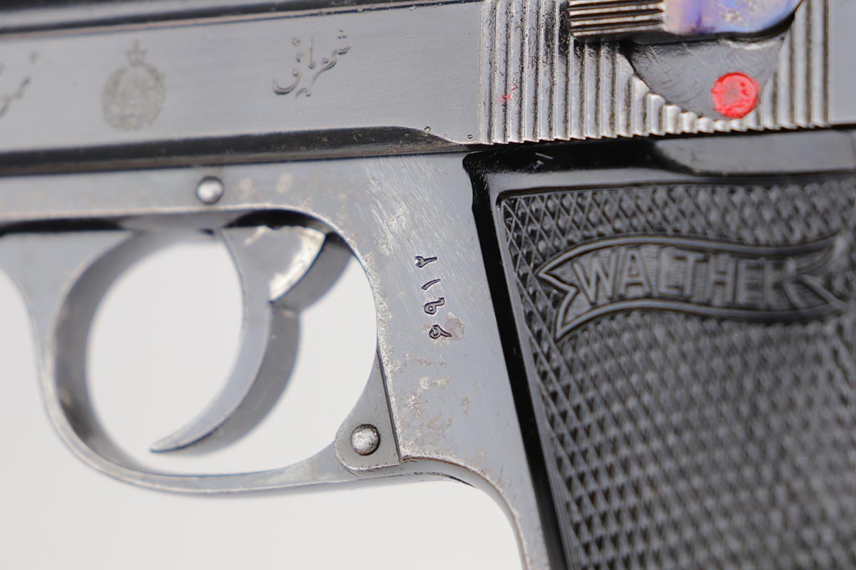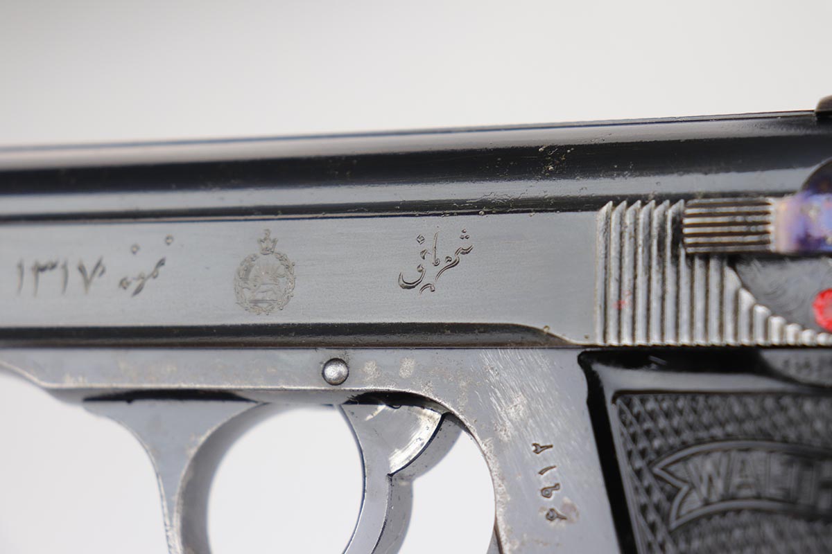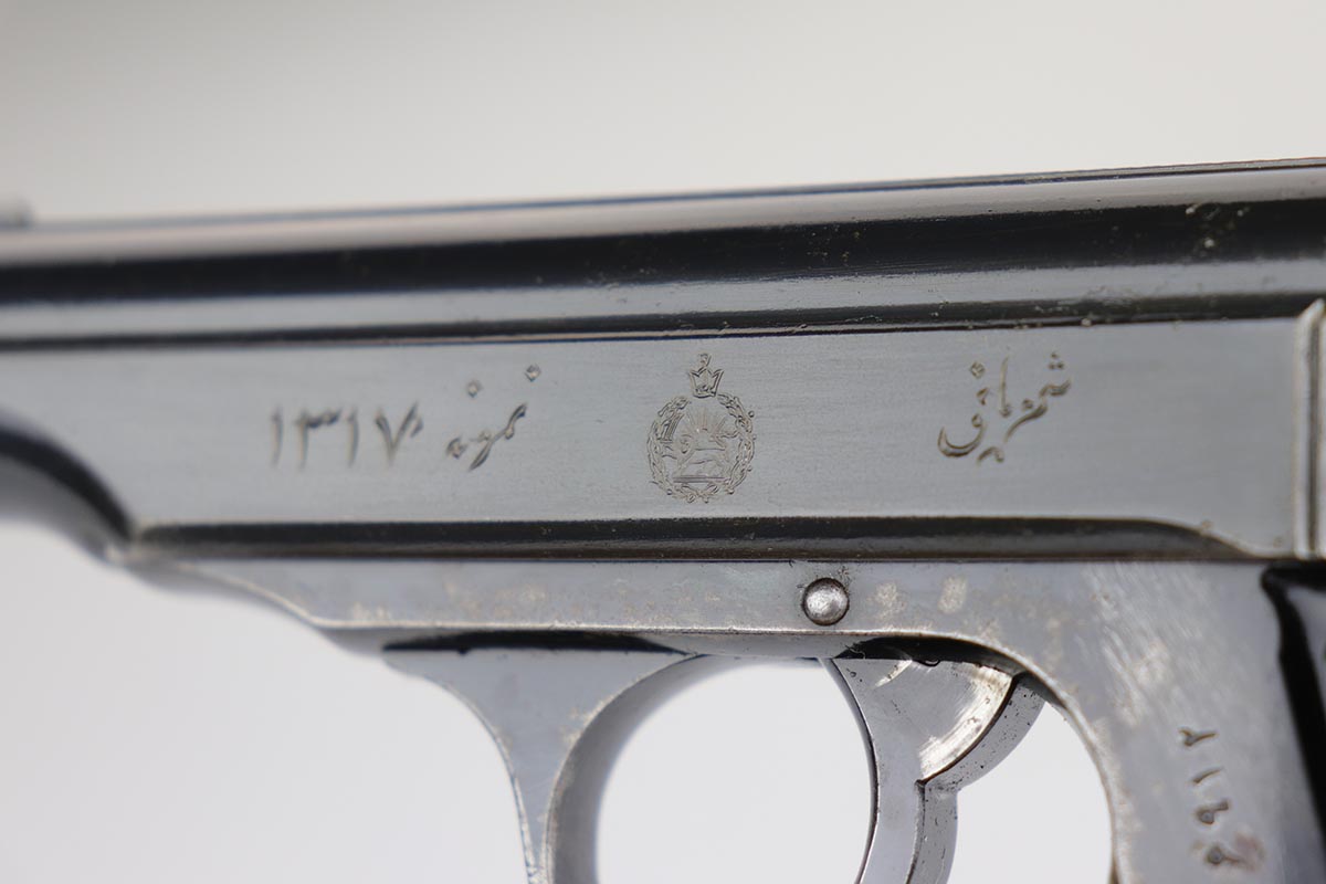 2/26/20 – This is a very rare Walther PP that was manufactured in 1938 and sent to Persia as part of a contract order, potentially for either the police or military. This is one of only about 2,000 produced. The pistol is all original, with Farsi legend and markings on left side slide and frame, and the Walther legend on the right side. These pistols were also chambered in the more rare and desirable 9mm Kurz. The high-polish blue is original and the pistol has a nice profile, but notable thinning/browning on the straps. There is some freckling on the left side of the frame, and right side slide. Minty bore. Excellent grips.
