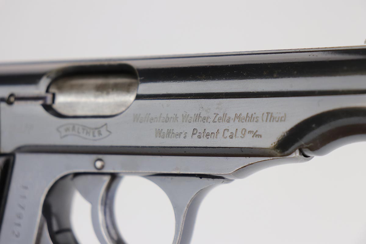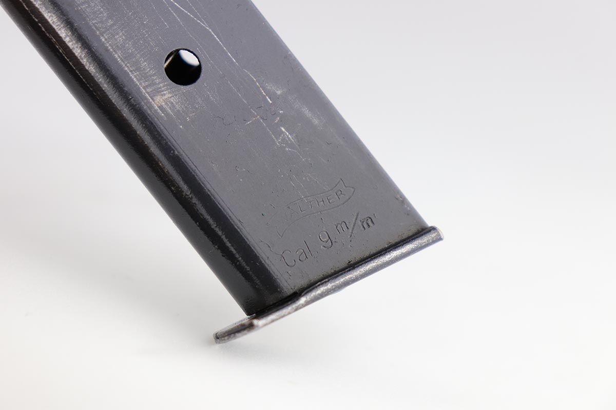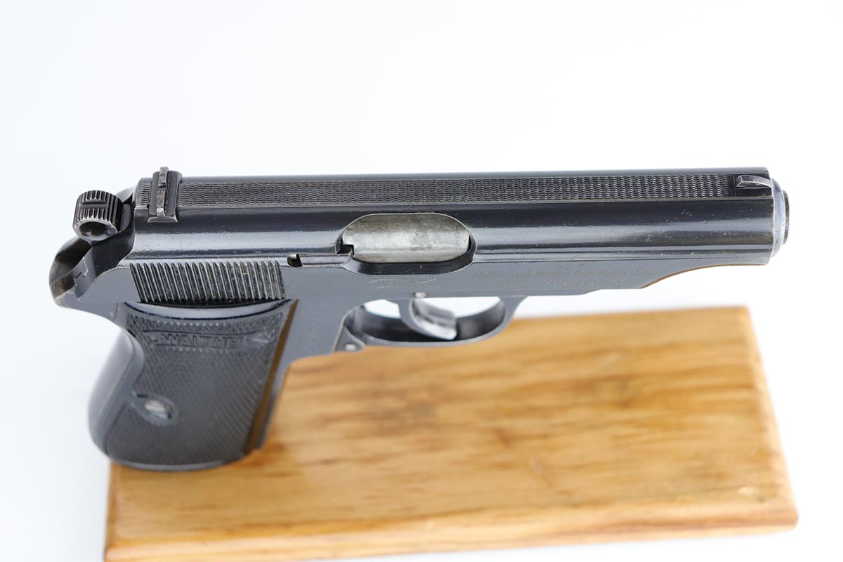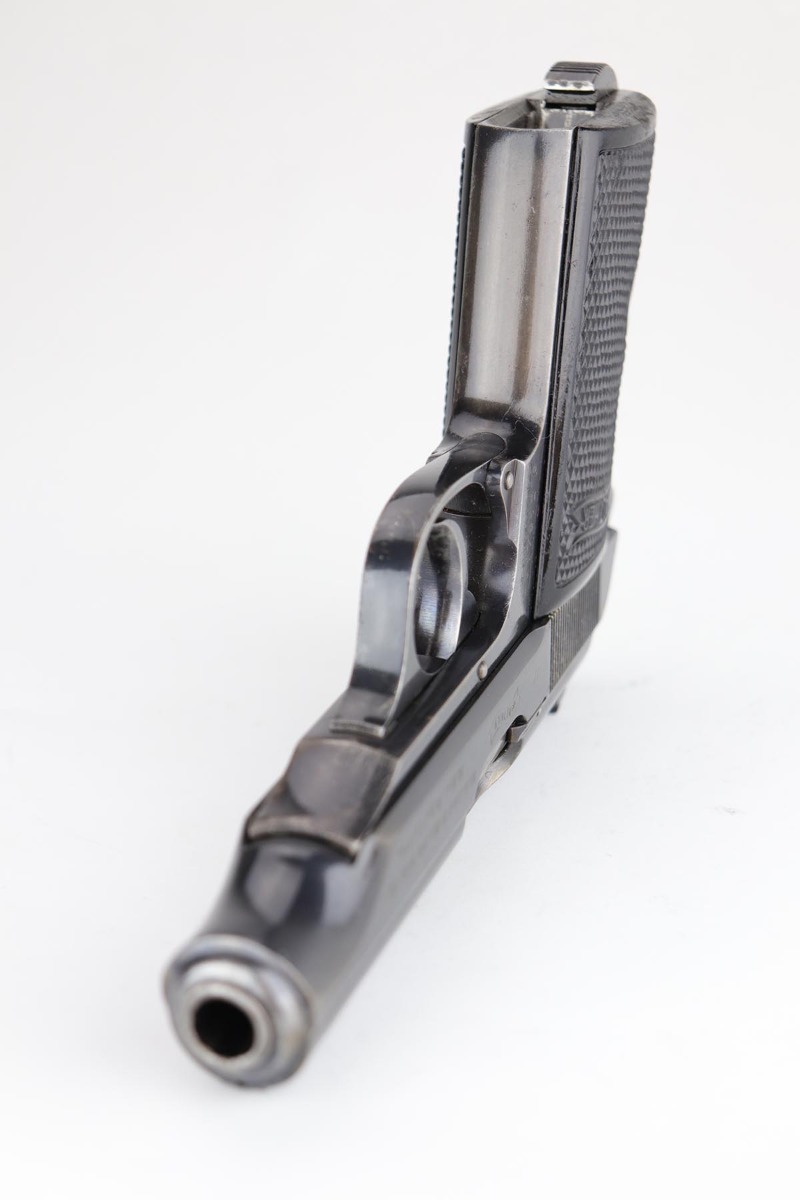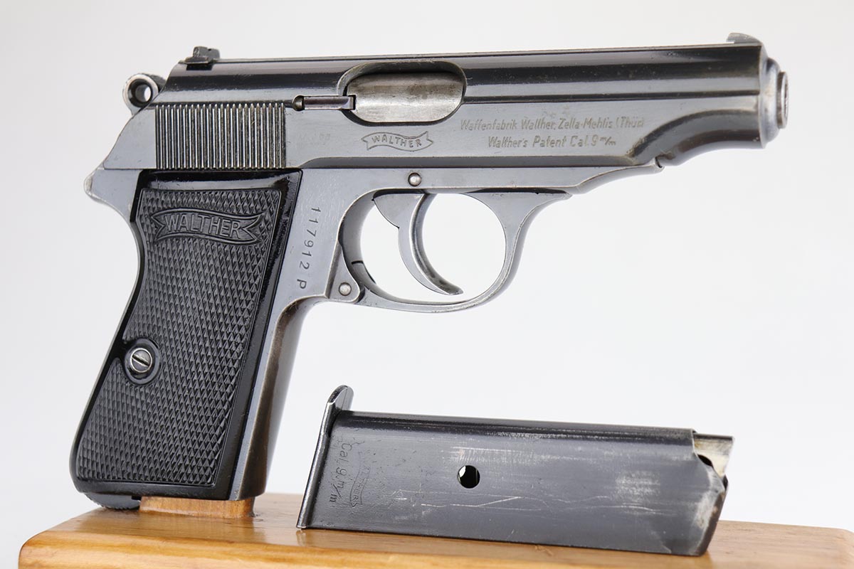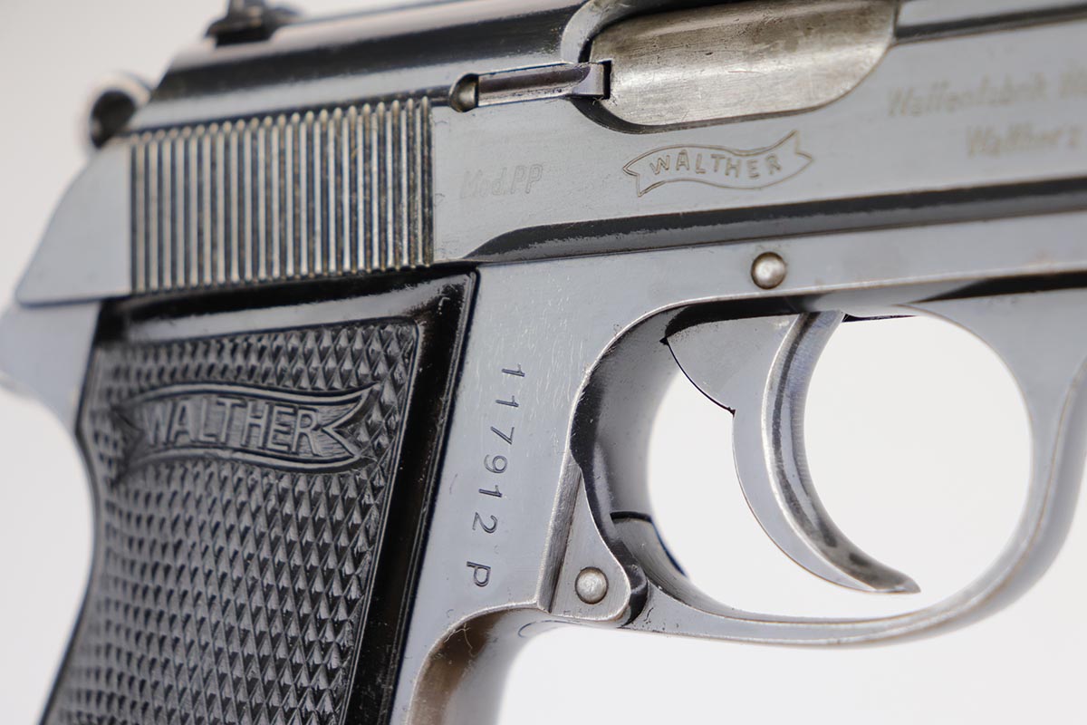 2/26/20 – This is a very rare Walther PP that was manufactured in 1938 and sent to Persia as part of a contract order, potentially for either the police or military. This is one of only about 2,000 produced. The pistol is all original, with Farsi legend and markings on left side slide and frame, and the Walther legend on the right side. These pistols were also chambered in the more rare and desirable 9mm Kurz. The high-polish blue is original and the pistol has a nice profile, but notable thinning/browning on the straps. There is some freckling on the left side of the frame, and right side slide. Minty bore. Excellent grips.