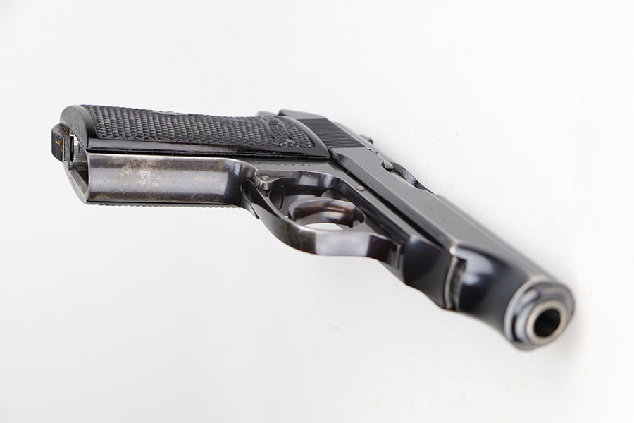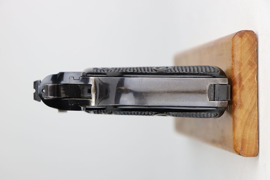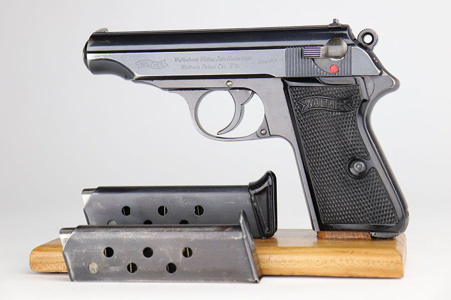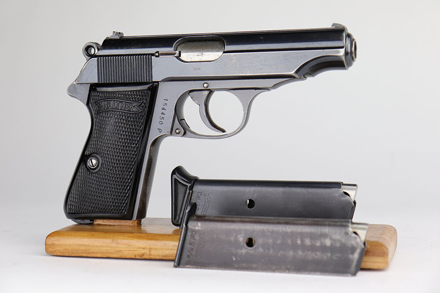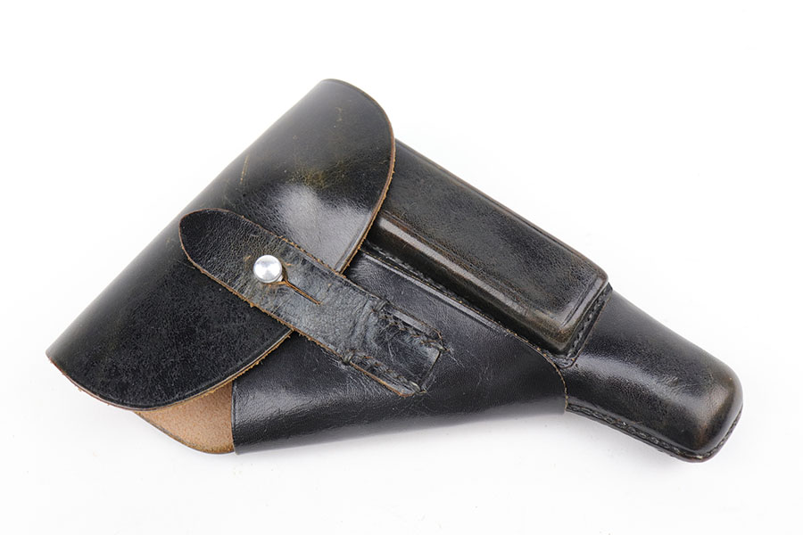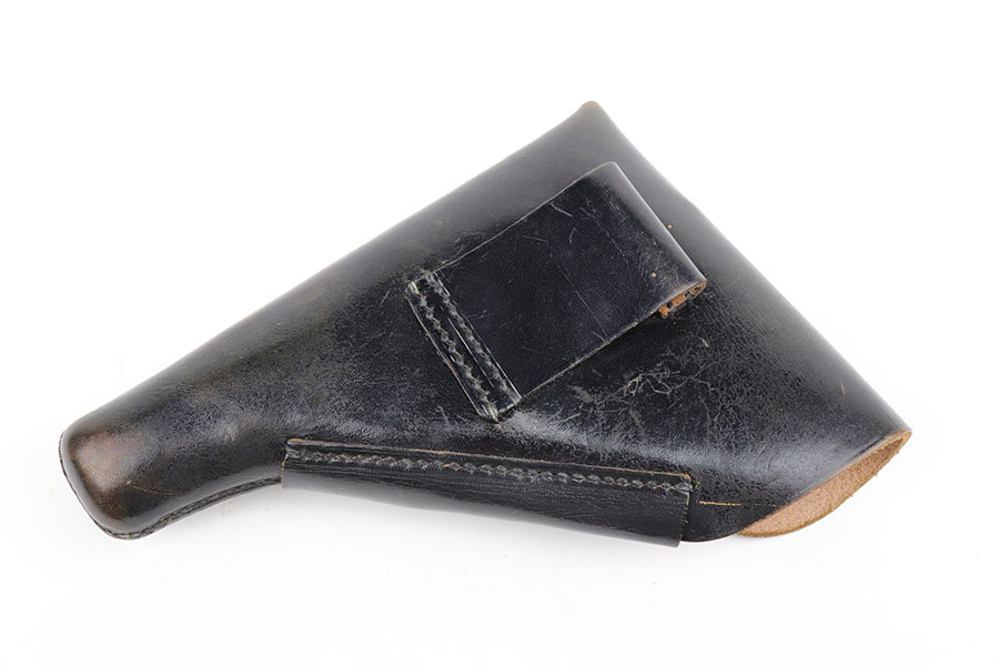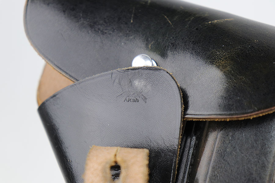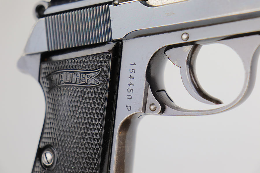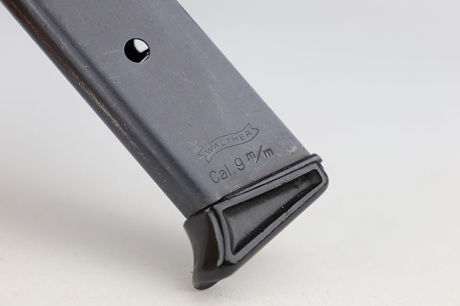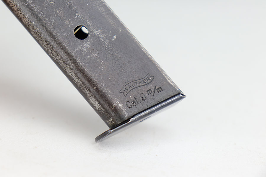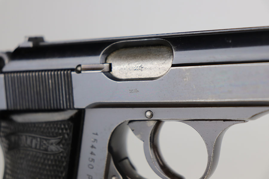 11/19/20 – – This is a scarce and all original Walther PP rig from the Nazi era that is chambered in 9mm kurz. Only about 3.5% of prewar and wartime Walther PP production was done in this caliber. The high polish blue rates at about 80% with edge and muzzle wear on both sides of the slide, but most of the bluing loss and patina on the straps. Excellent bore. Original grips with minor handling wear on the right panel. Two original and correct magazines, one with excellent finger extension. The rig is completed by a mint holster that is Akah marked under the closure strap.