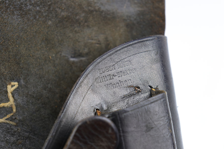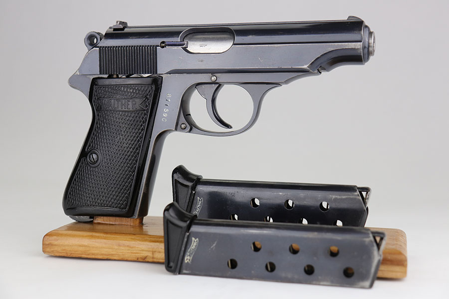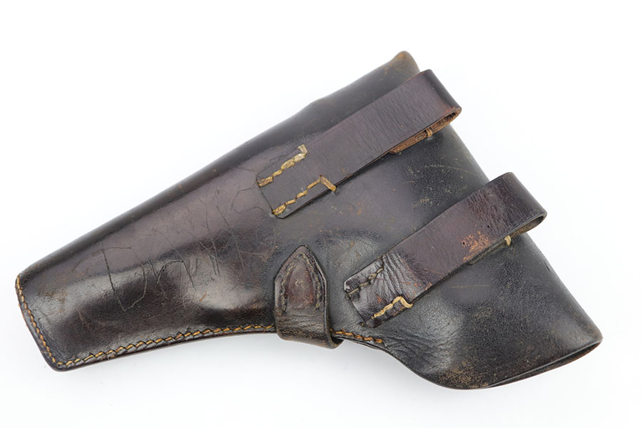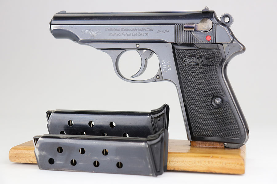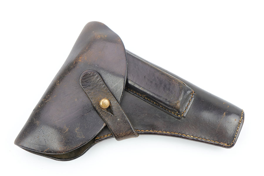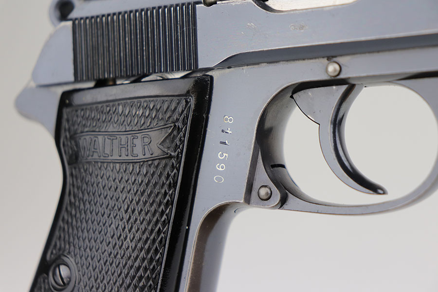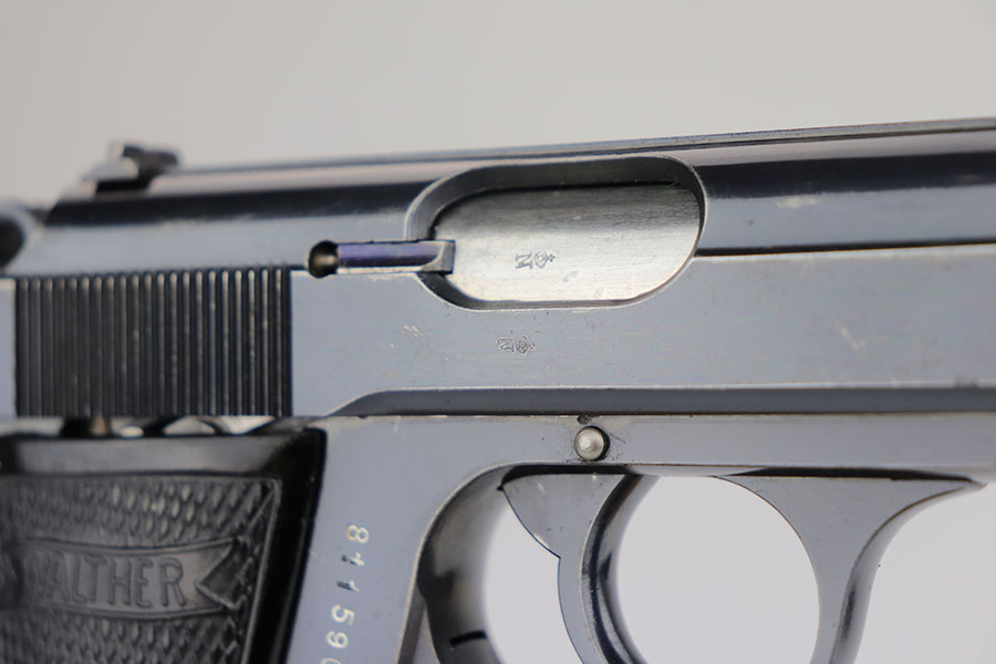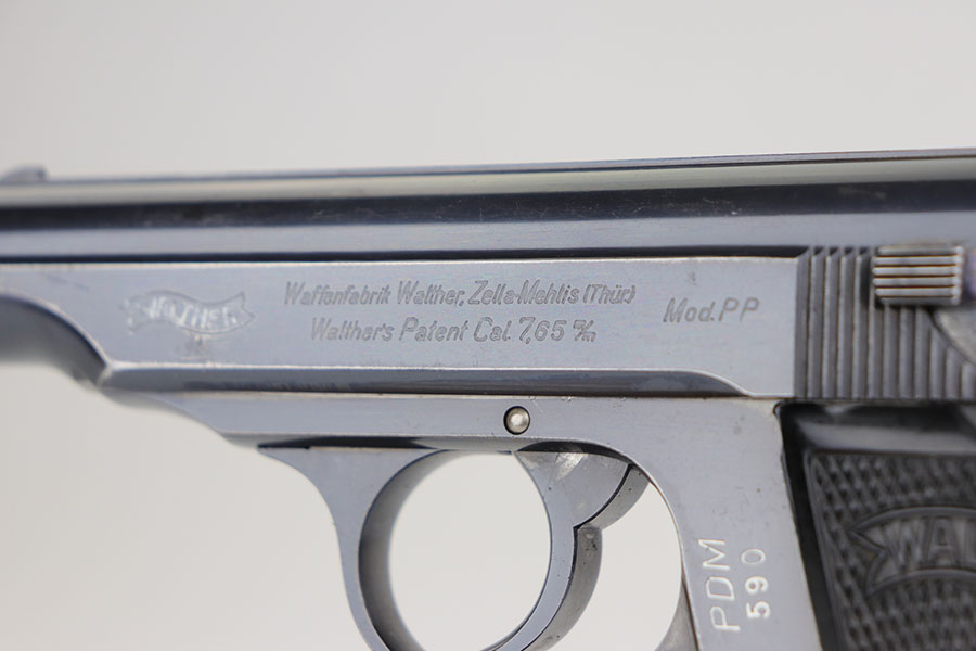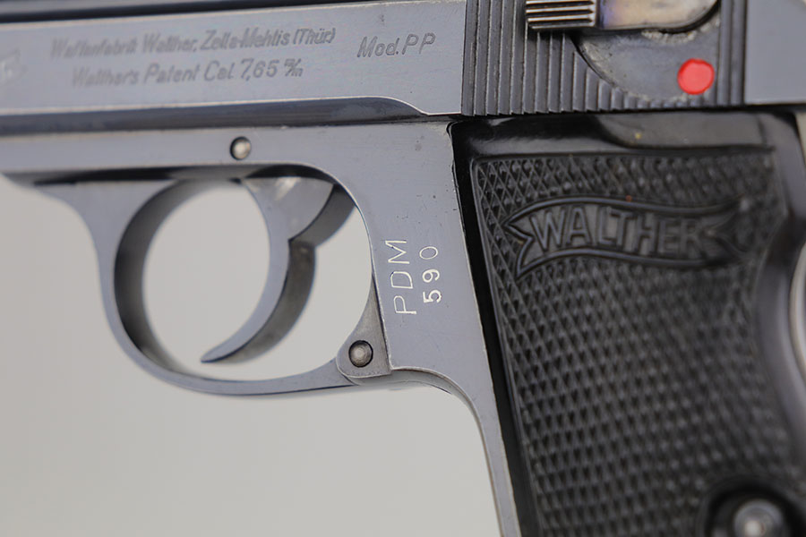 4/16/20 – This is a rare PDM Walther PP rig, manufactured around 1934. The pistol is all correct and original, and the bluing rates at about 90% with the majority of finish loss found on the straps. In 1935, Himmler ordered about 1800 PDM marked PP’s as head of all German Internal Security. PDM stands for Police Department of Munich, and the order was unique for the following reasons. These pistols came with a bottom release magazine, while all other 7.65mm PP’s had a push button mag release. The proper PDM magazine will have no notch for the push button release, which the magazine in this listing shows. NOTE: The photos have two magazines but there is only ONE magazine included in this listing. These pistols also have a strengthened ‘fluted’ barrel, visible on the muzzle end of the barrel, which a standard PP slide would not fit. This pistol falls in the correct serial range. Excellent bore. Comes with a correct holster that is Munich marked.