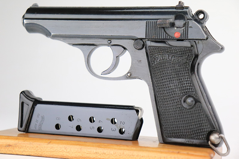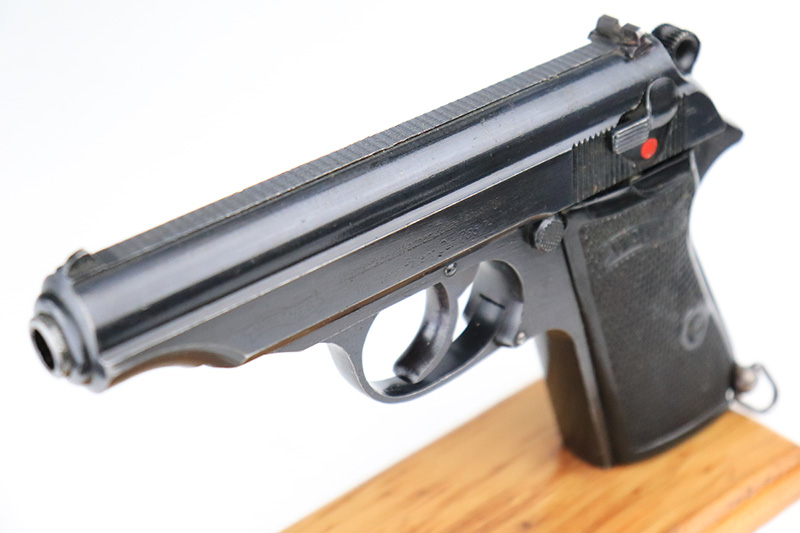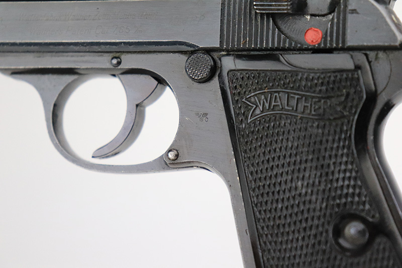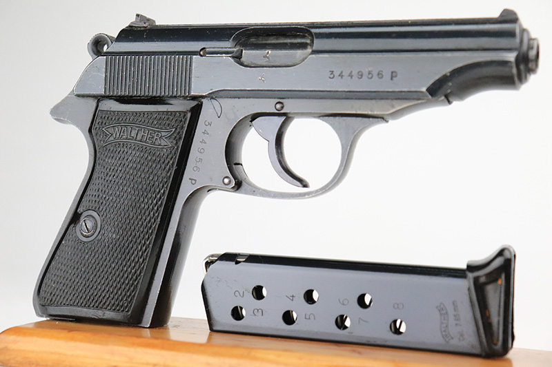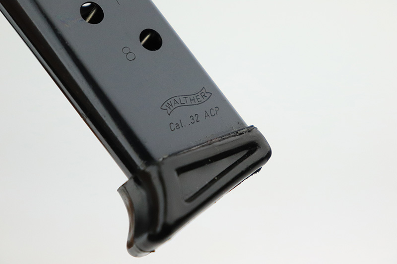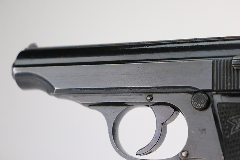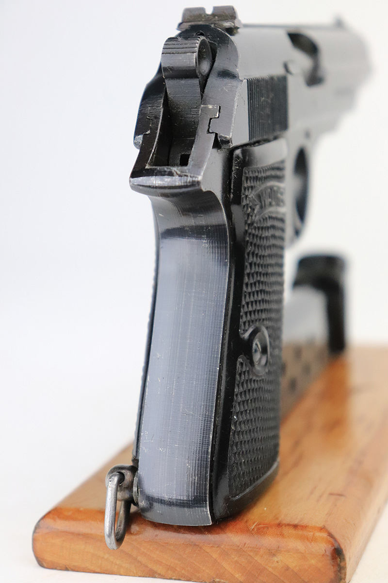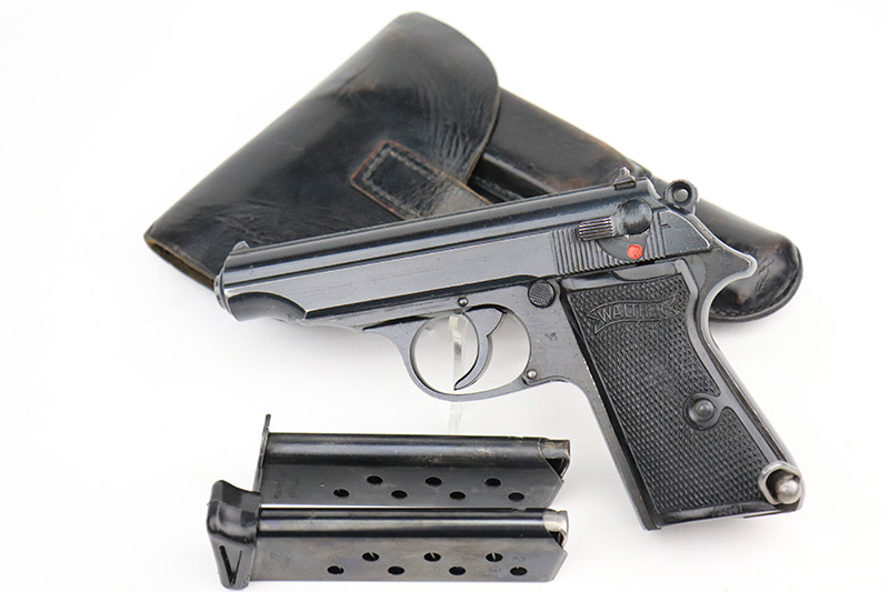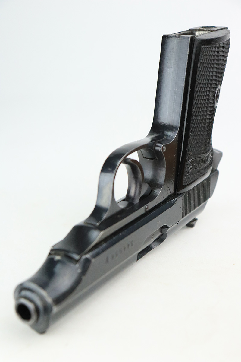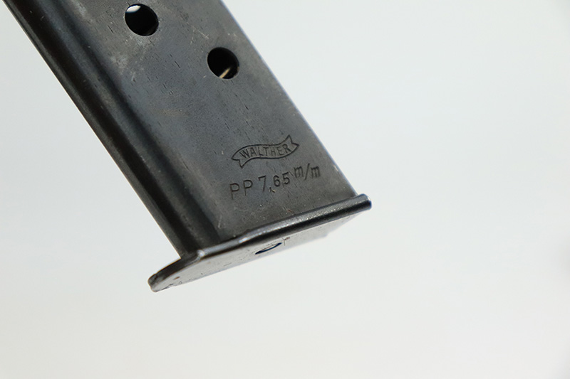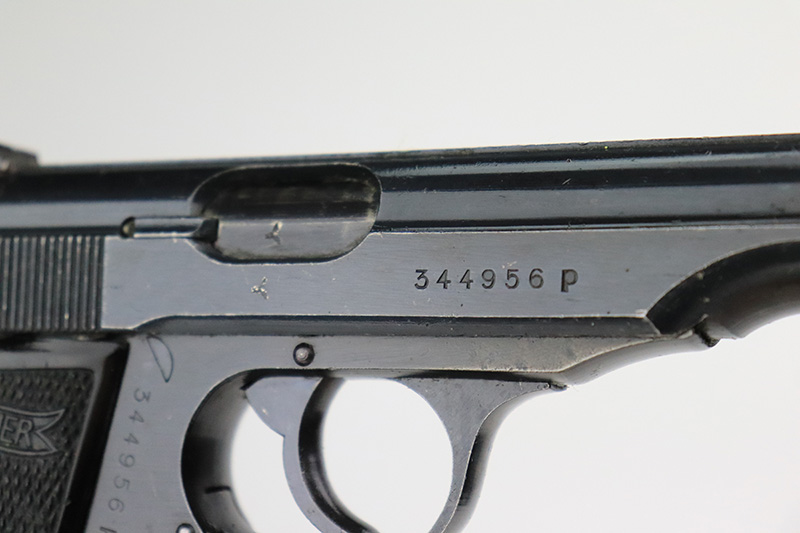 9/26/22 – This is an excellent example of a rare Walther PP issued to the Nazi police force in 1944. This one is all matching and has a police “Eagle C” marking on the left side of the frame. Only about 2,000 of this variation were made, as opposed to the more common “Eagle F” variant (about 5,000 made). This one also has a post-war French lanyard loop installed on the frame. It comes as a rig with a generic leather holster (we believe the Nazi markings are post-war), one period-correct wartime flat bottom magazine, and one post-war finger extension magazine. The gun itself has retained about 98% of its bluing. There is just very minor muzzle wear and tiny scratches and handling marks here and there, most obvious along the slide. Comes with period-correct black bakelite grips – a hairline crack along the left edge of the left panel. Mint bore.
