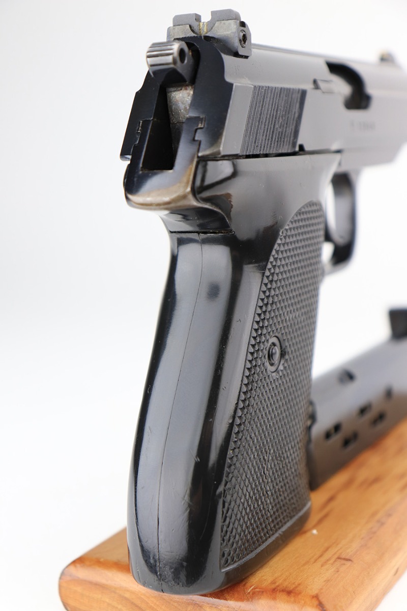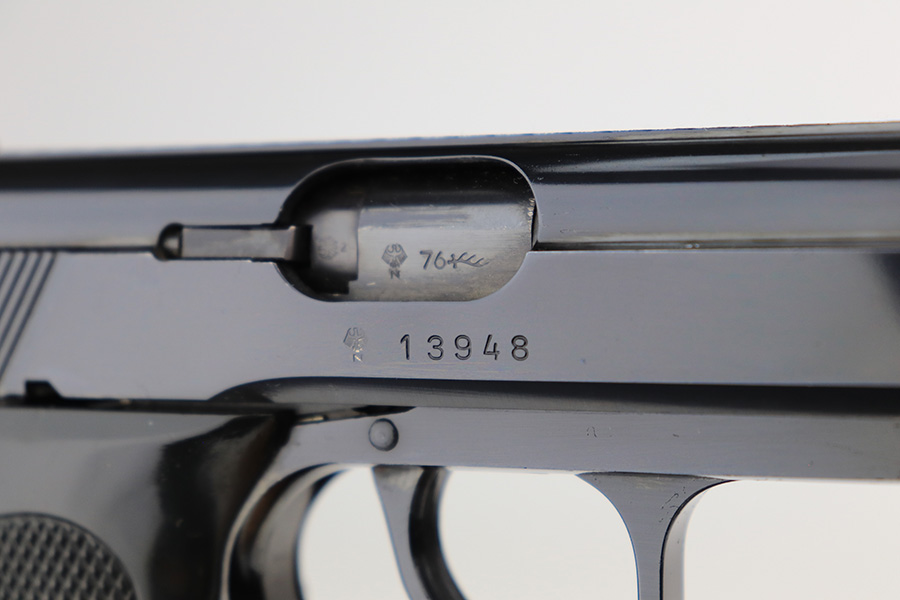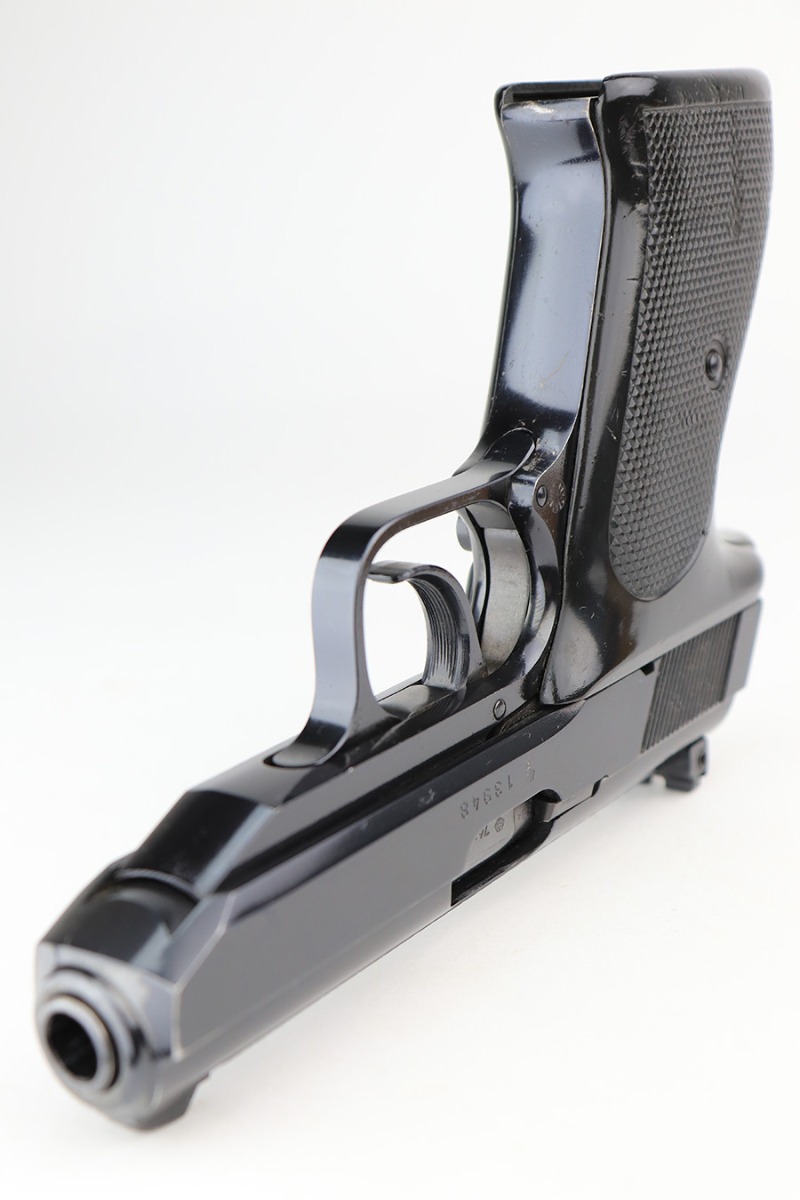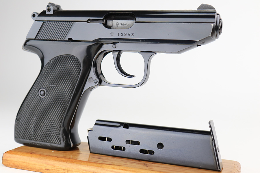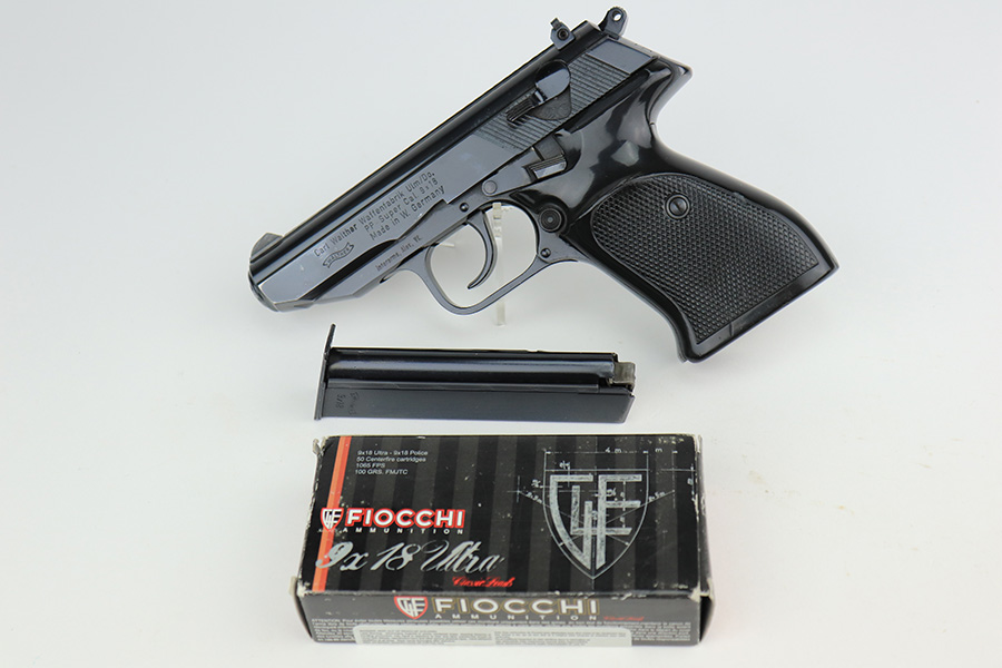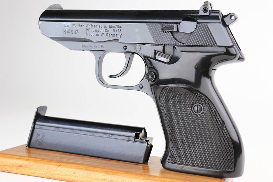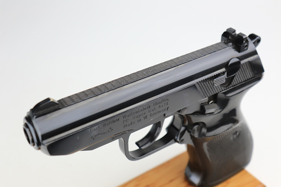 3/29/22 – This is an excellent Walther PP Super from 1976, one of only a few thousand made. The original blue rates at 96-97% with just a little edge wear on the slide, and minor scuff/wear marks on the front strap. The Walther PP Super pistol came into existence circa 1972, as a proposed service handgun for West German police. At that period, German police looked for a new standard handgun and ammunition, to replace obsolete and underpowered pistols then in service. During the early 1970s there was much debate about a new service cartridge, and two major contenders were the already famous 9x19mm Luger/Parabellum, and the relatively new 9×18 Police cartridge. The 9×18 Police cartridge has been based on pre-WW2 9x18mm Ultra ammunition, developed in Germany by the Geco and Walther on request from Luftwaffe (German Air Forces). The 9×18 cartridge offered about a maximum power which could be used in relatively compact and lightweight blowback pistols. This, in turn, allowed these pistols to be simpler and less expensive than locked-breech 9x19mm pistols. Recognizing these advantages of 9×18 ammunition, the Walther company developed a police pistol, roughly based on the famous Walther PP pistol, and called it PP Super. This listing includes a box of 9×18 Ultra ammo with 50rds. Import mark on frame. FFL required.