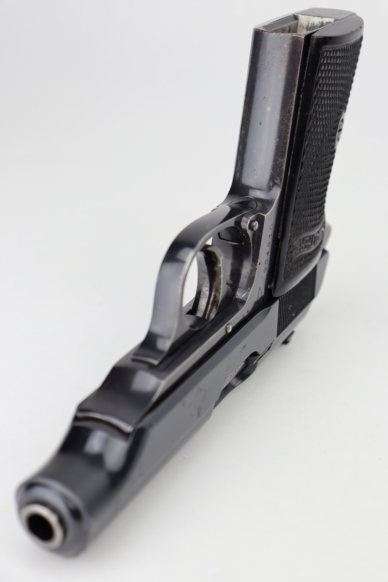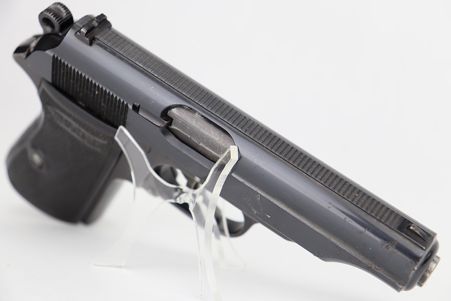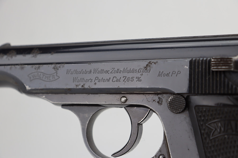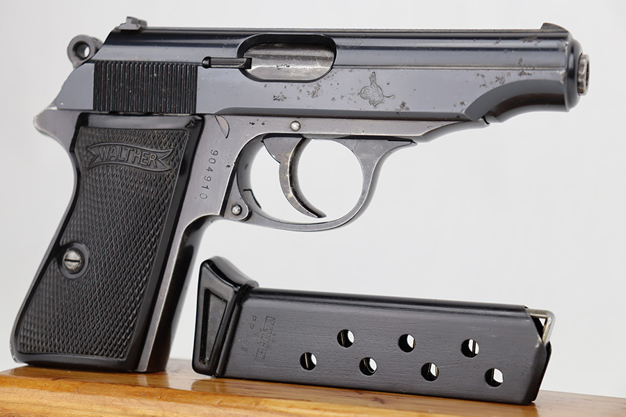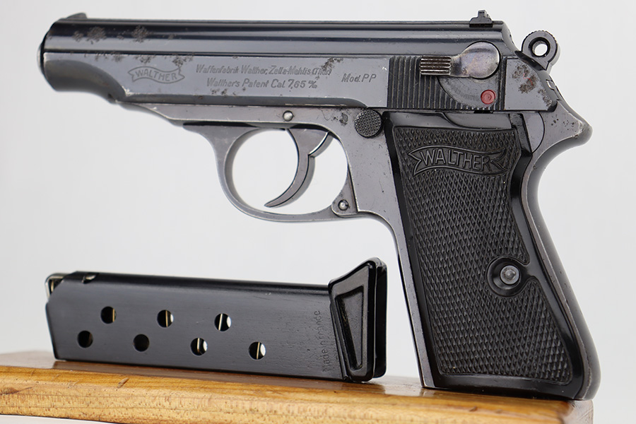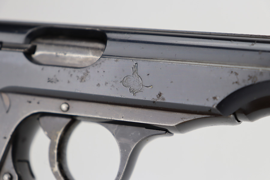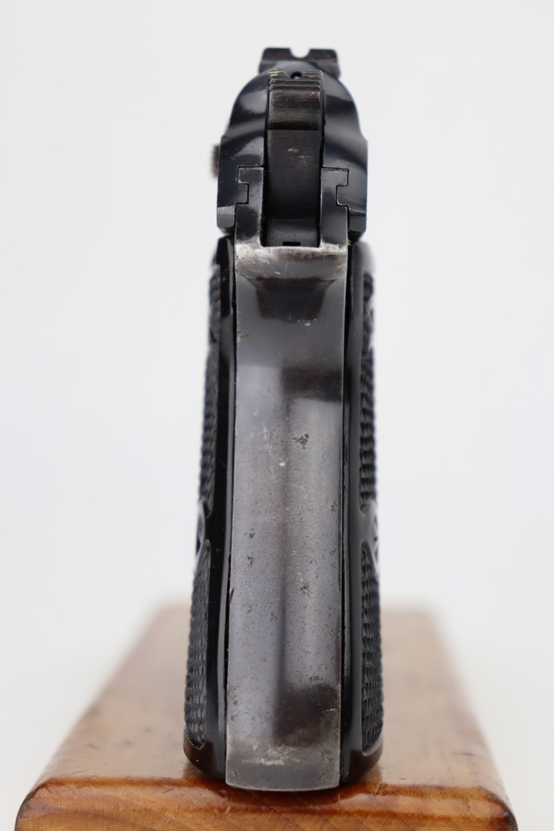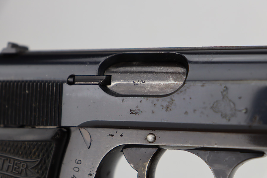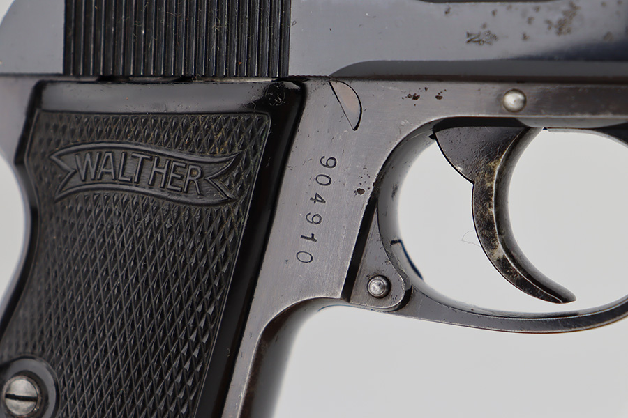 3/18/24 – This is a rare example of a rare Walther PP manufactured in 1935 and chambered in 7.65mm. All matching with “Crown N” proofs. The pistol is marked with the “Tughra” of Sultan Hamid II, per Dieter Marschall. This is one less than 50 made with this marking. The gun has retained about 93% of its finish with minor wear and pin-pricking on the grip straps. While there isn’t a ton of actual finish loss, there are areas of noticeable pitting here and there, most obvious along the left side of the slide. Fitted with excellent period-correct grips and comes with a post-war Manurhin finger extension magazine. Very nice bore with great rifling.