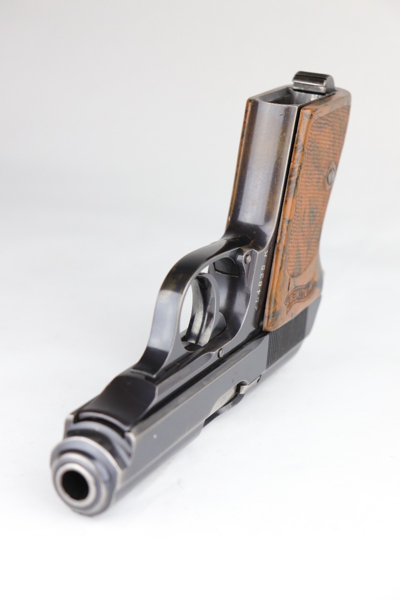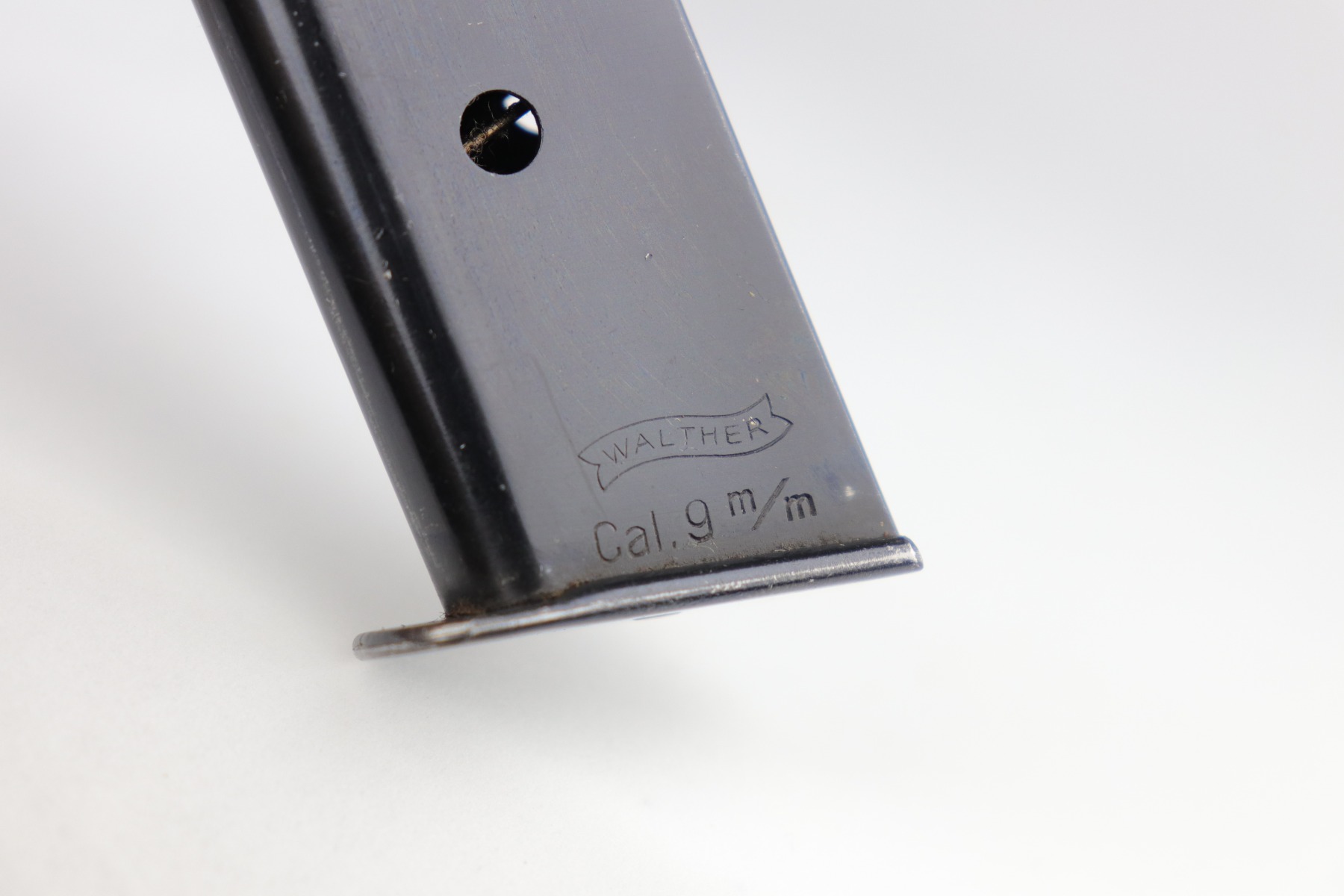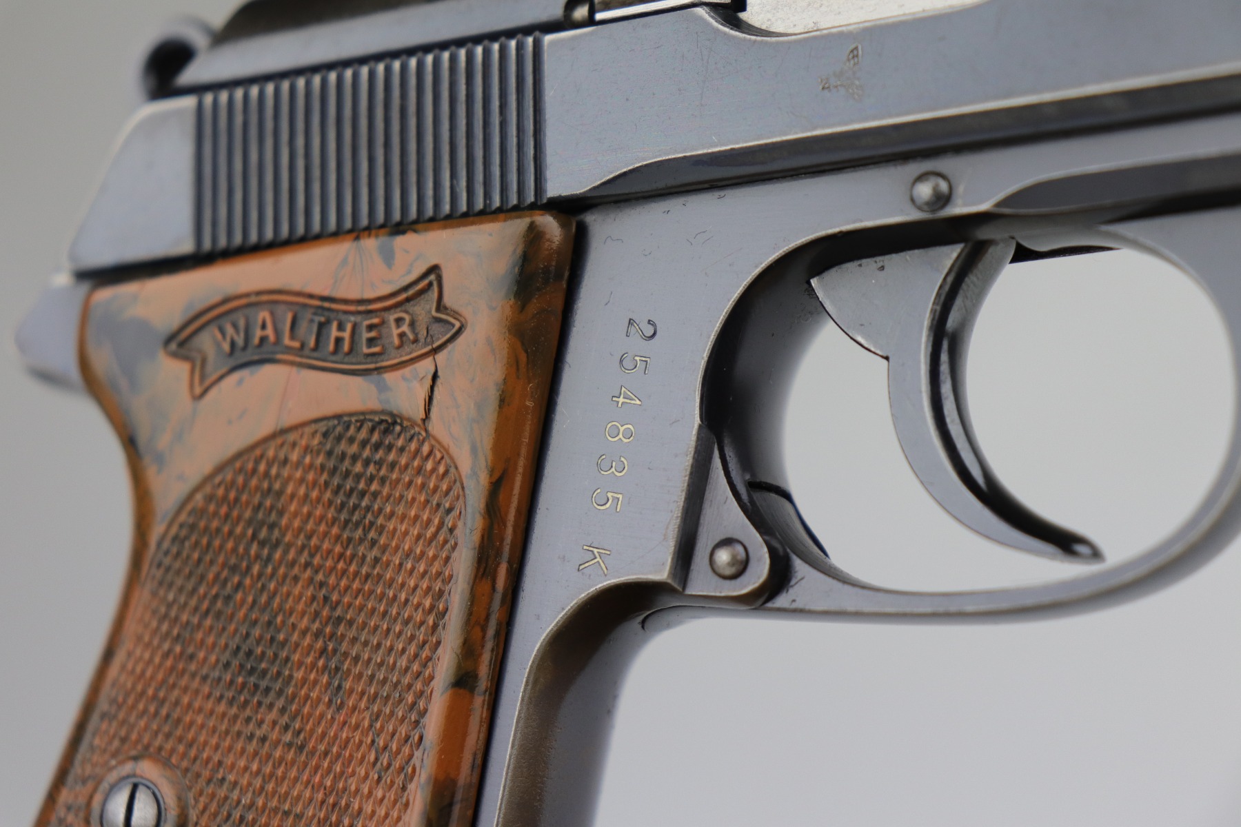 5/28/20 – This is a nice, honest example of a scarce Walther PPK from the Nazi era that’s chambered in the more popular 9mm Kurz. Only about 3.5% of total Walther PPK production was done in this caliber. The pistol has some muzzle wear on each side, and some thinning on the front strap. There’s also a general patina to the finish throughout. Bore is minty and mechanics are good. Excellent grip which is correct with cutout for bottom release. It has just a tiny surface crack on the right side. Correct magazine.