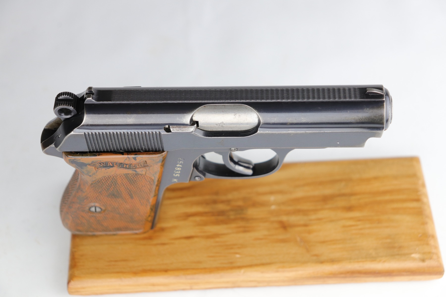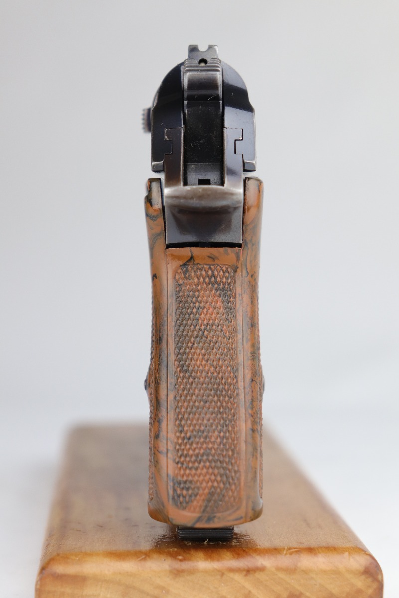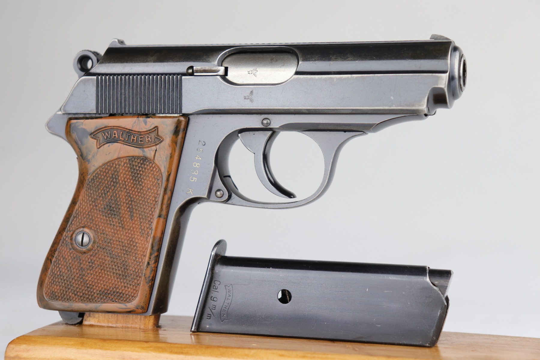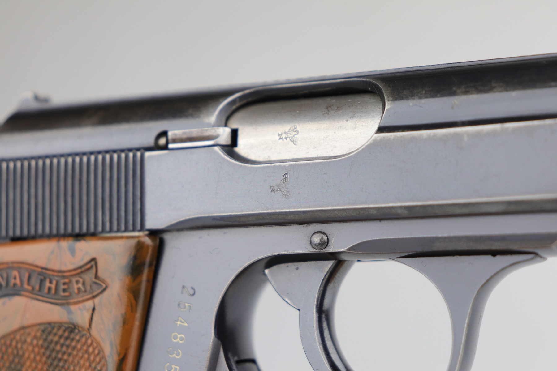 5/28/20 – This is a nice, honest example of a scarce Walther PPK from the Nazi era that’s chambered in the more popular 9mm Kurz. Only about 3.5% of total Walther PPK production was done in this caliber. The pistol has some muzzle wear on each side, and some thinning on the front strap. There’s also a general patina to the finish throughout. Bore is minty and mechanics are good. Excellent grip which is correct with cutout for bottom release. It has just a tiny surface crack on the right side. Correct magazine.