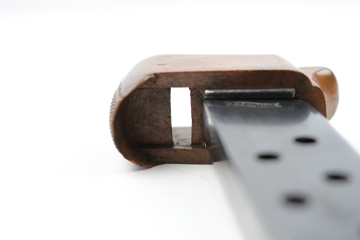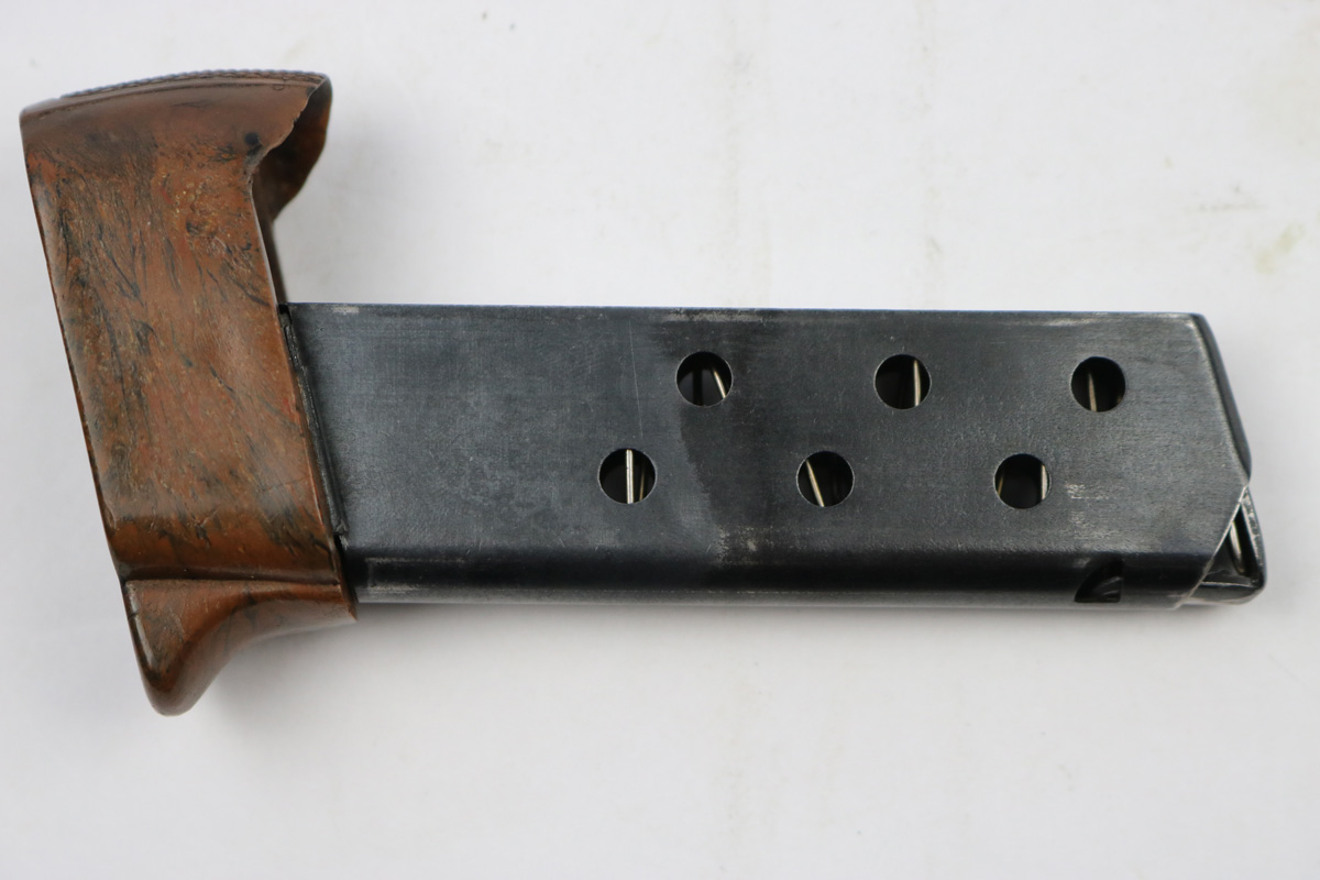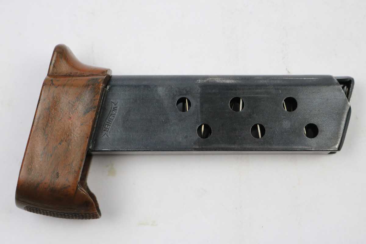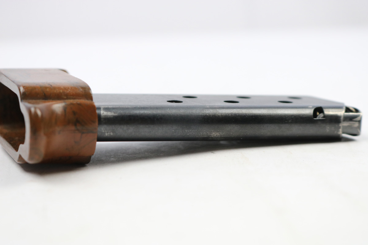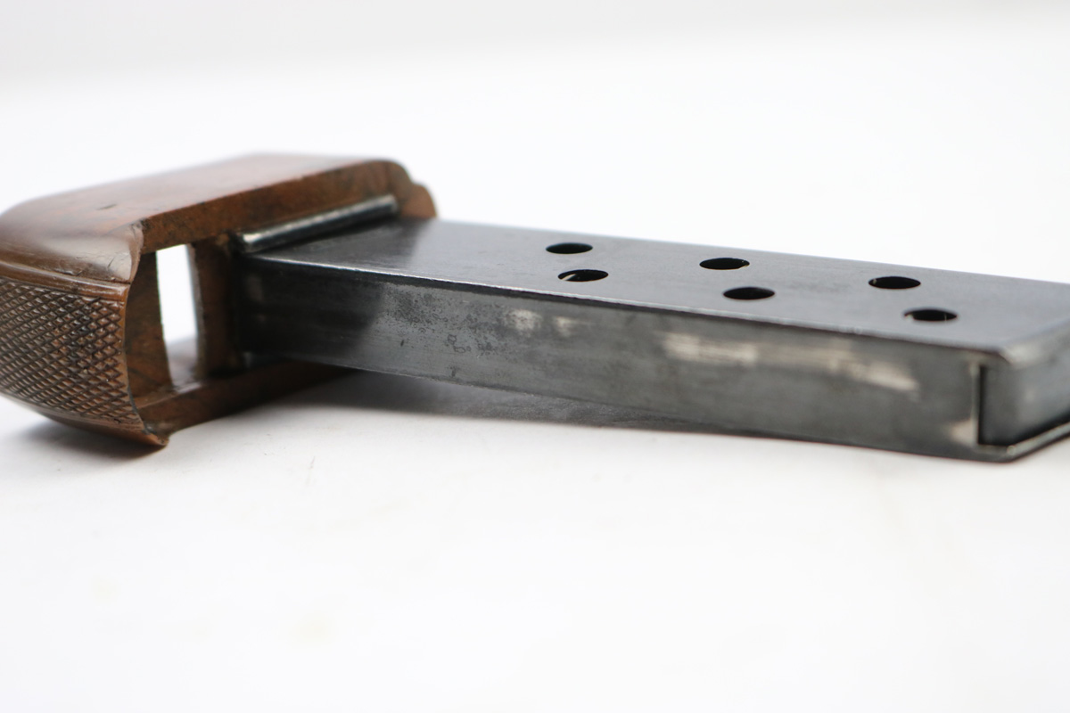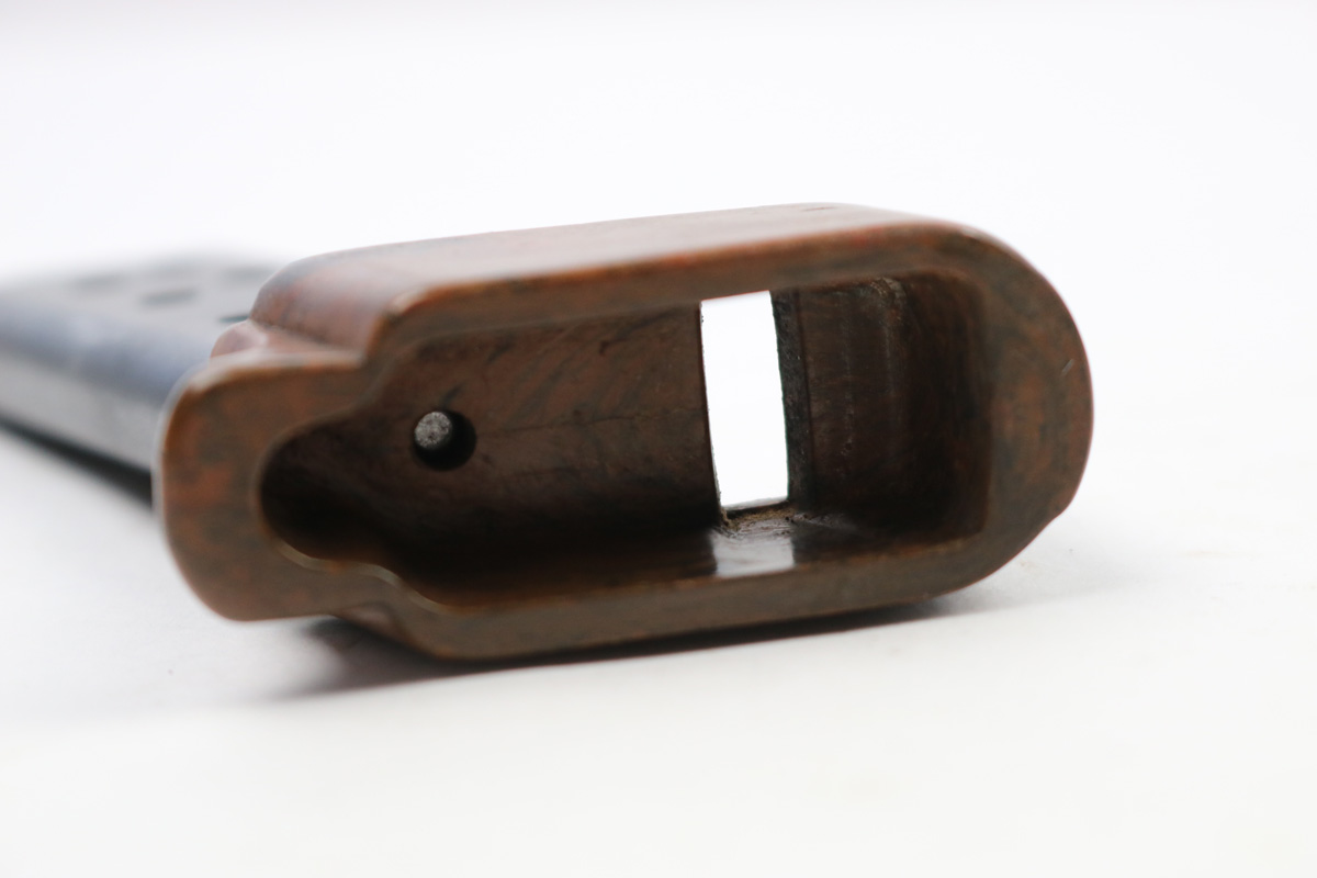 7/9/18 – This is an excellent, all original Walther PPK boxed finger extension magazine. These are very rare magazines and extremely hard to find in this condition. The finger extension is original WW2 bakelite with no cracks or chips. The base is a nice brown / black blended color. The tube / frame of the magazine is also excellent but there are a few light discoloration spots. Overall excellent , original, and fully functional.