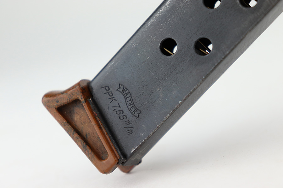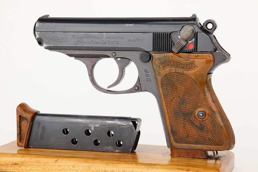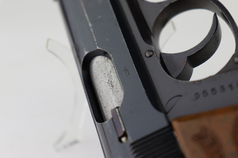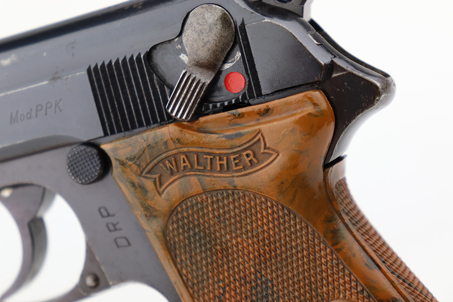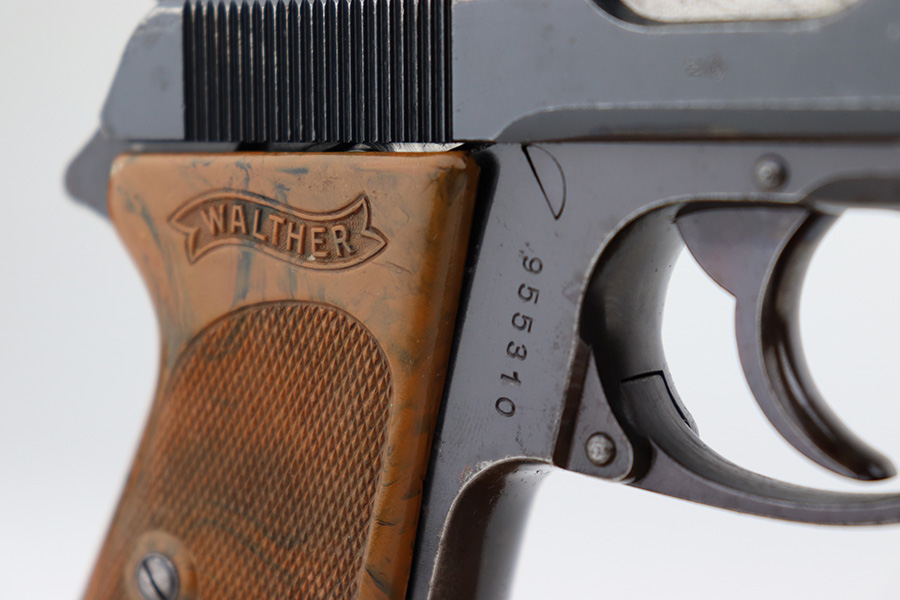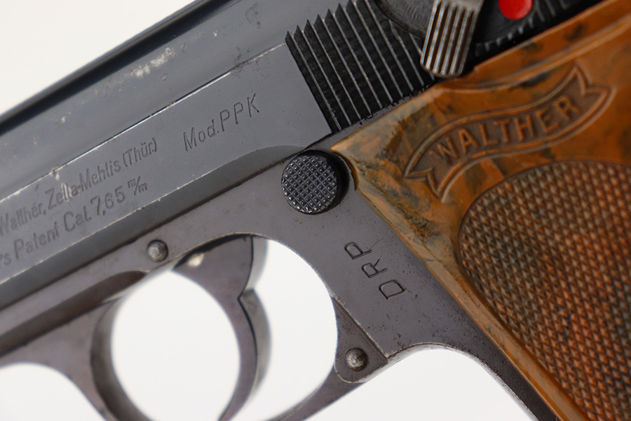 8/10/22 – This is a very rare Walther PPK with DRP-marked frame. Made in late 1936 or early 1937, these were issued to the Deutsche Reichspost, which was for the German postal inspectors. one of only ~1,000 ever made, this is a 2nd variation example with no periods in the DRP marking. The bluing is original with muzzle wear on each side of the slide, a little more on the rounded edges and front strap, and the fire blue is worn off the safety. Minty bore. The grip shows minor warping and a small corner crack in the corner of the spine. Comes with an excellent finger extension magazine.