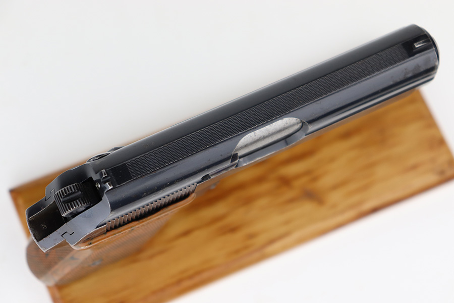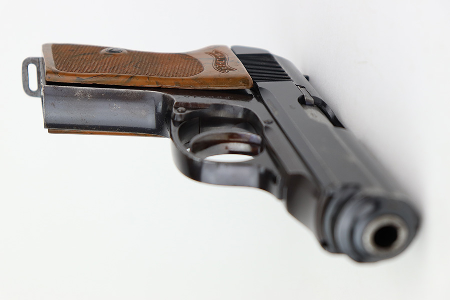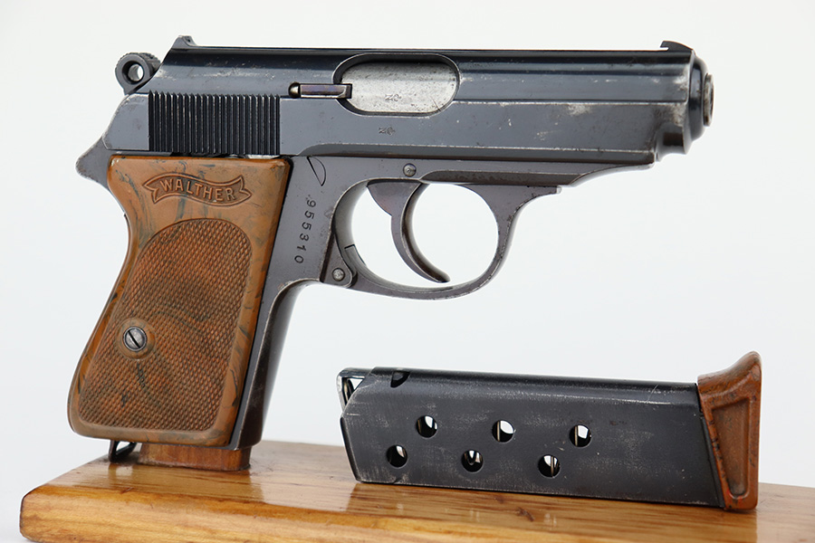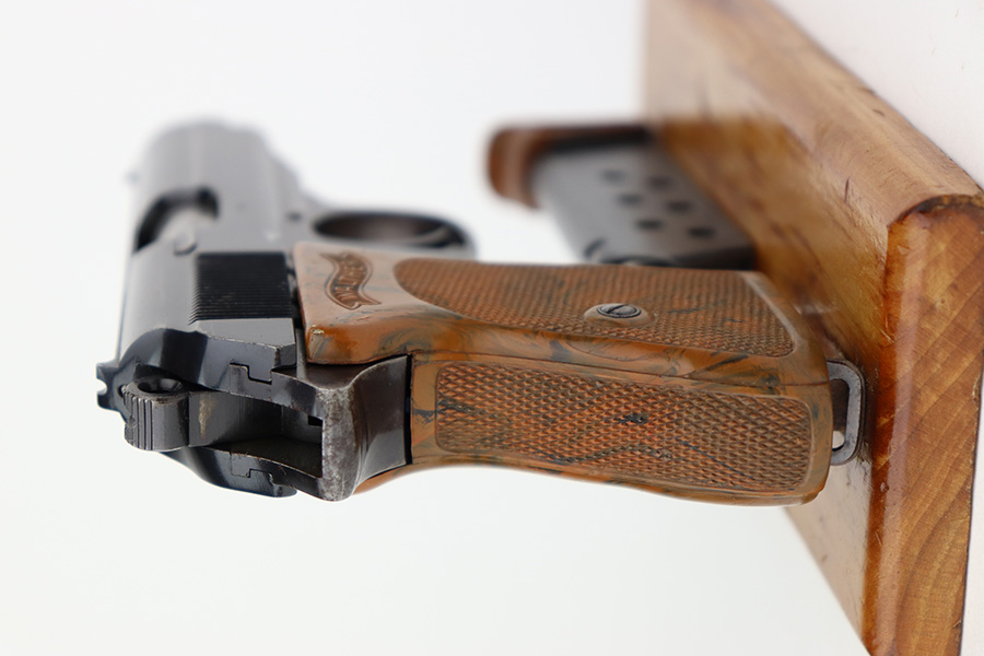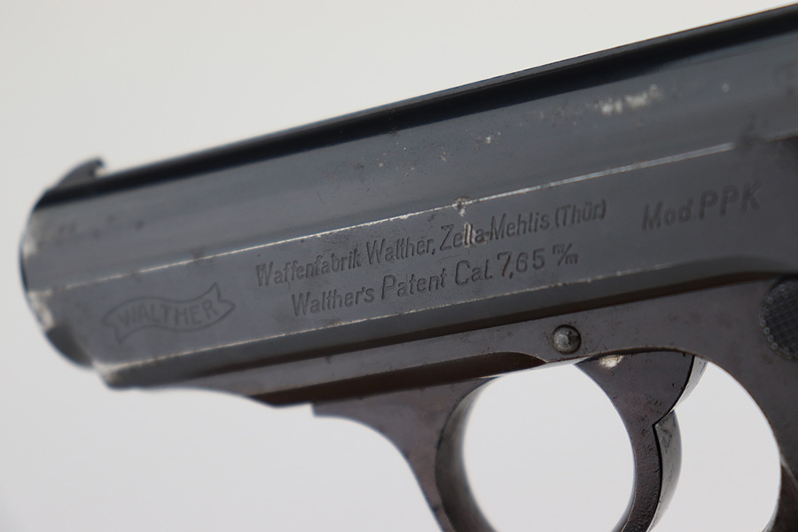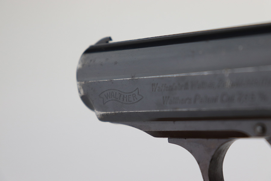 8/10/22 – This is a very rare Walther PPK with DRP-marked frame. Made in late 1936 or early 1937, these were issued to the Deutsche Reichspost, which was for the German postal inspectors. one of only ~1,000 ever made, this is a 2nd variation example with no periods in the DRP marking. The bluing is original with muzzle wear on each side of the slide, a little more on the rounded edges and front strap, and the fire blue is worn off the safety. Minty bore. The grip shows minor warping and a small corner crack in the corner of the spine. Comes with an excellent finger extension magazine.