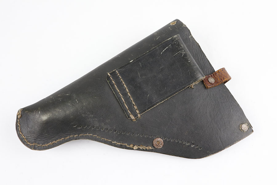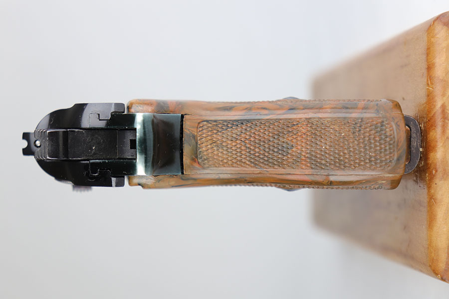 6/25/20 – This is a very rare Walther PPK with duraluminum frame and Crown/N proofs. These were the early experimental ones and this one shows a beautiful “dual-tone” finish. According to Whittington’s research, only 200 of these were made in the Crown/N variation making them MUCH RARER than the Party Leader PPK or RZM. The frame has an anodized painted finish. Blued slide is minty but most of the finish loss is on the grip strap. Excellent original finger extension magazine. Minty bore. Grip has a small surface crack on right side. Comes with a modified holster that appears to be one of the green Beretta variants.