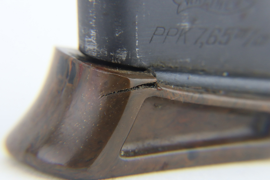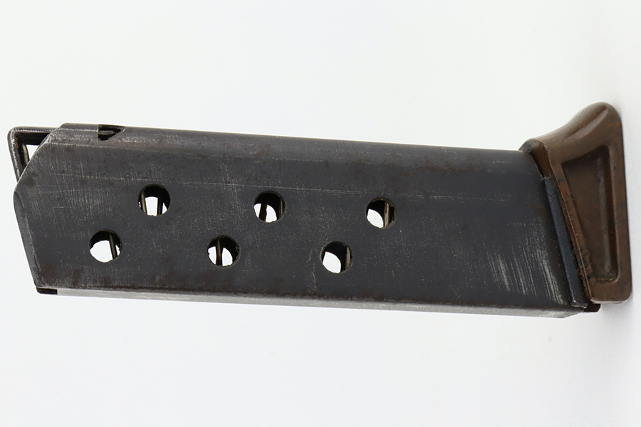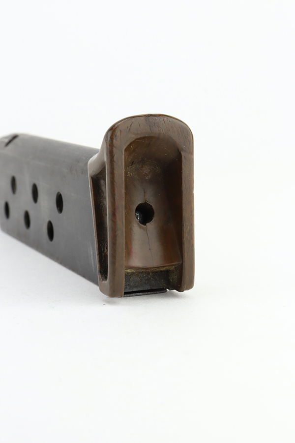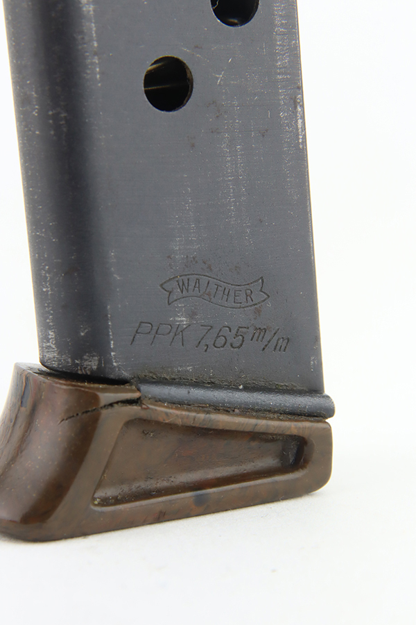 1/12/24 – This is a very nice example of a rare wartime Walther PPK magazine with a rare grayish-brown colored bakelite finger extension. The magazine is fully functional and in excellent condition overall with just a tiny crack on the left side of the base.