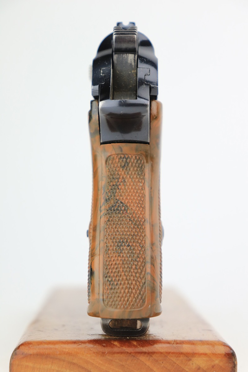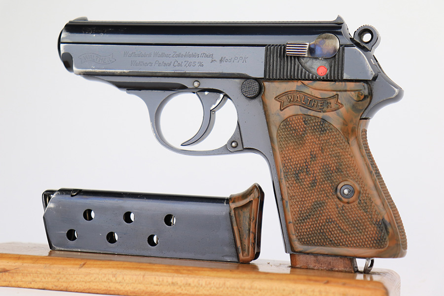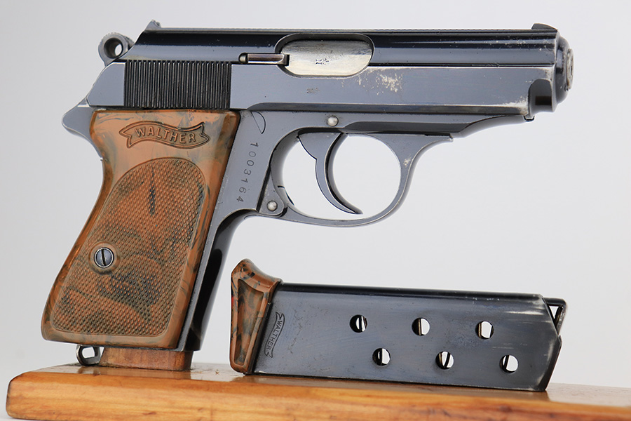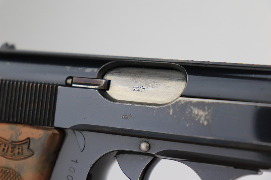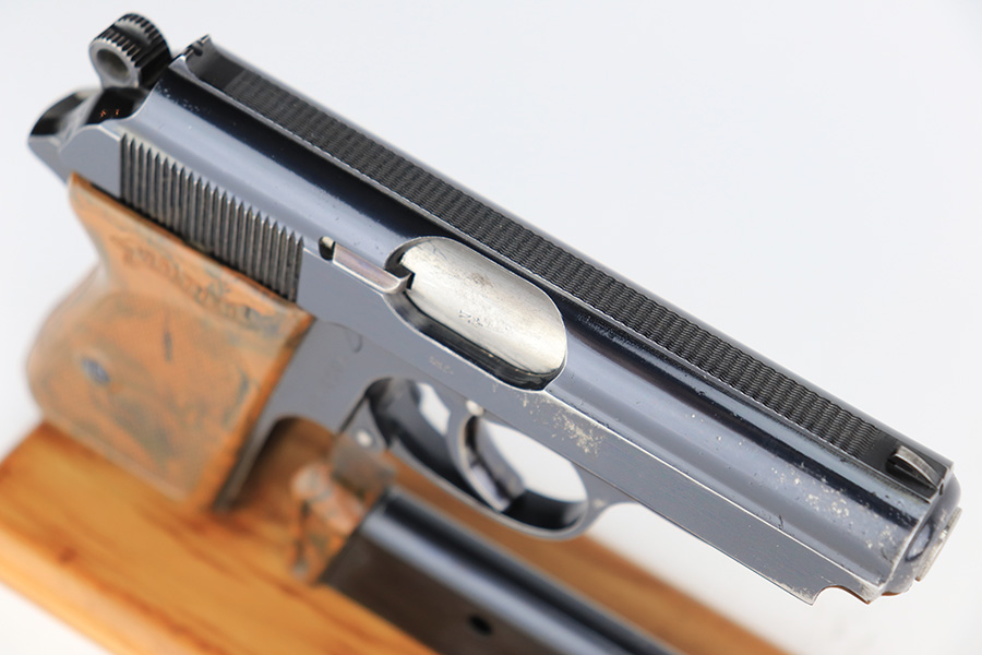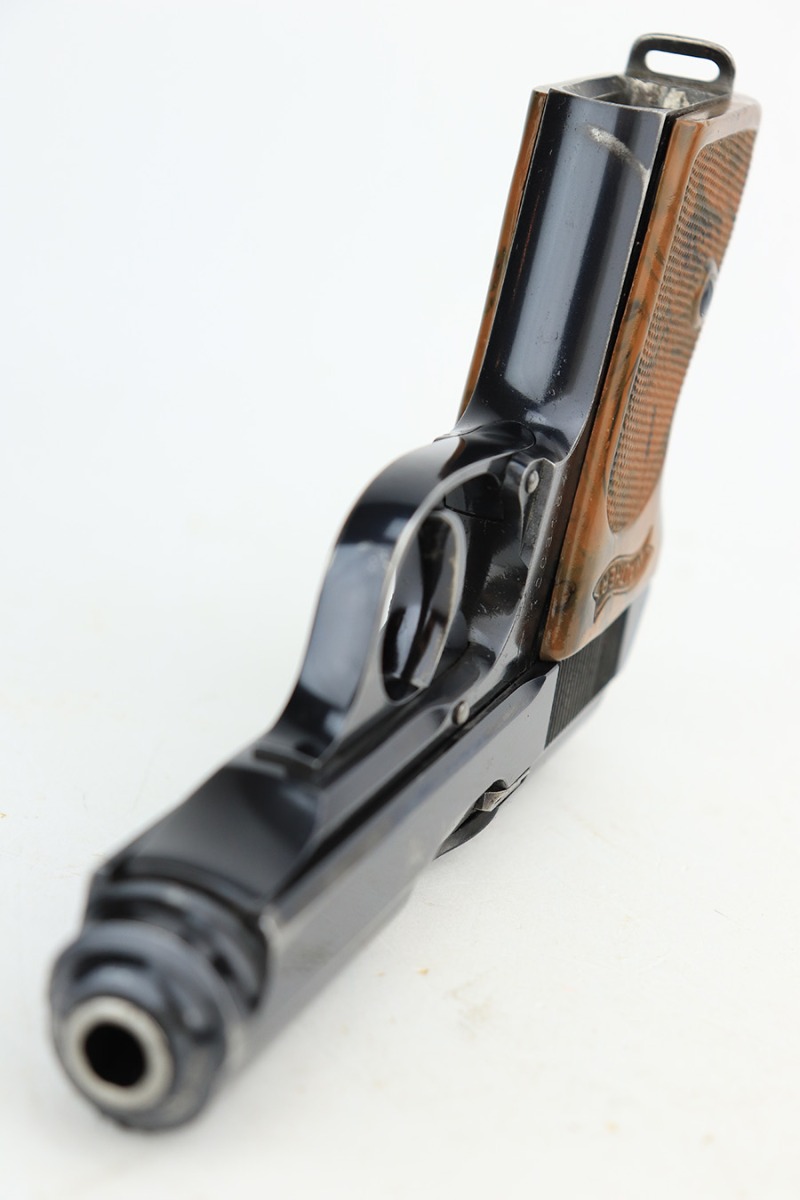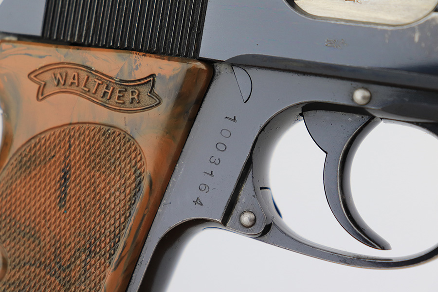 5/5/23 – This is a rare commercial Walther PPK from 1938 with million series serial number. In 1939, serial numbers began rolling over into seven digits until the Germans changed their mind and went back to six digits with a K-suffix. There were only about 7,000 such serials used, and about 1,000 of them were Police marked. This is one of the 6,000 commercial examples. It has retained about 93-94% of its original high polish finish. Minor spotty wear around the muzzle and near the ejection port. A light streak of wear on the front strap. Excellent brown grip – no cracks or chips. Comes with a period-correct brown finger extension magazine. The bore is near-mint.