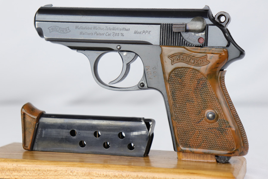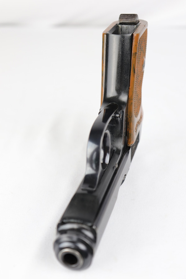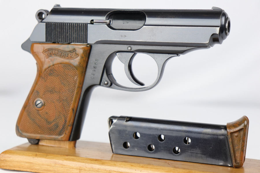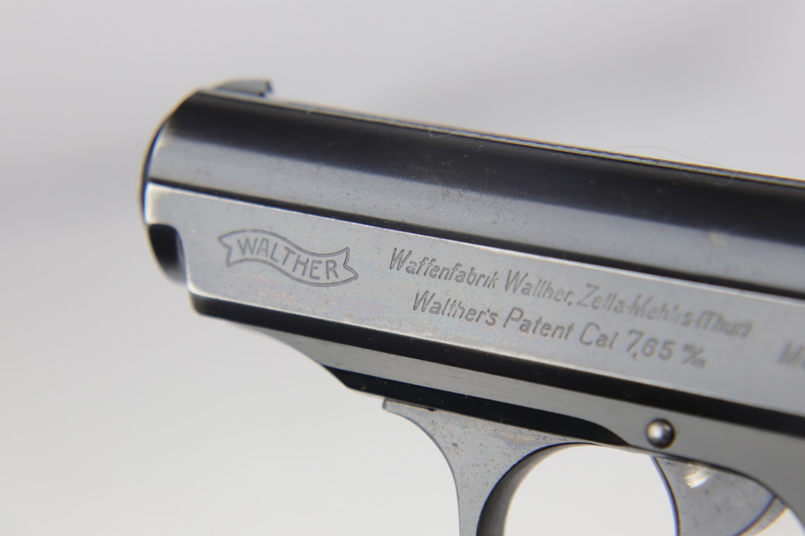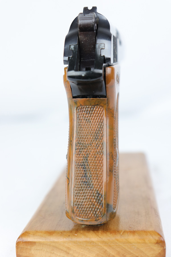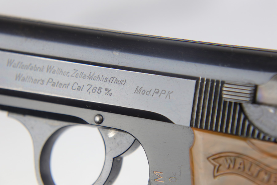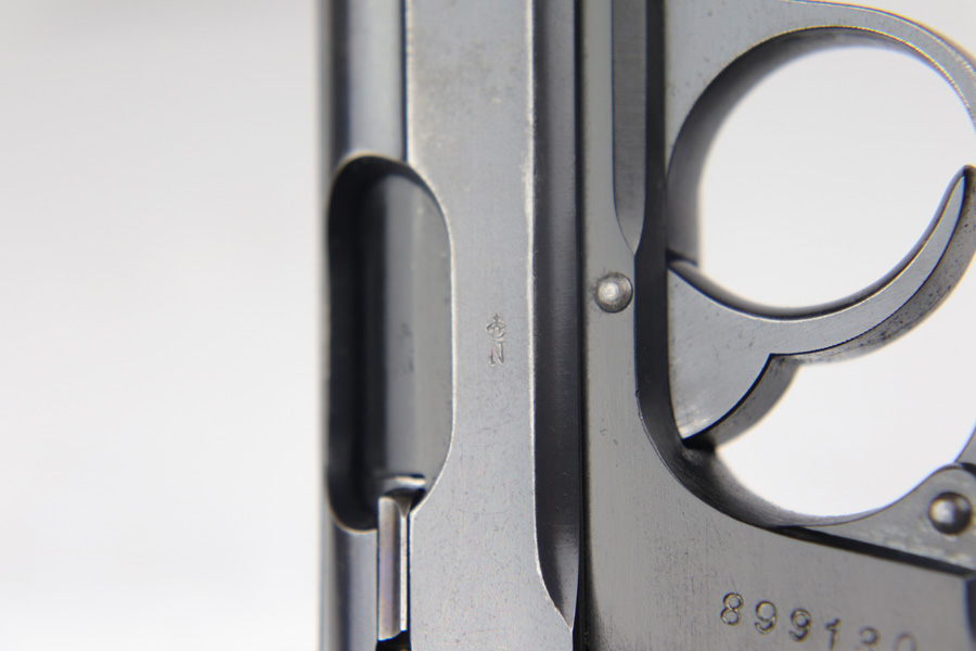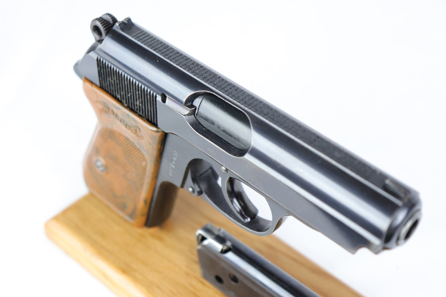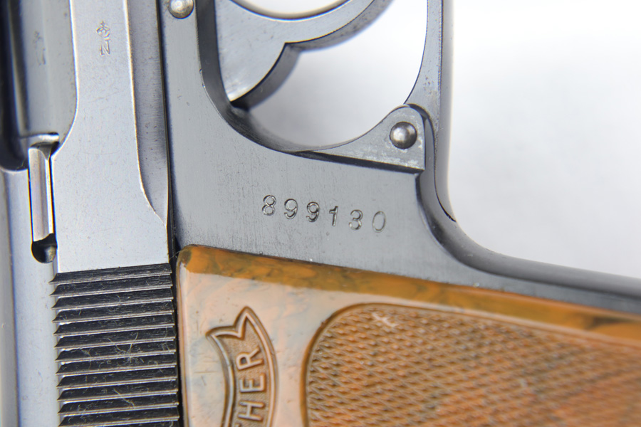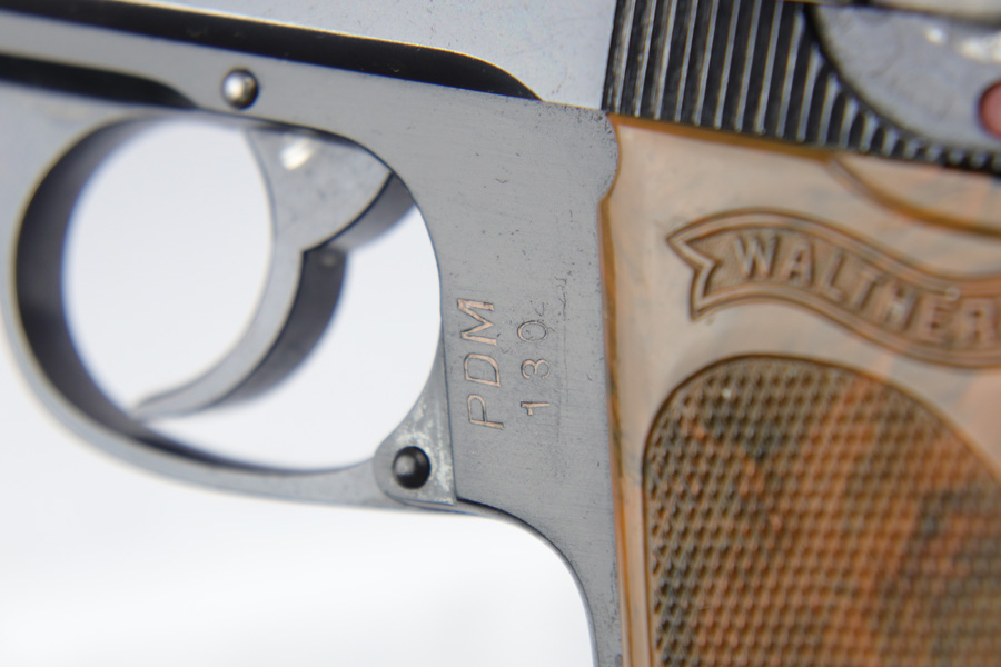 10/31/18 – This is a hard to find PDM marked Walther PPK. The PDM’s were issued to the Police Dept. of Munich, under the direction of Heinrich Himmler. It has a number of rare features such as the bottom release magazine and a fluted barrel. The original finish is about 96-97% with muzzle wear on both sides and some thinning of the front strap. Excellent bore. Minty finger extension magazine. Grip is in good condition but does have a minor surface crack on the right side.