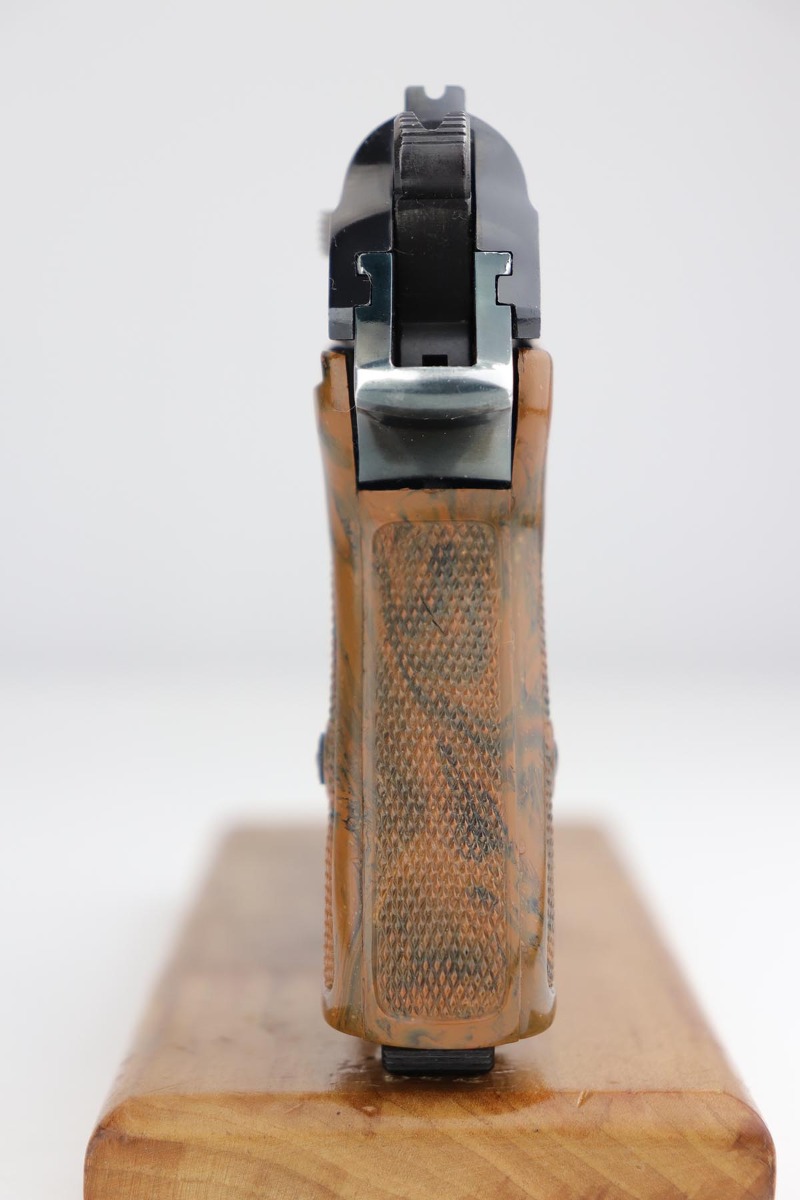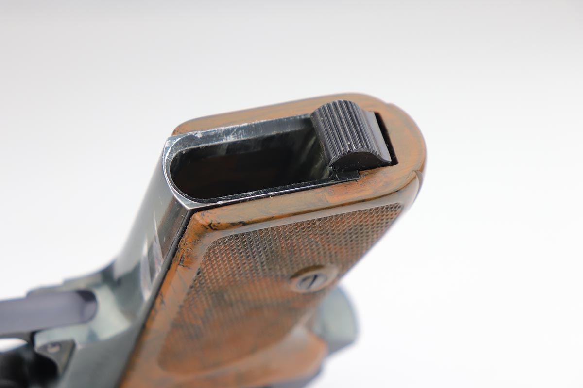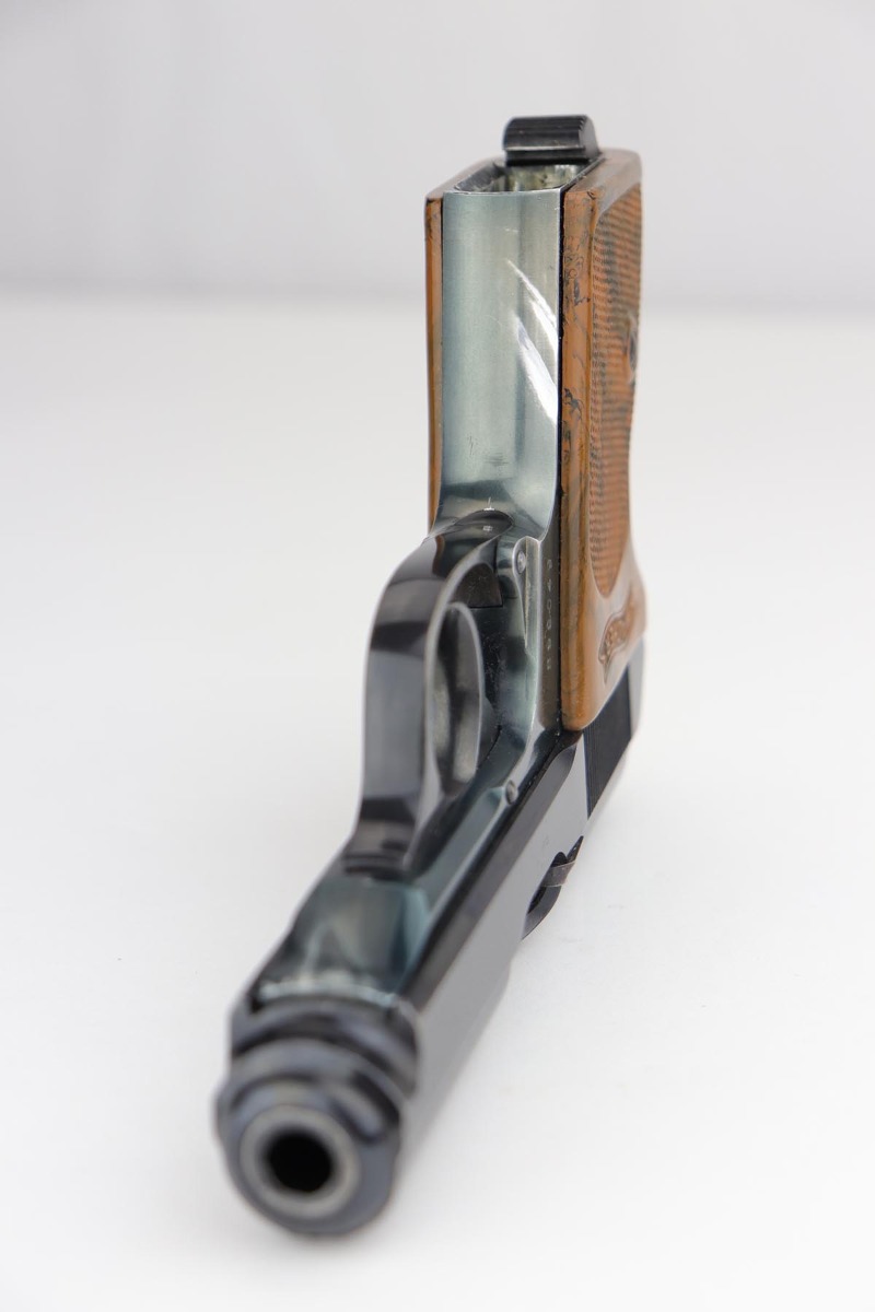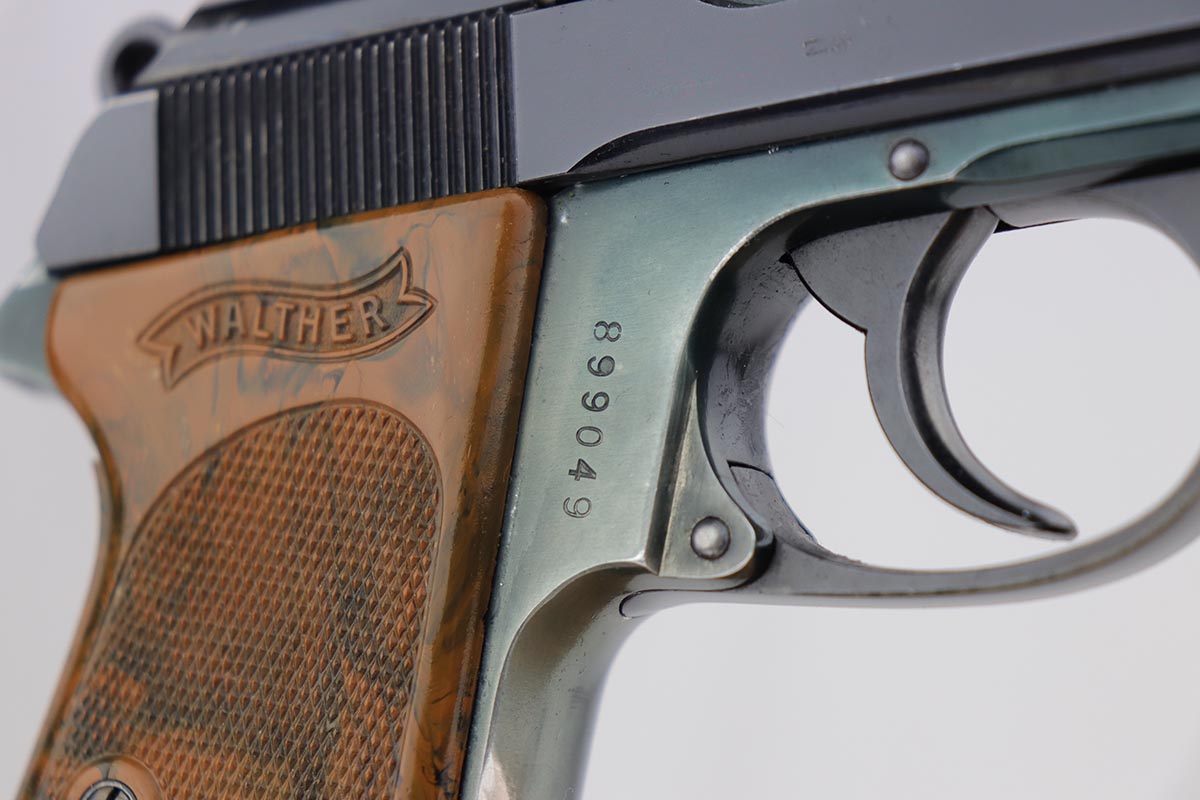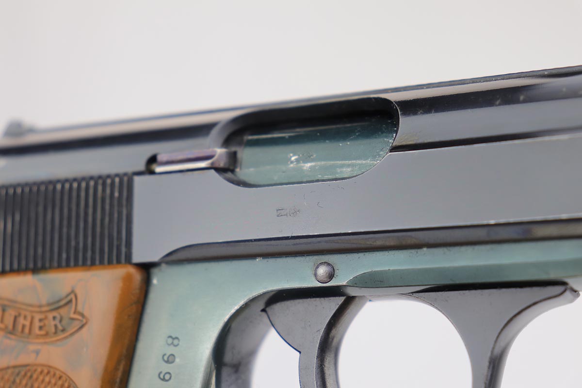 9/17/19 – This is a very tough to find PDM marked Walther PPK, as we only get about one or two per year. The PDM’s were issued to the Police Dept. of Munich, under the direction of Heinrich Himmler. It has a number of rare features such as the aluminum frame (dural), bottom release magazine and a fluted barrel. The original finish is about 92-94% with minor wear on both sides of the slide, and an area of finish loss on the front strap. Mint bore. Grip has no major cracks and the finger extension is excellent.