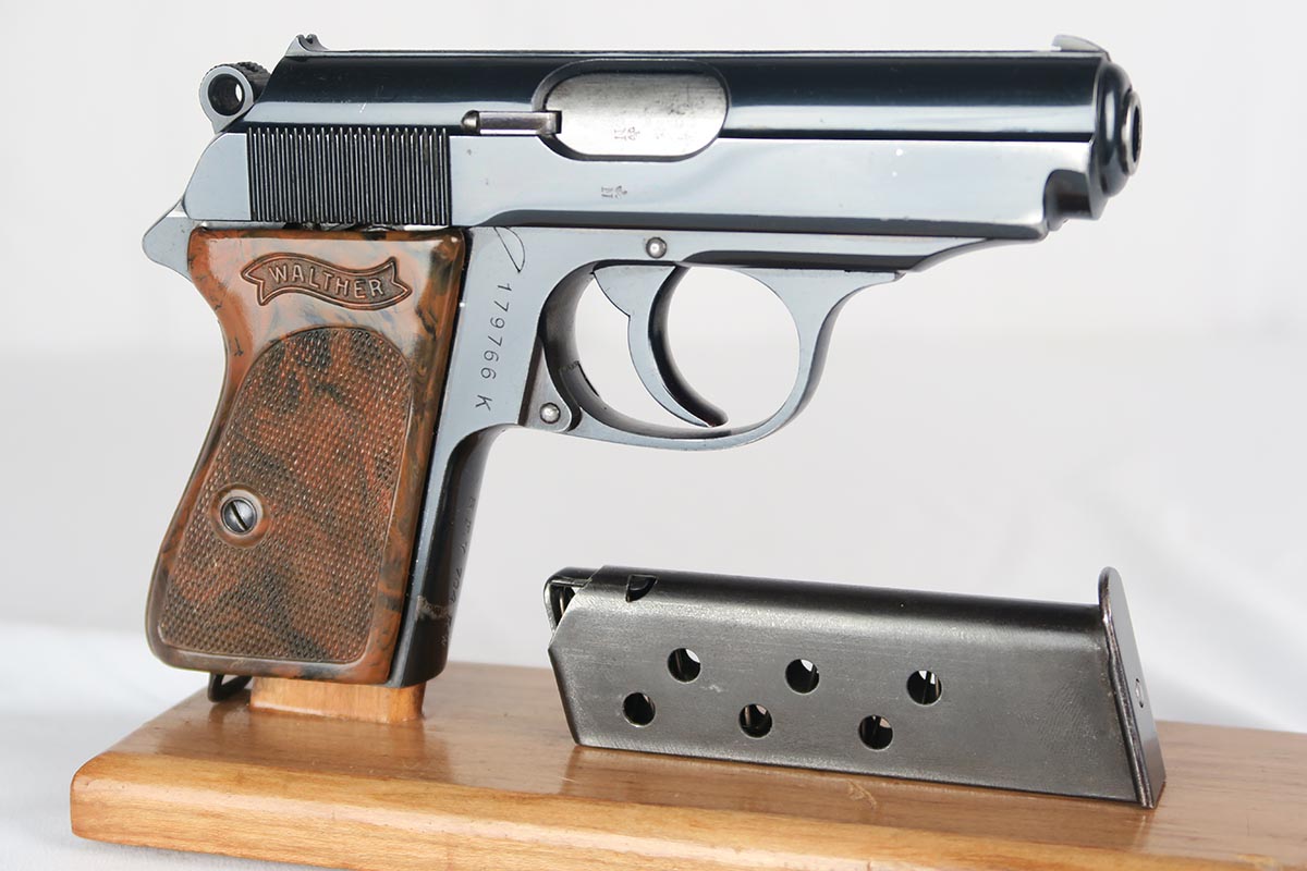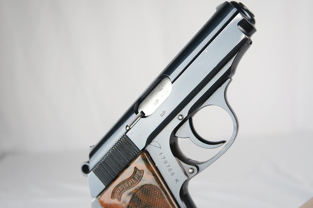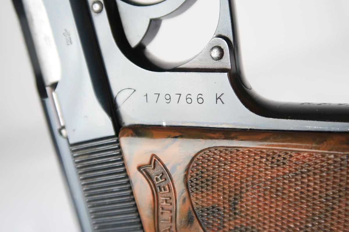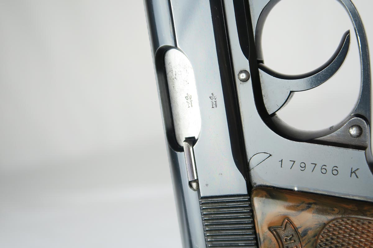 2/15/18 – This is a rare RFV (Reichs Finance Ministry) Walther PPK. These RFV PPK’s are extremely rare as only a few hundred were made (far more of them were made as PP’s). This pistol is in the correct serial range and guaranteed to be authentic. It is in very good condition with the original finish around 93-94%. The left side slide shows some surface pinpricking in multiple small areas, as does the front strap. It is marked R.F.V 704 KW on the front strap. The bore is excellent with strong lands and grooves. It comes with a correct Walther magazine.  Very nice grip with no chips or cracks.