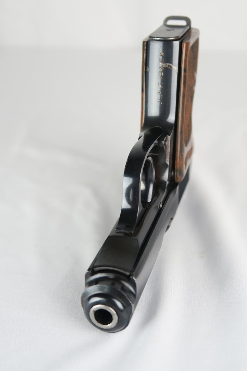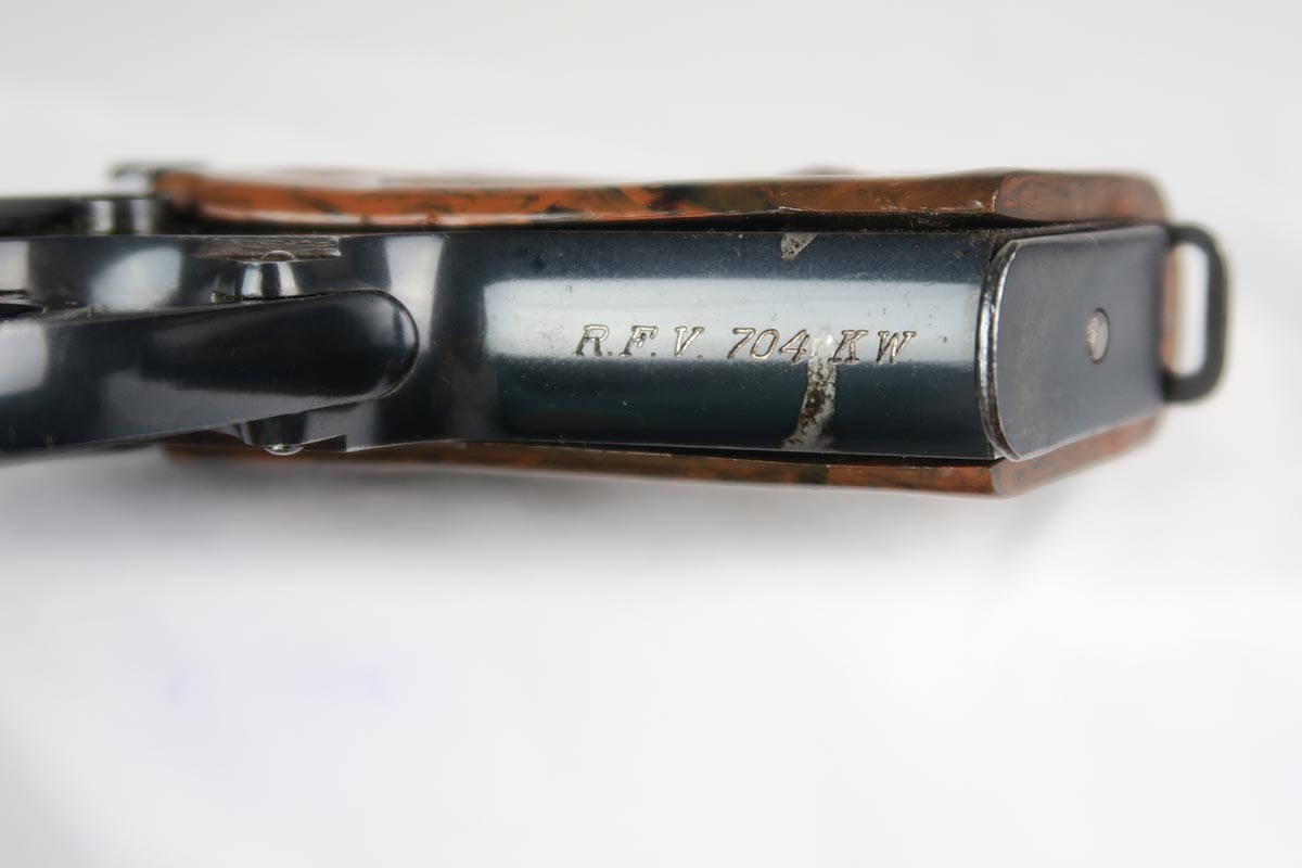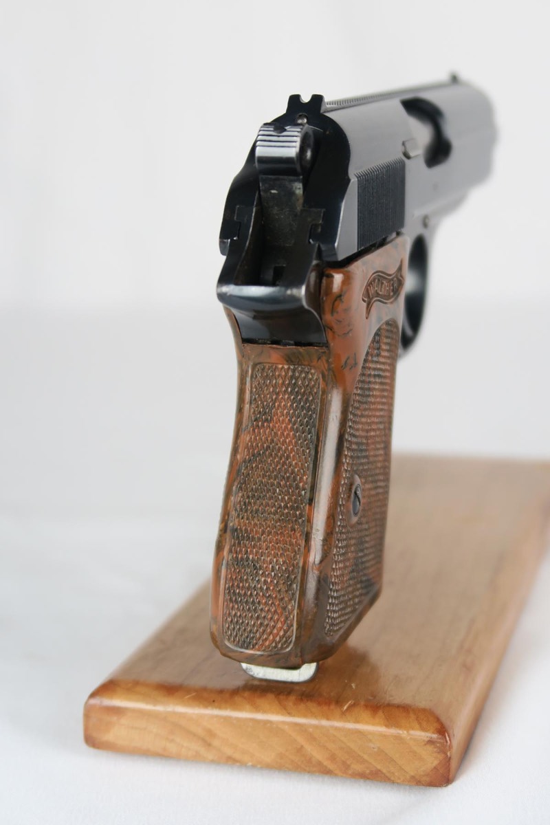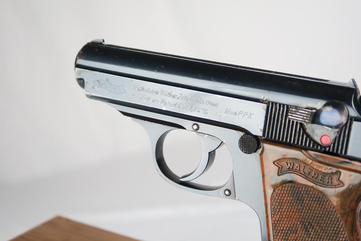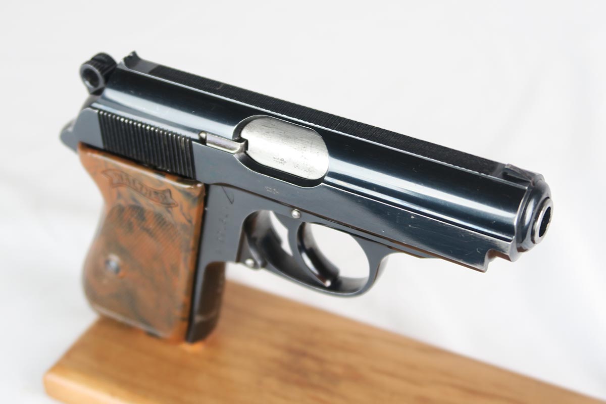 2/15/18 – This is a rare RFV (Reichs Finance Ministry) Walther PPK. These RFV PPK’s are extremely rare as only a few hundred were made (far more of them were made as PP’s). This pistol is in the correct serial range and guaranteed to be authentic. It is in very good condition with the original finish around 93-94%. The left side slide shows some surface pinpricking in multiple small areas, as does the front strap. It is marked R.F.V 704 KW on the front strap. The bore is excellent with strong lands and grooves. It comes with a correct Walther magazine.  Very nice grip with no chips or cracks.