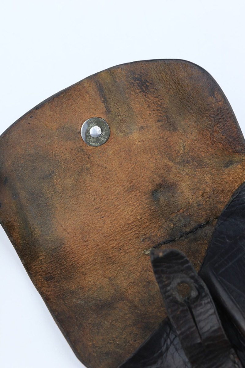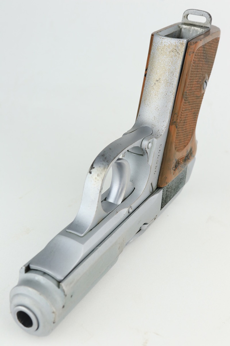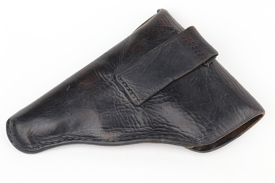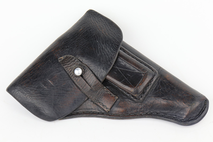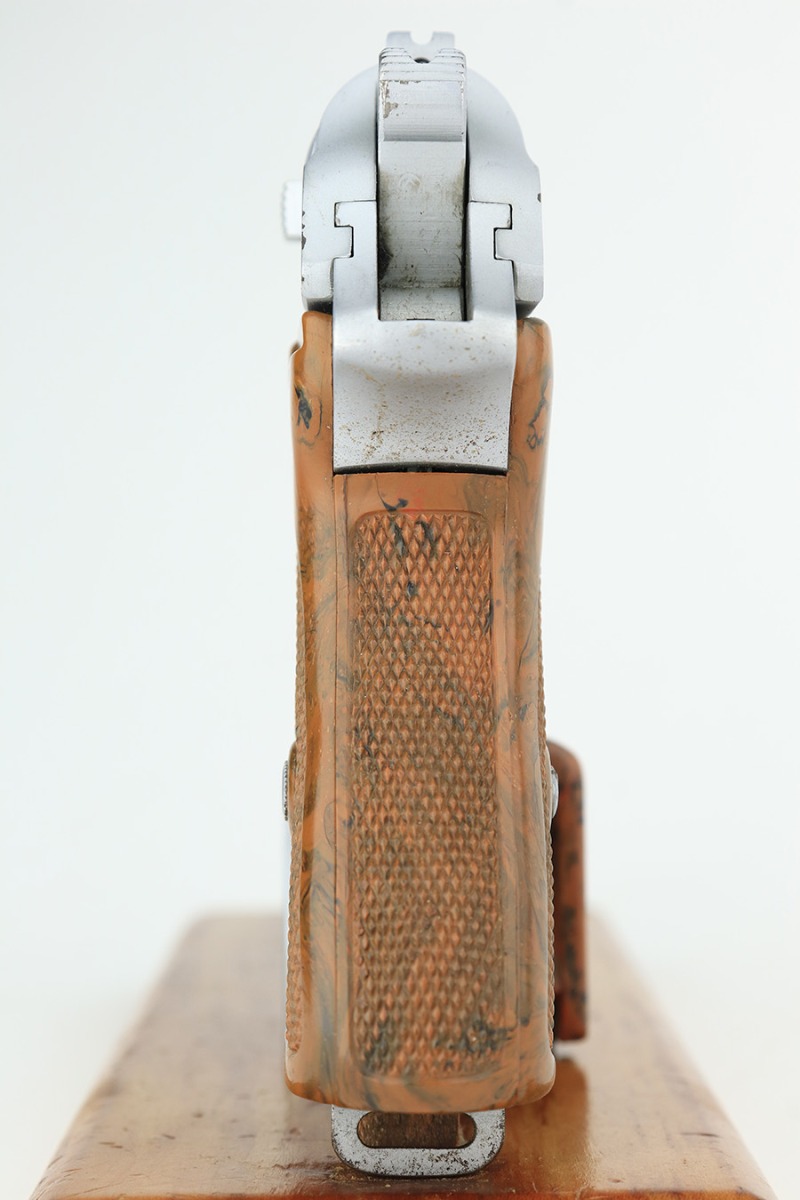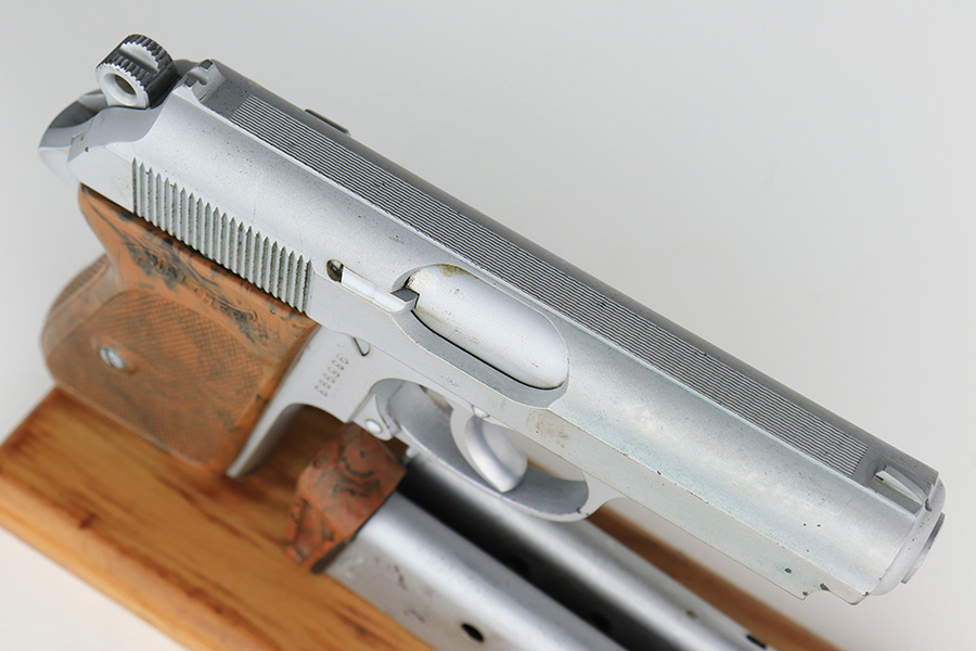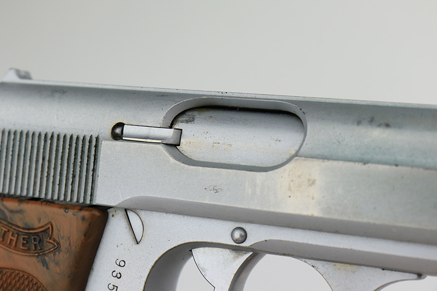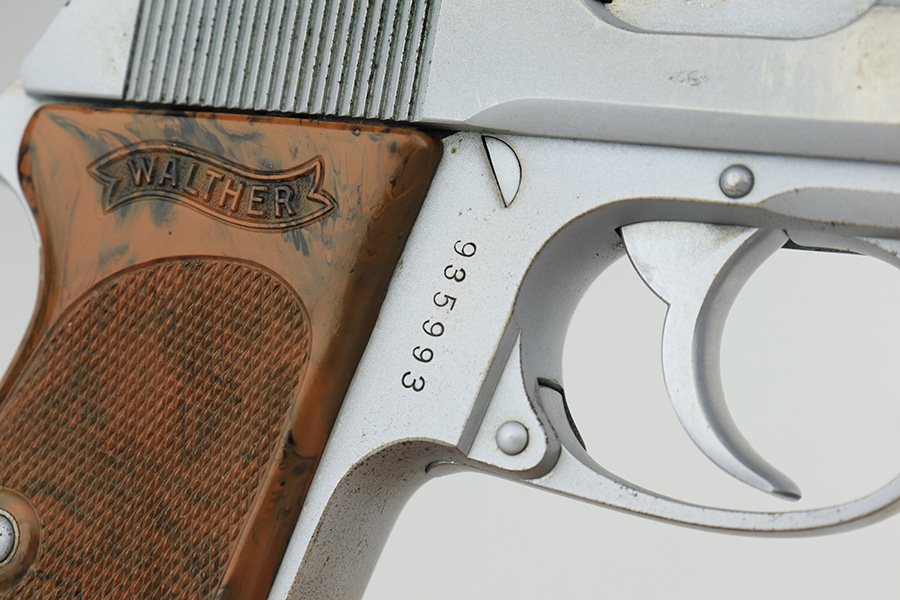 2/15/23 – This is a rare Verchromt Walther PPK in very good, original condition that retains about 90-92% of its original finish. Very few PPKs were finished in “verchromt”, which was Walther’s experiment in producing a variation of the plated finish – essentially a type of electrolysis plating that gave the gun a dull gray appearance. Unfortunately, it proved to be less durable than the standard blue finish and very few such guns were made in the early 30s. There is minor flaking of the finish on this pistol in a few areas, and visible oxidation on the front strap. Comes with one Verchromt magazine with beautiful finger extension, one flat bottom Verchromt magazine, and a black leather holster. The verchromt mags are very difficult to find, and both are in good shape. Minty bore. Excellent brown grip with no cracks.