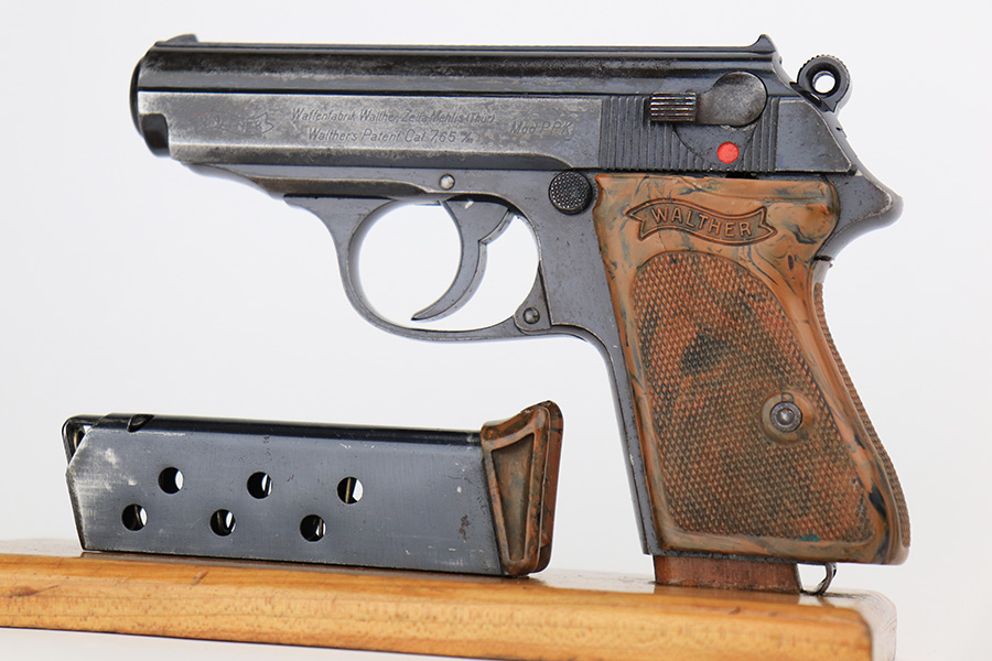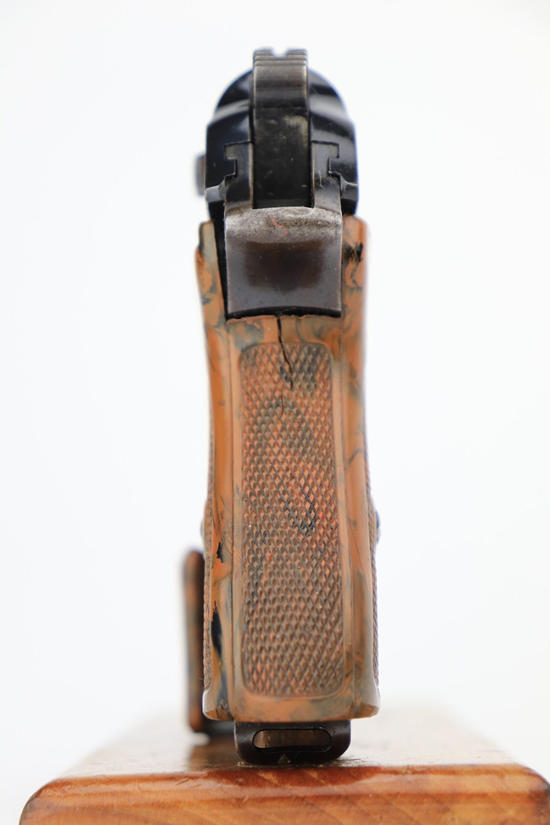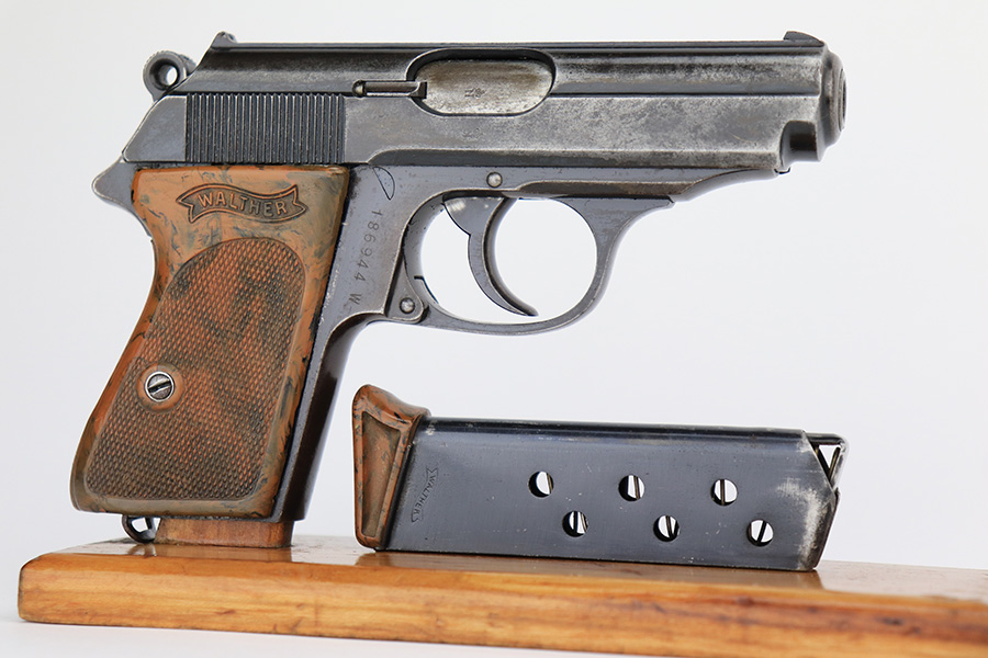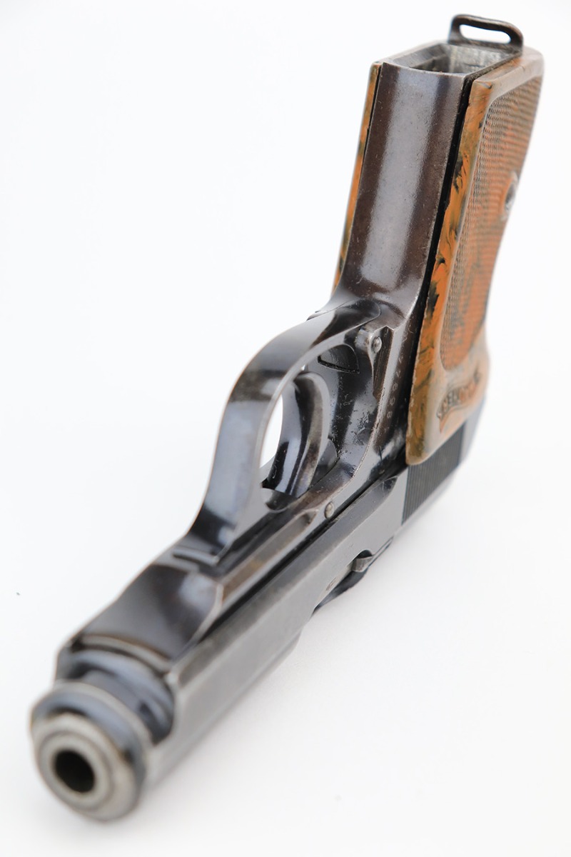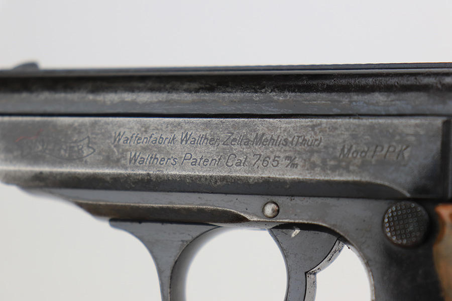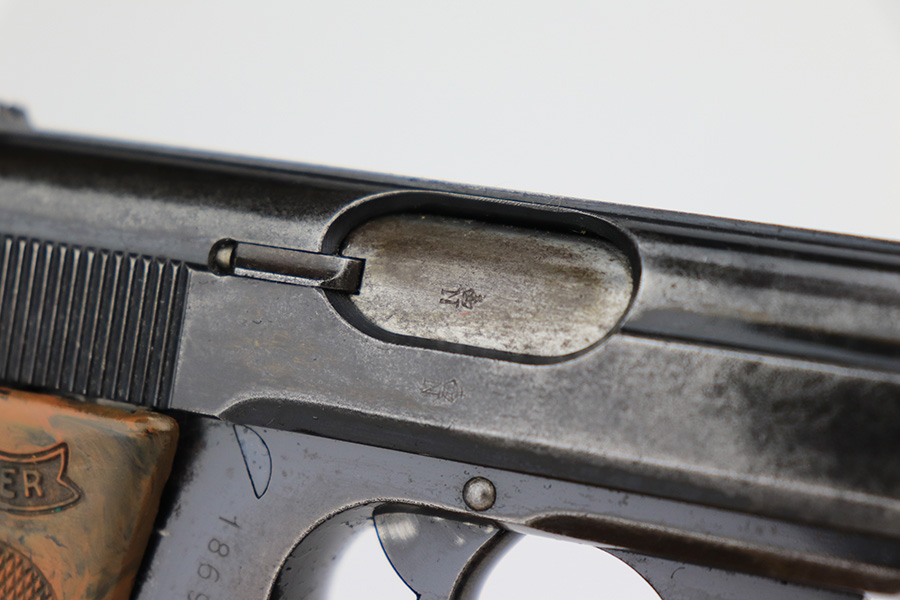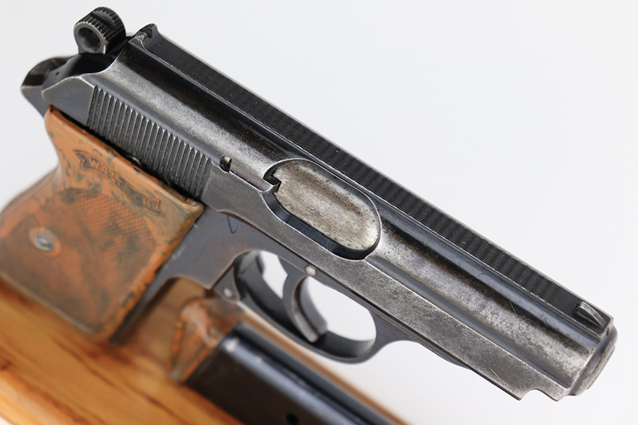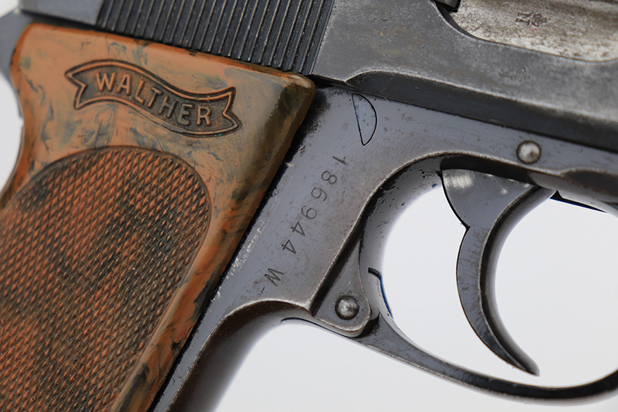 5/12/23 – This is a rare “W-suffix” Walther PPK manufactured in 1939. It is all matching and has the proper “Crown N” proofs. There’s very limited knowledge on this variation of PPK, so we aren’t sure the significance. Definitely an interesting wartime commercial production piece. It has retained roughly 75% of its original finish with obvious wear along both sides of the slide. There is also noticeable spotty oxidation throughout. Fitted with a brown Walther grip – some minor warping on the top edges and a crack in the spine. Comes with a finger extension magazine that has a chip in the front of the bakelite bottom. The bore has good rifling with light frosting in the grooves.