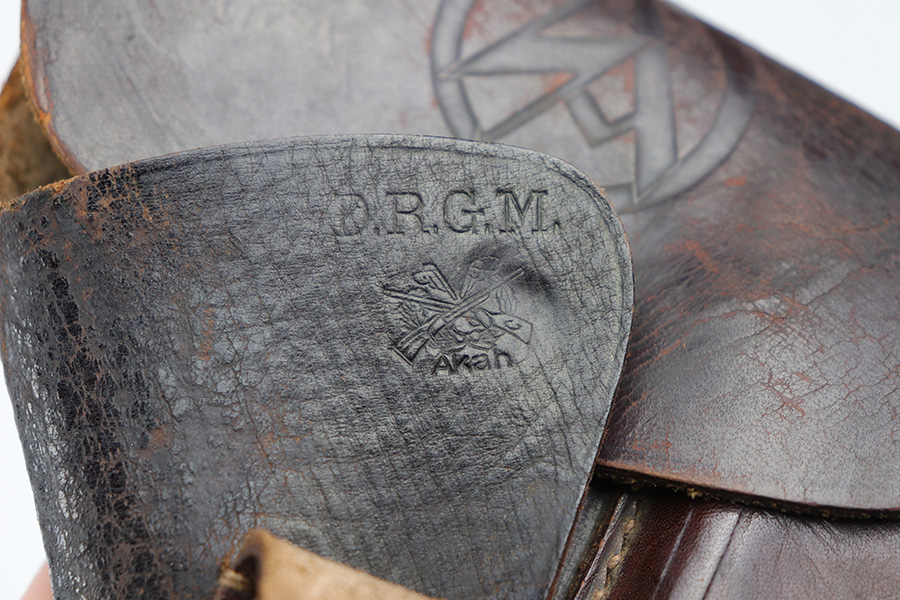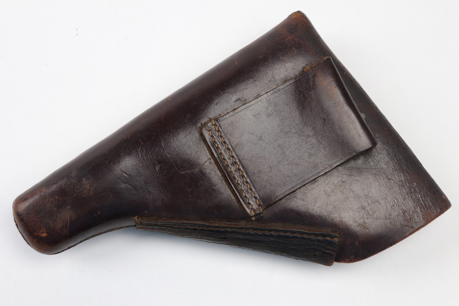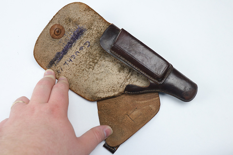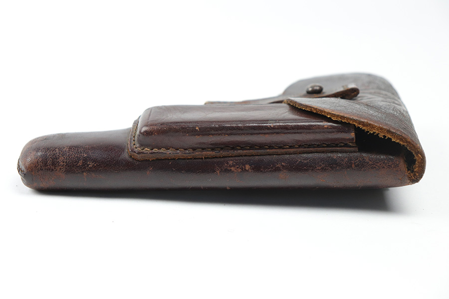 8/26/2021 – This holster is a good example of an SA-issued chocolate brown leather holster for a Walther PP. The SA marking is crisp and visible. The Walther ink stamp is visible but hard to make out. DRGM/AKAH stamp is fairly clean and still visible. There is a bit of cracking on the top flap and some wear around the edges.
