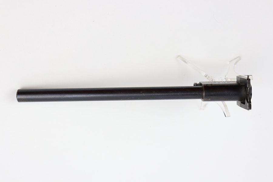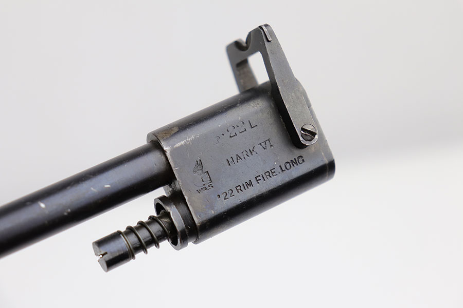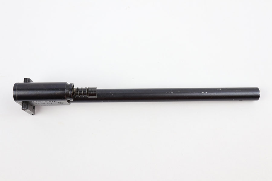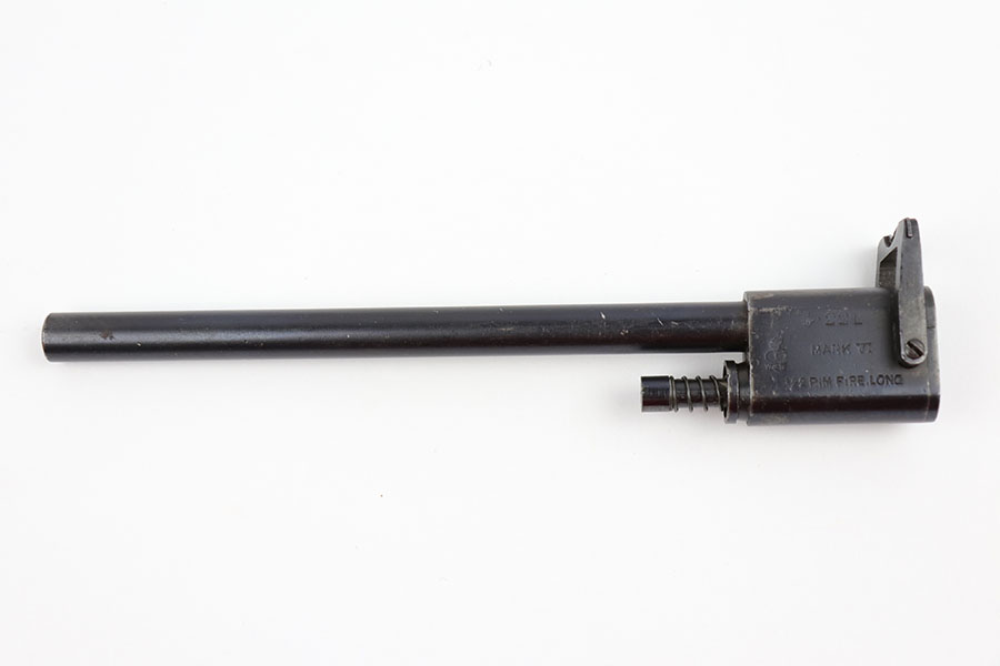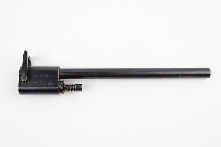 8/29/19 – This is a Webley mark IV .455 conversion “kit” which is more like an insert for the .455 revolver to make it fire .22 LR. This .22 barrel slides into the existing .455 barrel and the cylinder is removed, allowing for single-fire .22 caliber long rifle bullets. WW1 era production and in great overall condition. See final “photo” for a link to a video showing how the conversion works. A very scarce item, and in great overall condition. Bore has nice rifling but some residue / wear, 8/10 overall.